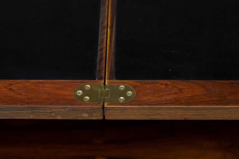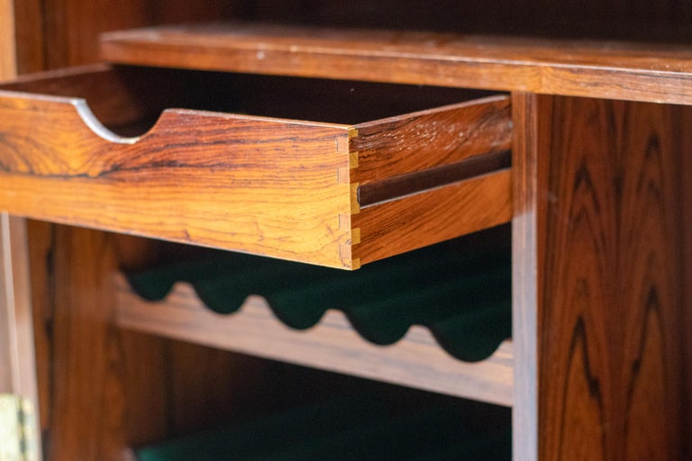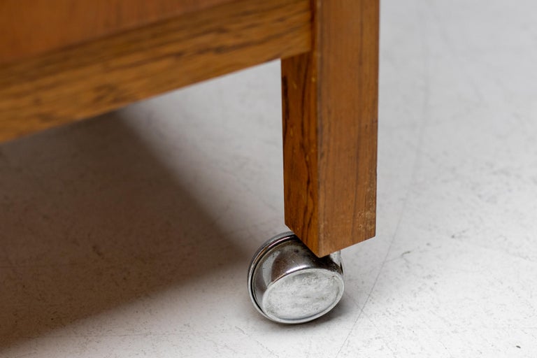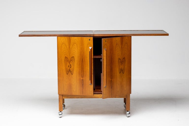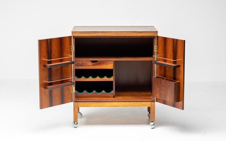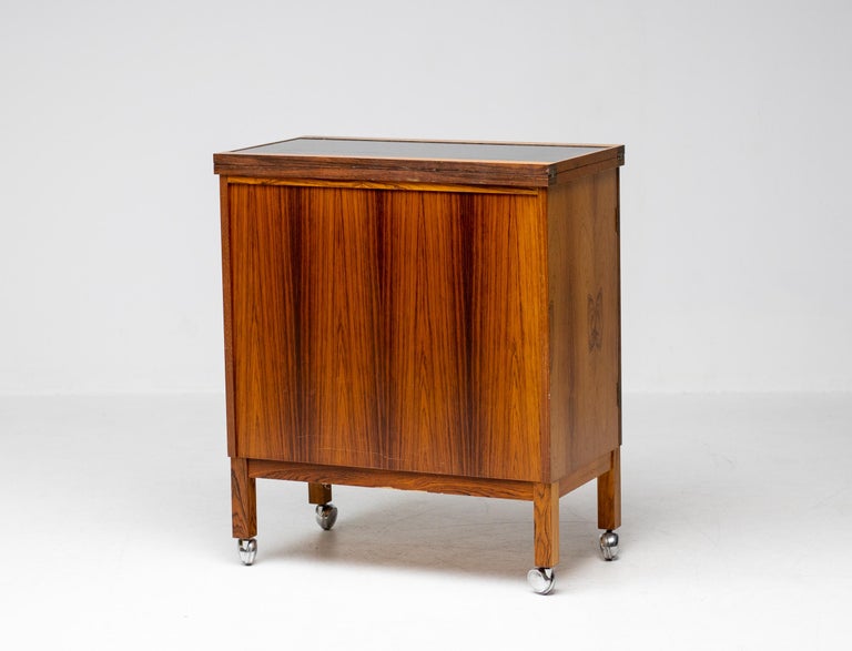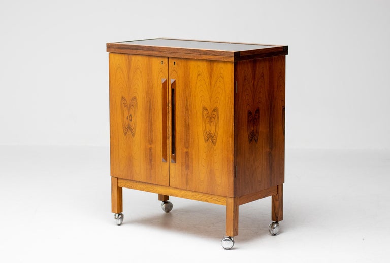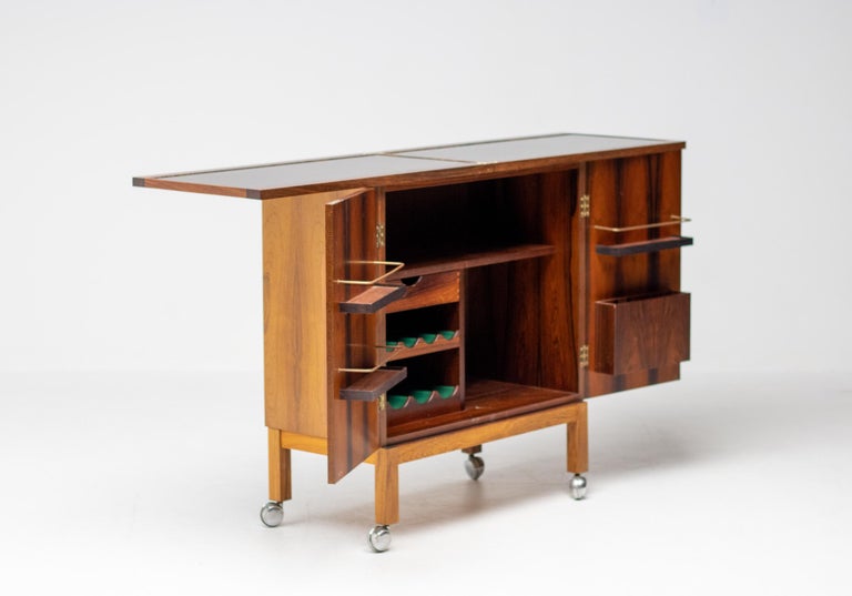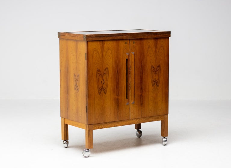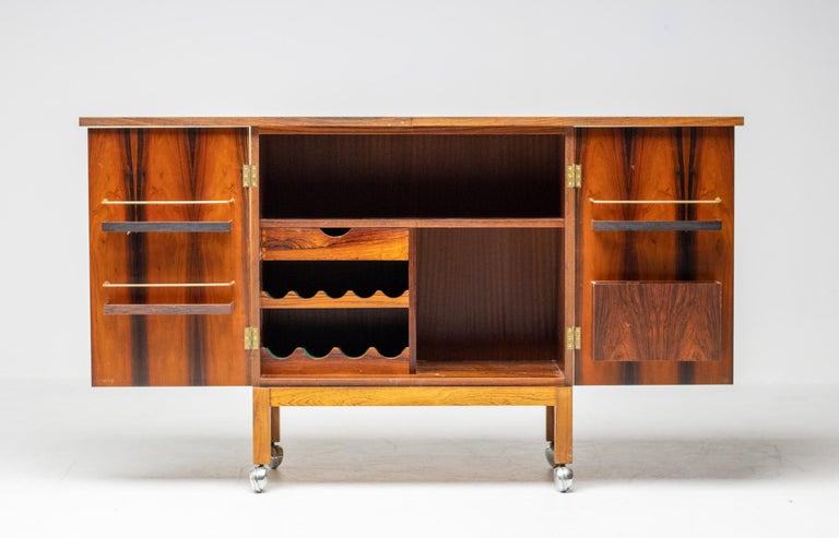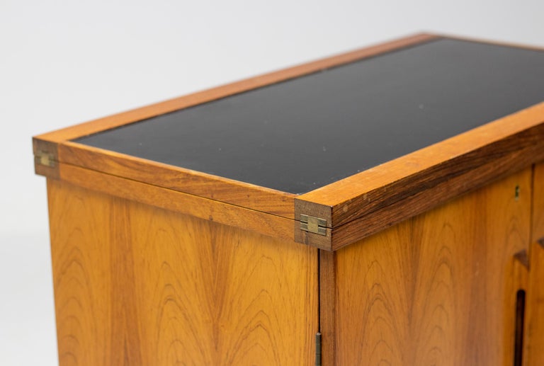 Rare and practical bar cabinet model Times designed by Torbjørn Afdal and produced by Mellemstrands Møbelfabrik in Norway. Exceptional piece in beautiful all original condition. Torbjørn Afdal was a Norwegian furniture designer who was born in 1917 and passed away in 1999. He is known for his minimalist and functional designs that were influenced by Scandinavian design principles. Afdal’s work can be characterized by its use of natural materials, simple lines, and attention to detail. He was particularly well-known for his iconic “Kroken” chair, which was awarded the gold medal at the Milan Triennale in 1954. Afdal’s designs are still highly sought after today. Mellemstrands Mobelfabrik is a Norwegian furniture company that has been in operation for over a century. Founded in 1911, the company specializes in producing high-quality wooden furniture that is designed and manufactured in Norway. Their products are known for their durability, functionality, and timeless design.
