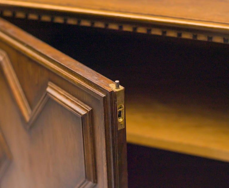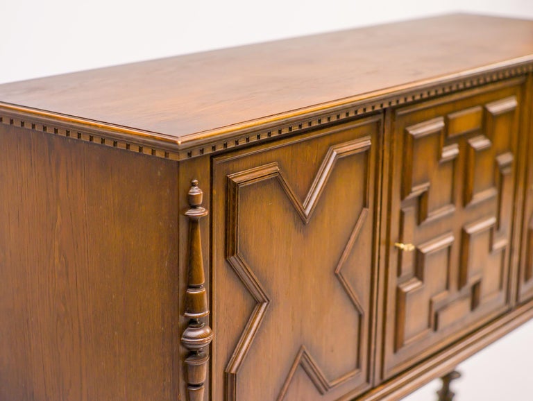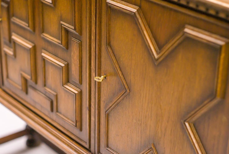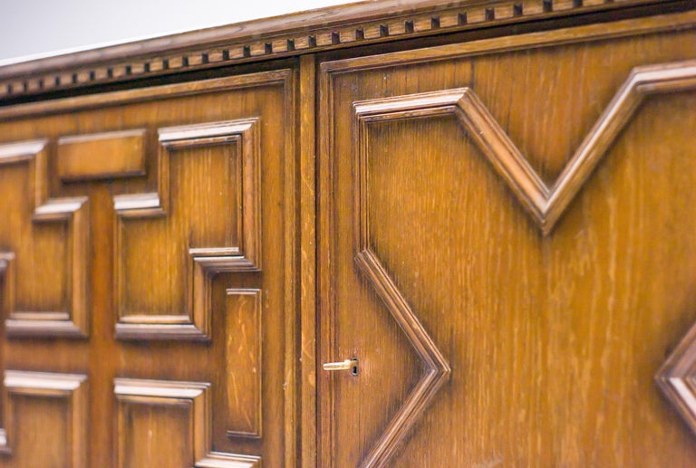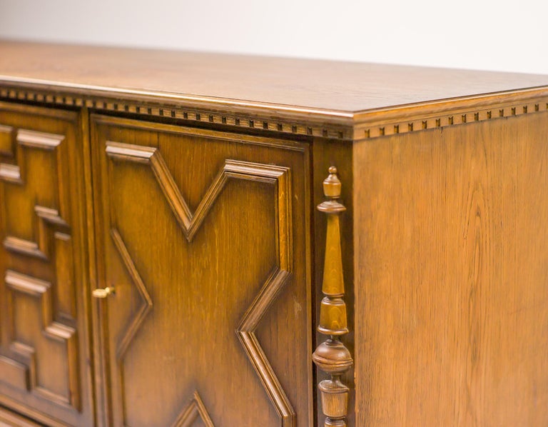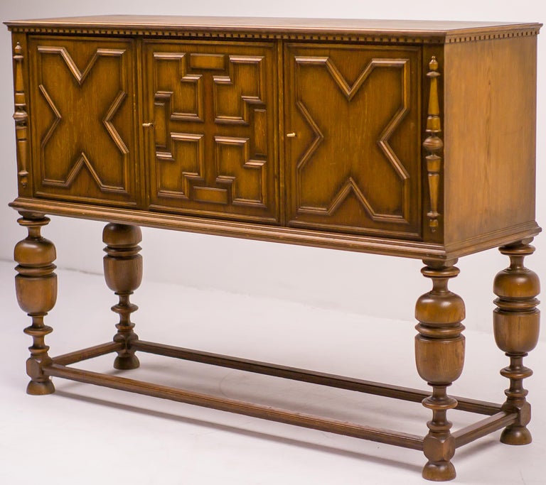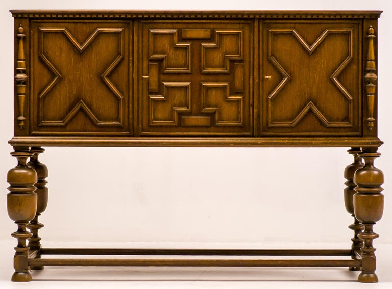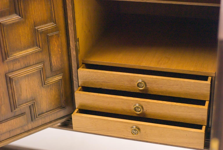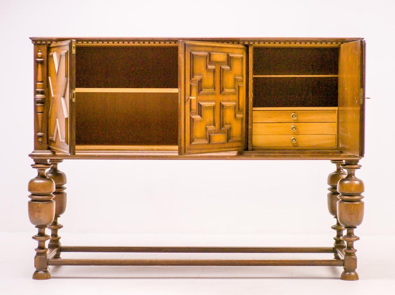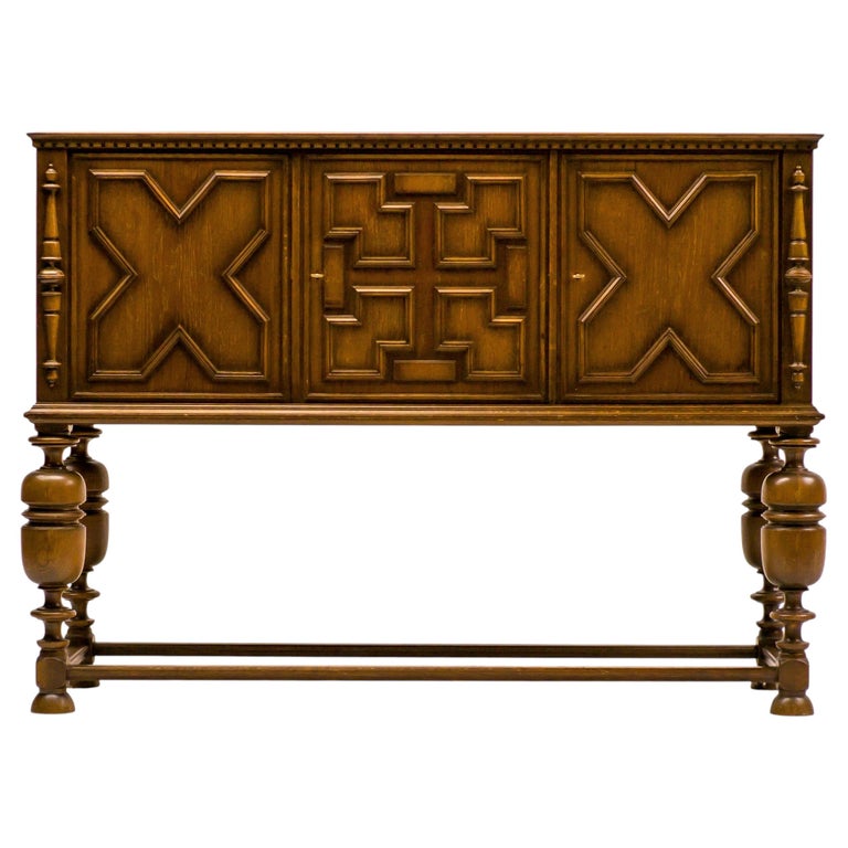 A defining work of Swedish Grace and early functionalism, this “Roma” cabinet by Axel Einar Hjorth for Nordiska Kompaniet is a collector’s grail. Manufactured in 1935, it balances monumental presence with thoughtful restraint—large enough to command a room, yet never overwhelming. The exterior is executed in rich, dark stained oak, emphasizing the bold architectural lines and solid joinery Hjorth is celebrated for. Open the doors to reveal a striking contrast: a fully finished light oak interior, bright and meticulously crafted. Behind the two spacious doors lies an exceptionally practical layout—ideal for bar storage, media, linens, or a curated display. Condition & Authenticity: Excellent vintage condition, professionally preserved with light, age-appropriate patina that only enhances its character. This piece is fully documented: bearing the original Nordiska Kompaniet label, factory number, and 1935 production date. Why this piece matters: Few cabinets from this period offer both sculptural gravitas and genuine everyday utility. The “Roma” model rarely appears on the market—especially in such complete, original, and usable condition. Details: · Designer: Axel Einar Hjorth · Manufacturer: Nordiska Kompaniet (NK), Sweden · Year: 1935 · Material: Dark stained oak (exterior), light oak (interior) · Markings: Original NK label, numbered, dated · Condition: Excellent vintage This is not just storage. It is Swedish design history, ready for another century of use.