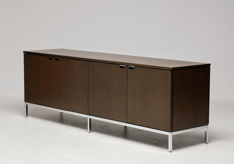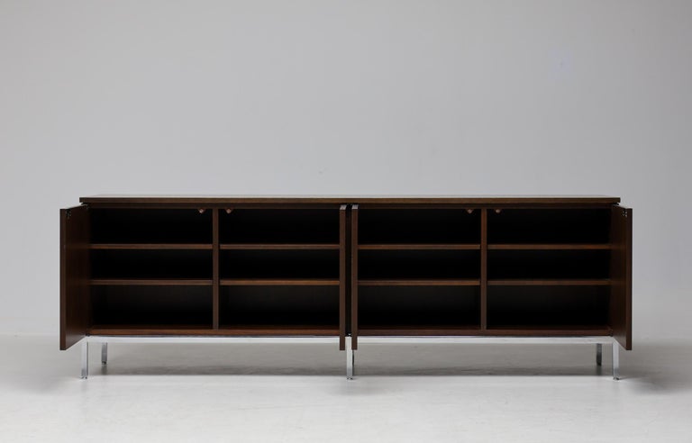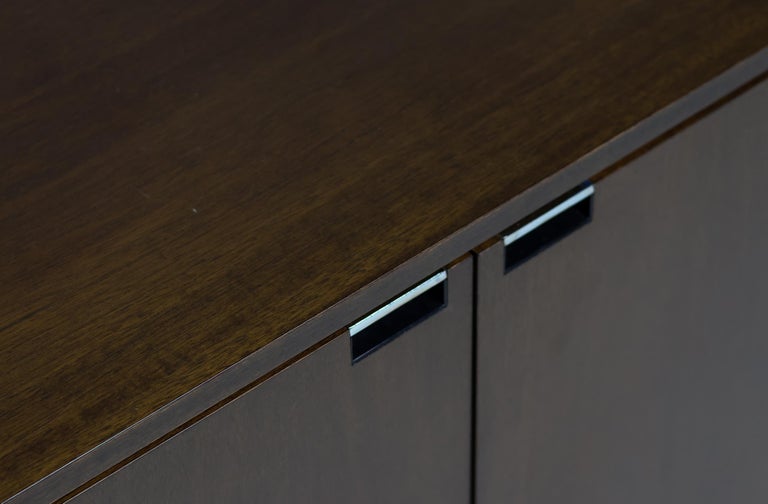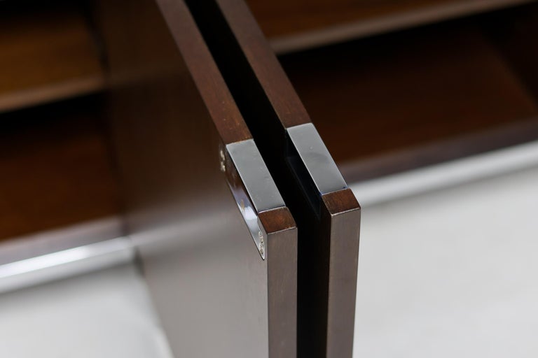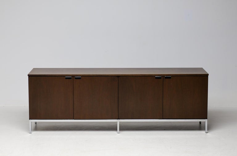 Beautiful Florence Knoll cabinet by Knoll International. The dark European walnut contrasts elegantly with the chromed steel frame and door handles. Ample shelving in matching walnut. Provenance: The office of the ceo of a large multinational in The Netherlands. The matching pair of Florence Knoll leather lounge chairs from the same office is listed separately.