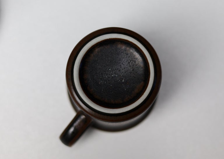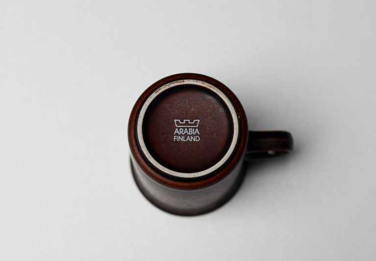The Ritual of Rustic Modernism – Arabia Ruska, Finland, 1970s (24 Pieces) There is pottery that serves, and then there is pottery that grounds you. This complete 24-piece Ruska (Finnish for “autumn foliage”) tea and coffee serveware set by Arabia is a landmark of Nordic ceramic design—earthy, tactile, and unapologetically warm. Designed by the legendary Ulla Procopé in the 1960s and produced through the 1970s, Ruska remains one of Arabia’s most beloved patterns. Its signature brown-glazed stoneware with reactive, almost lava-like texture feels primordial. Each piece bears the subtle variation of handmade soul—no two exactly alike. What’s included (24 pieces total): · 4 coffee cups · 7 tea cups · 11 saucers (fits both cup sizes) · 1 sugar bowl with lid · 1 creamer All pieces are in excellent vintage condition—no cracks, no restorations. Minor, honest wear consistent with careful use (a few light utensil marks on saucers). The glaze remains deep, glossy, and rich. Complete Ruska sets of this size are increasingly rare. Most were broken up over decades. This one survived intact—ready for Sunday morning coffee, Midsummer tea, or display in a glass-fronted cabinet next to Alvar Aalto and Hans Wegner.