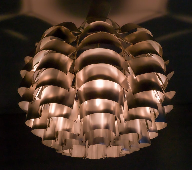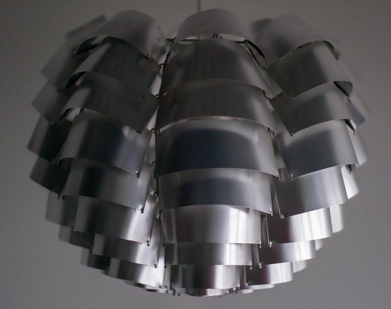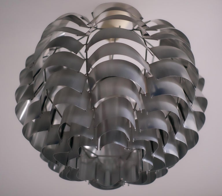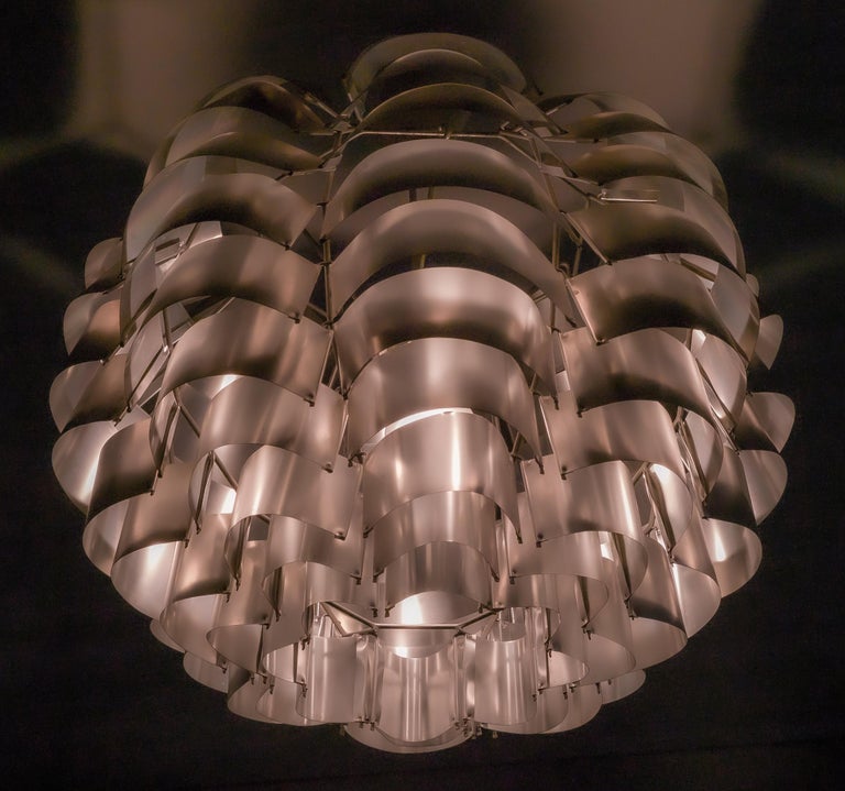 The Max Sauze Orion chandelier is a striking and elegant piece of lighting design. Designed by Max Sauze, a French sculptor, designer and architect, the chandelier features a unique and modern design that is both bold and subtle at the same time. The chandelier is made of a combination of thin metal rods and aluminum foil. The Orion chandelier was presented at the 1967 ‘Salon des artistes et decorateurs’ in Paris. The Max Sauze Orion chandelier is a true work of art, that is not only functional but also aesthetically pleasing. The chandelier emits a soft and warm light that creates a cozy and inviting atmosphere. The chandelier is perfect for use in any room of the house, and can be used to create a focal point in a room or to add a touch of elegance and sophistication to a space. The Max Sauze Orion chandelier is a striking and elegant piece of lighting design that is sure to make a statement in any room. Its modern and fluid design makes it a piece that is both functional and beautiful. This beautiful original 1960’s example is in excellent all original vintage condition.