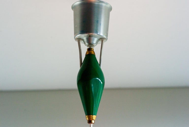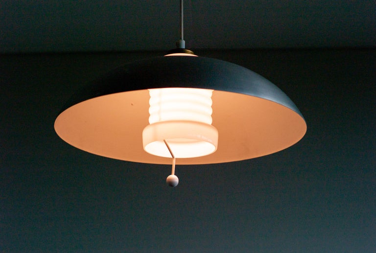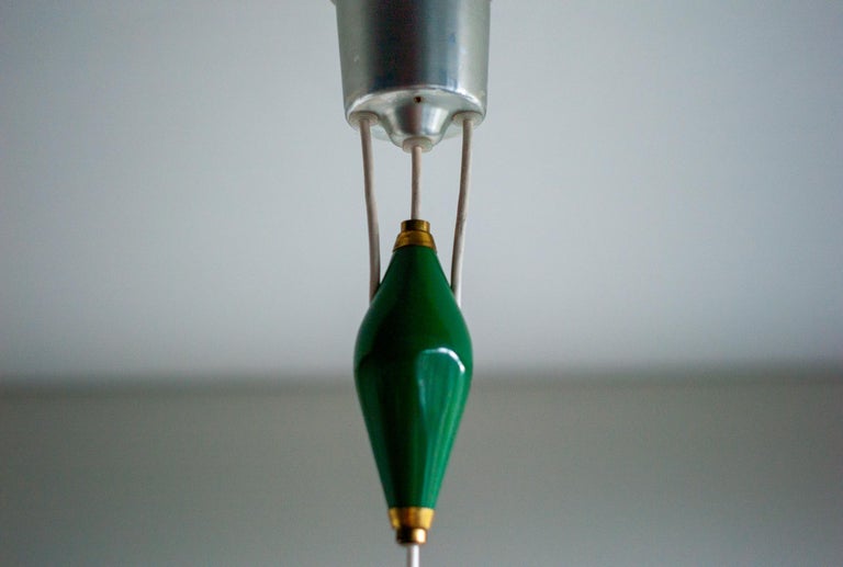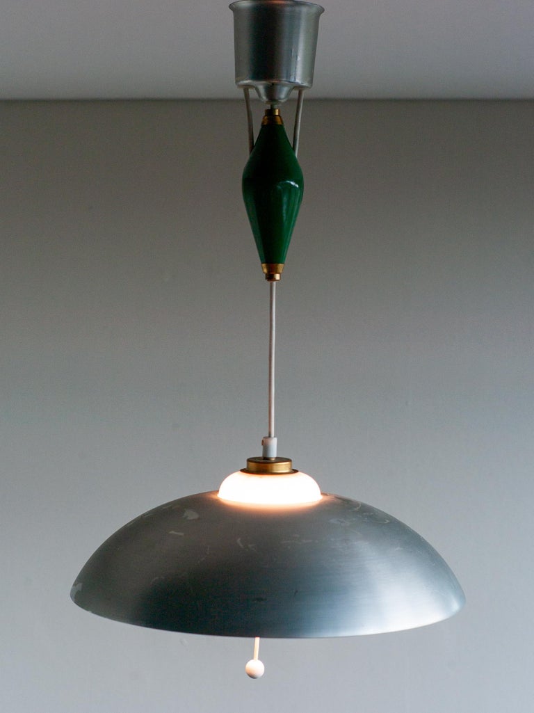 A refined example of Scandinavian modern lighting, this counterbalance pendant lamp was produced in Sweden in the 1950s by Nordiska Kompaniet (NK), one of the most influential design institutions of the period. The lamp exemplifies the functional elegance and material honesty that define mid-century Swedish design. The adjustable counterbalance mechanism is crafted in green porcelain, offering a subtle yet distinctive contrast to the aluminum shade. The shade features a white-painted interior to enhance light reflection, while the exterior is left unfinished, emphasizing the lamp’s utilitarian character and understated aesthetic. This considered combination of materials reflects NK’s focus on both visual restraint and practical performance. The counterbalance system allows the height of the shade to be adjusted with ease, making the lamp well suited for use above a dining table, workspace, or reading area. When illuminated, it provides a focused, warm light with excellent downward diffusion. A timeless and authentic mid-century piece, ideal for collectors and interior designers seeking original Scandinavian lighting from a renowned Swedish manufacturer. Origin: Sweden Manufacturer: Nordiska Kompaniet (NK) Period: 1950s Materials: Green porcelain counterweight, aluminum shade with white-painted interior and unfinished exterior Condition: Good vintage condition with light wear consistent with age and use