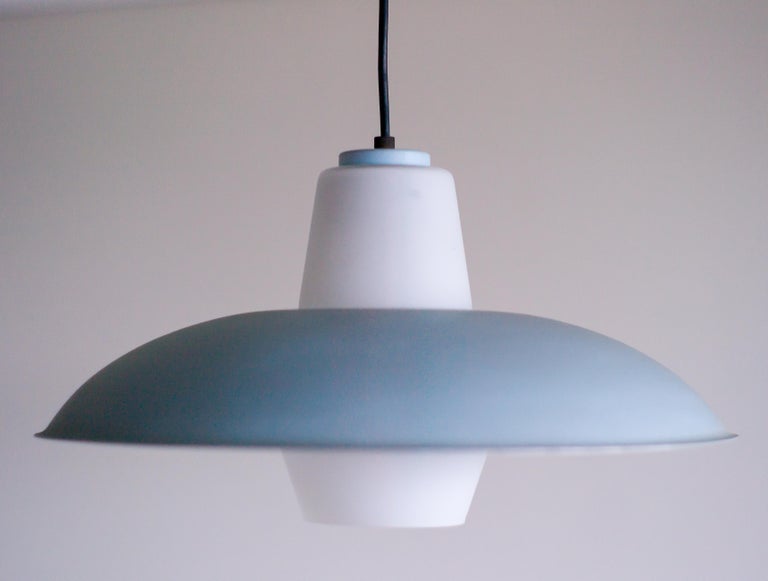 Wonderful Mid-Century Modern Dutch frosted glass pendant with light blue and dark blue enameled aluminum shades designed by Louis Kalff for Philips, The Netherlands, circa 1956. Louis Kalff (1897-1976) was a visionary Dutch designer known for his pioneering contributions to industrial design during the mid-20th century. With a background in electrical engineering and a keen eye for aesthetics, Kalff left an indelible mark on the world of lighting and furniture design. He worked for the iconic Dutch lighting company Philips and played a pivotal role in their design department. Kalff’s designs are characterized by their sleek, minimalist lines and innovative use of materials, exemplifying the principles of modernism. His work continues to inspire contemporary designers, making Louis Kalff a luminary figure in the history of design.