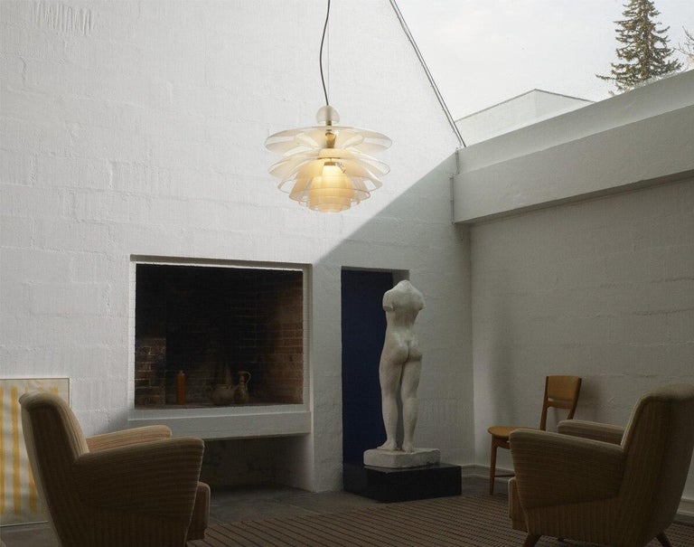 The PH Septima is regarded as one of Poul Henningsen’s most refined pendants. When exhibited for the first time as a prototype at the Danish Museum of Decorative Art (now Designmuseum Danmark) in 1928, the poetic piece was publically applauded. The seven-shade glass crown emits a glare-free, downward directed light, while radiating a pleasantly delicate glow. From shade to shade, frosted glass fields alternately cover the clear ones, thus diffusing the light even more softly. Socket housing and canopy: Satin polished brass, untreated. Please note that the brass surface is untreated, the untreated brass will change over time and develop a patina. Priced per item.