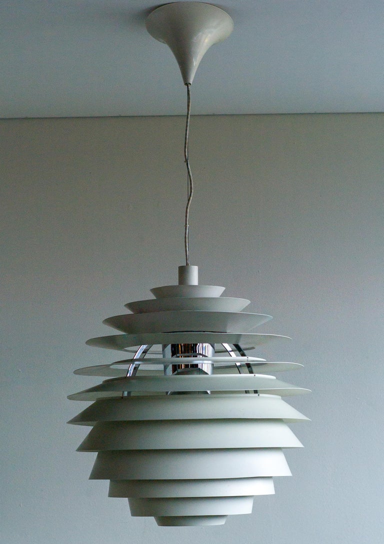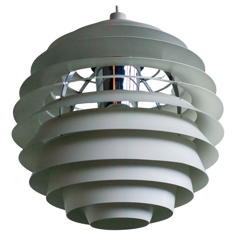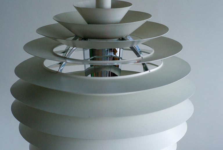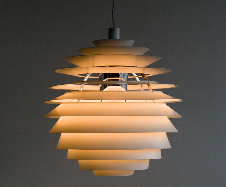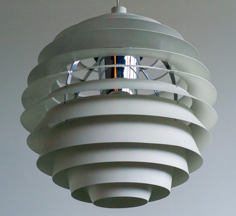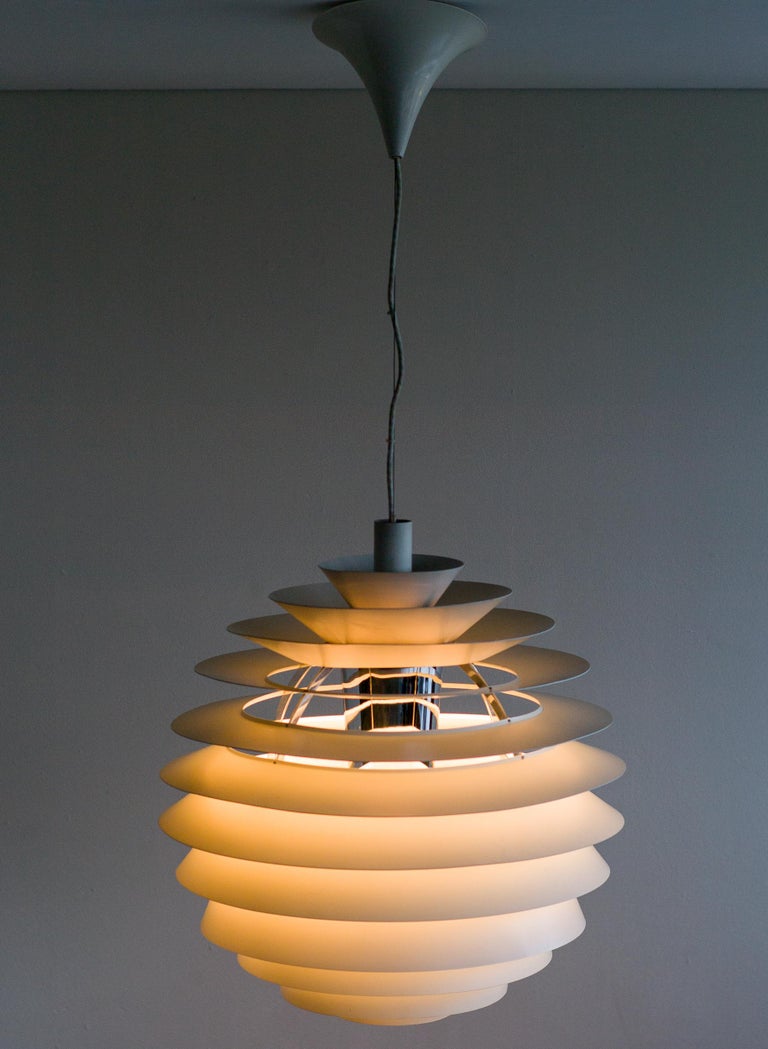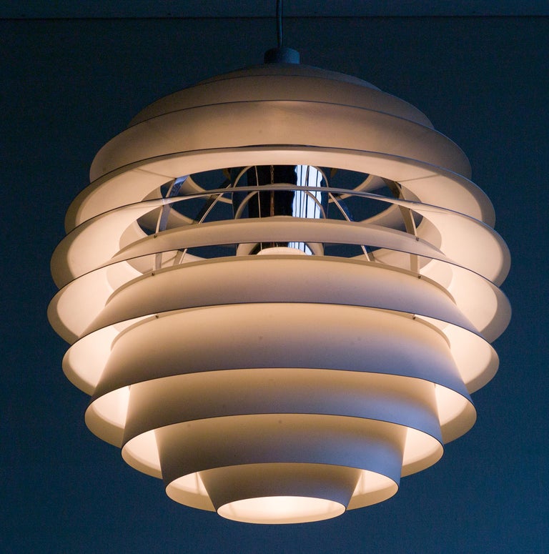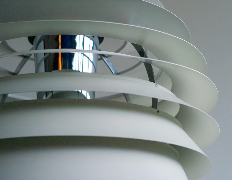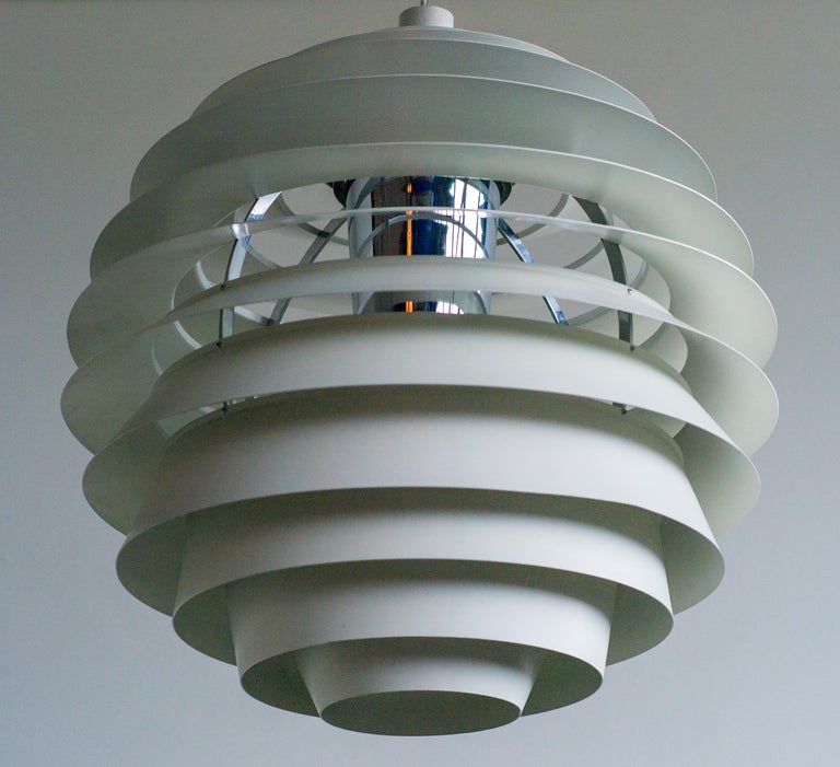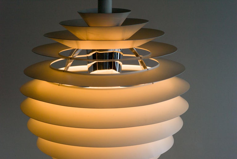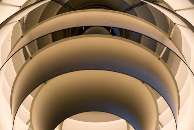 The monumental Louvre pendant was originally designed by Poul Henningsen in 1957 for the Adventist church at Skodsborg Hydro Denmark upon request by the architect Charles Gjerrild who requested Henningsen to design an economic yet decorative pendant. The pendants are newly wired and come with new fabric covered wire (of distinct better quality) from the original manufacturer Louis Poulsen and a new original Louis Poulsen canopy. The funnel-shaped canopy is an important part of the design and is generally missing on vintage examples. Please also note that this pendant is hanging from its original reinforced Louis Poulsen wire. We have two identical vintage 1963 examples in stock, price is per piece. Poul Henningsen’s geometrical, spherical design is based on the principle of illuminating all surfaces at the same angle. This ensures uniform light around the fixture, illuminating both walls and ceiling. Matte painted undersurfaces and glossy top surfaces result in an attractive reflection of the diffused light, creating uniform light distribution around the fixture.