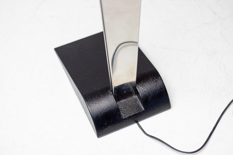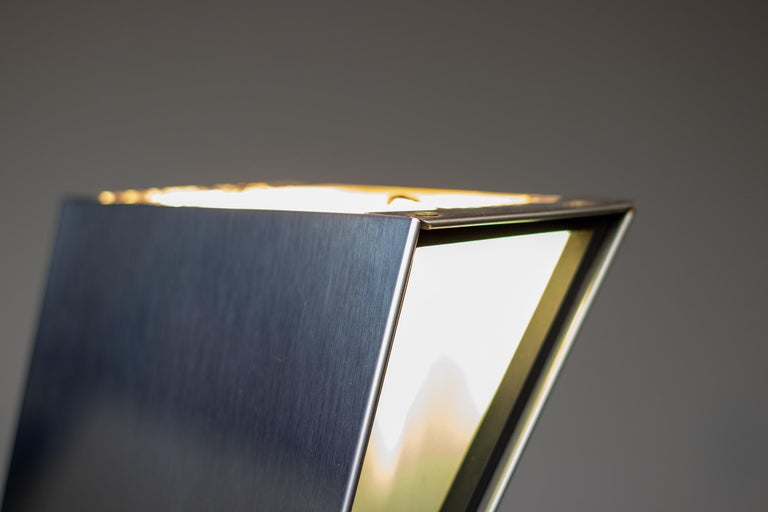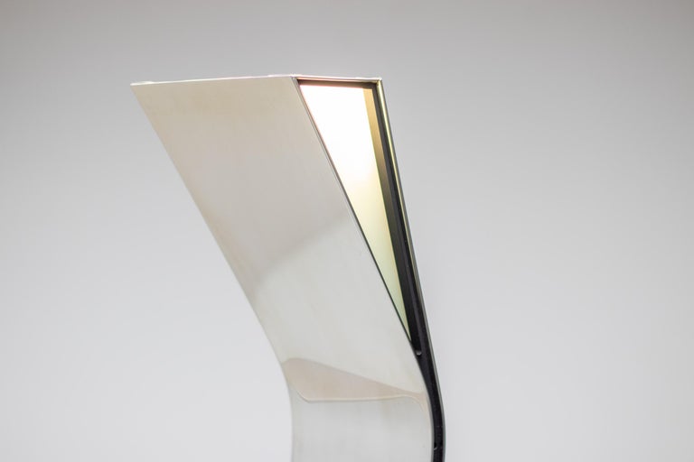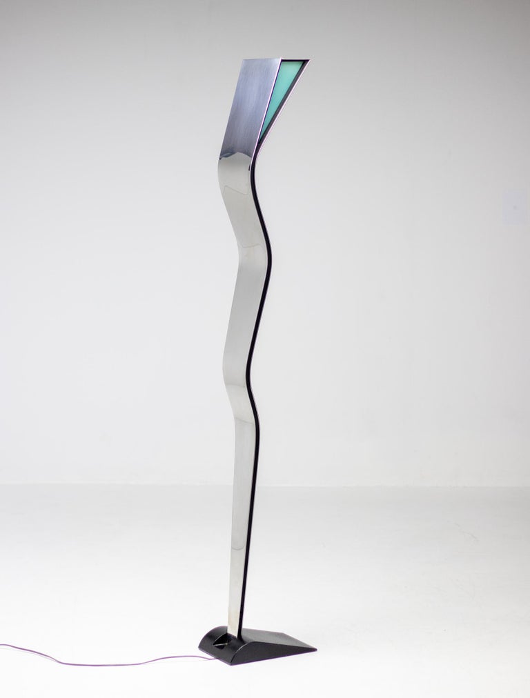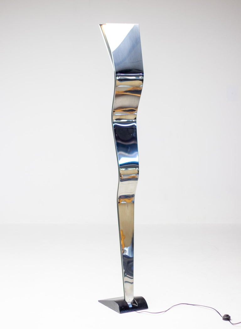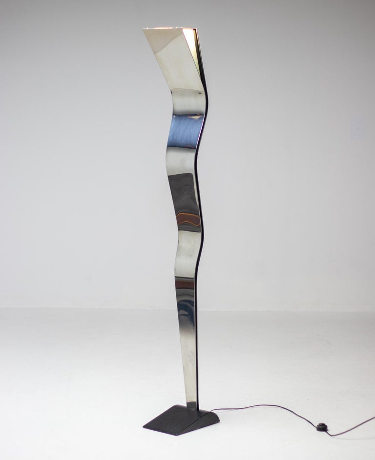 Unique 1970s Italian uplighter made of high gloss polished stainless steel that resembles a standing person from the side and a distorting mirror from the front. Most likely made by Fontana Arte but not marked. The lamp came from an Italian villa decorated with numerous designer pieces from the 1960s and 1970s. Many of those pieces were by Tobia Scarpa and Fontana Arte especially.