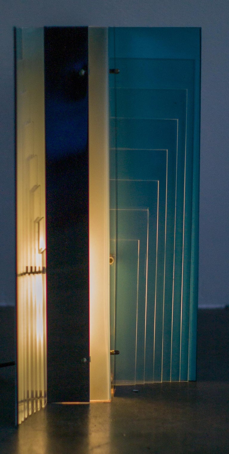A Radical Light Sculpture in Stainless Steel & Solid Methacrylate. In the brief, explosive lifespan of the Roman studio New Lamp (1969–1973), design broke free from the predictable. Under the visionary hands of Fabrizio Cocchia and Gianfranco Fini, lighting became pure sculpture—radical, architectural, and unapologetically avant-garde. This extraordinary design, attributed to Fabrizio Cocchia and Gianfranco Fini, is not a directional task lamp. It is an environmental light sculpture. The 3 light bulbs illuminate the plexiglass creating an atmospheric, shadowless radiance that transforms a sideboard, desk, or credenza into a gallery installation. Unlike mass-produced mid-century lighting, Cocchia and Fini operated at the intersection of Pop Art, Kinetic sculpture, and industrial experimentation. This original 1969 example remains in good vintage condition, exhibiting light patina consistent with age—no structural damage. The wiring may be original; we recommend inspection by a qualified electrician for continued use . Only one available. Ships professionally crated from Europe. A signature is required upon delivery.