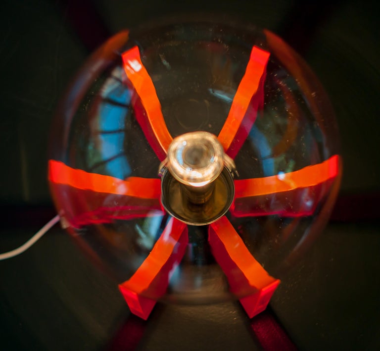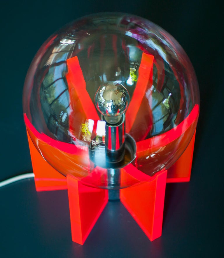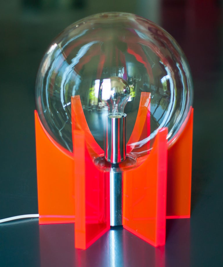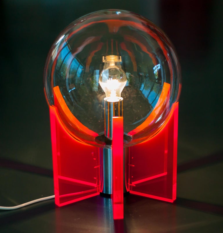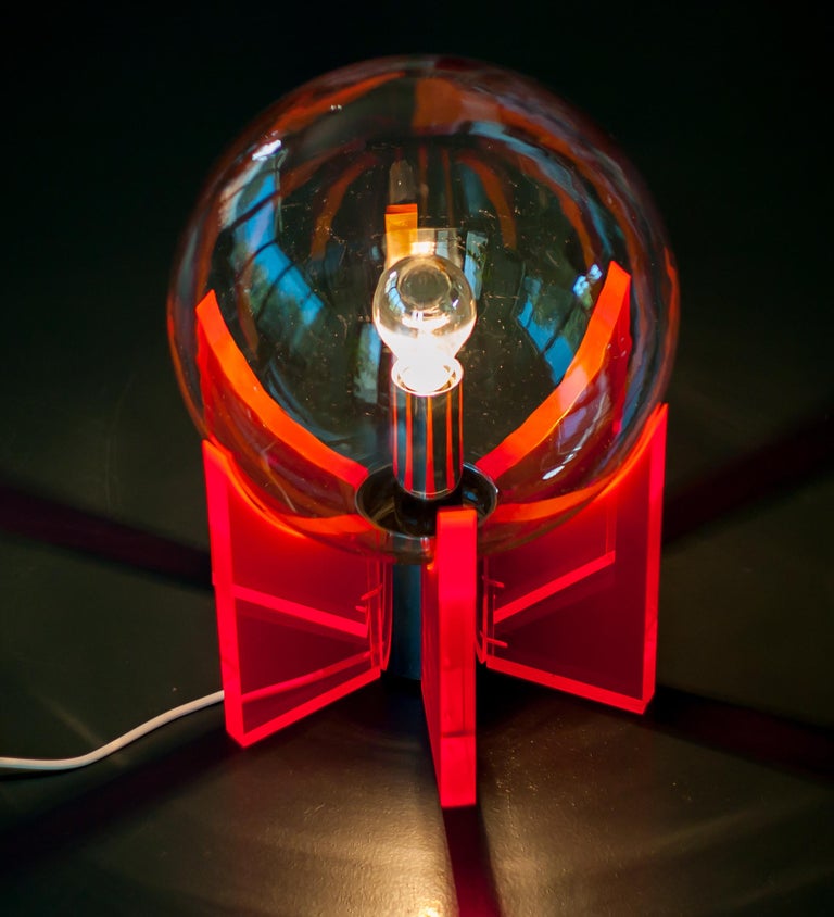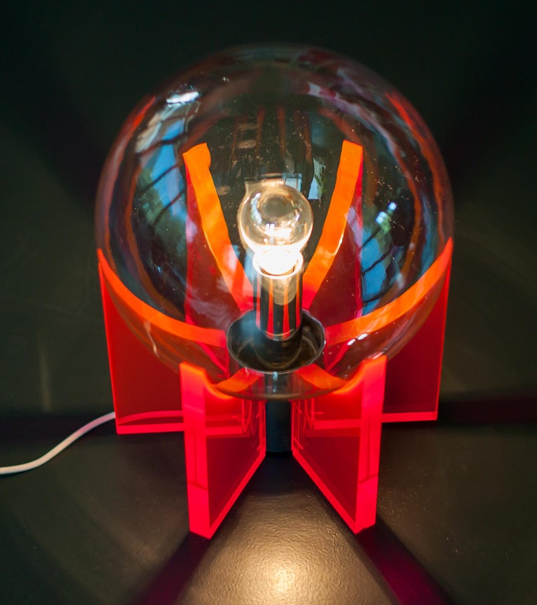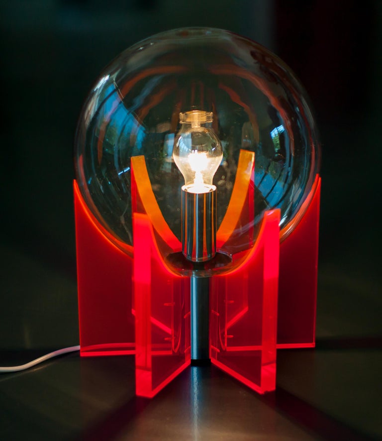 An exceptional and sculptural table or floor lamp, made in Italy circa 1968, distinguished by its bold use of red Lucite and a luminous Murano glass sphere. Produced in a very limited edition, this piece stands as a striking example of late-1960s Italian design, where experimentation with new materials met refined craftsmanship. Reminiscent of Gae Aulenti’s iconic King Sun lamp, the design allows light to be transmitted beautifully through the red acrylic supports, creating depth, warmth, and a dramatic visual effect. The clear Murano glass sphere acts as the focal point, diffusing light softly while contrasting elegantly with the transparent, architectural Lucite structure. Both functional and highly decorative, the lamp can be used as either a table or floor lamp, making it a versatile statement piece. Its vibrant color, sculptural presence, and exceptional light quality make it ideal for collectors of rare Italian design and for interiors seeking a bold yet sophisticated accent. Origin: Italy Period: Circa 1968 Materials: Red Lucite (acrylic), Murano glass Edition: Very limited production Condition: Excellent vintage condition with minimal wear consistent with age A rare and highly collectible lighting object that captures the experimental spirit and elegance of Italian design in the late 1960s.