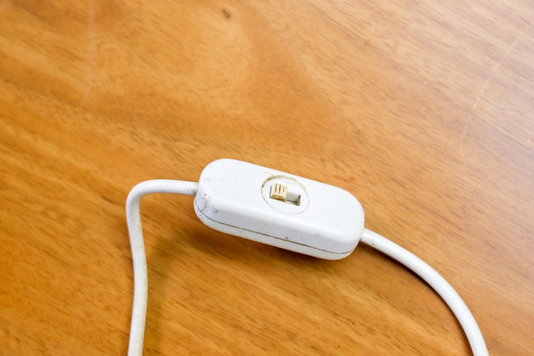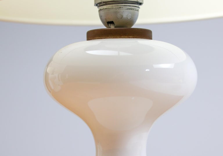 Great white hand-blown glass table lamps with a white linen shade designed in 1968 by Ingo Maurer for his company M-Design. Very elegant design that gives a warm atmosphere to a room despite the strict modern appearance. The light switch was designed by Achile Castiglioni. We have 2 lamps, priced individually. Unique opportunity to purchase a matching pair of this early and desirable design by Ingo Maurer.