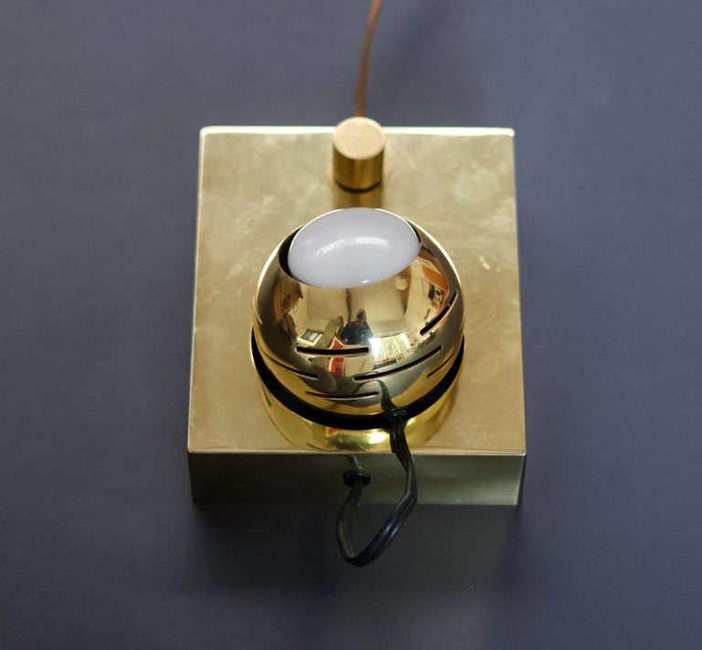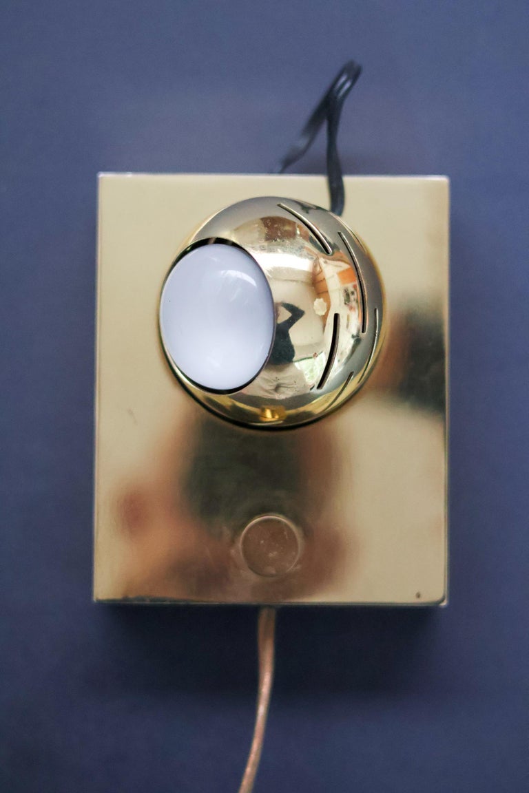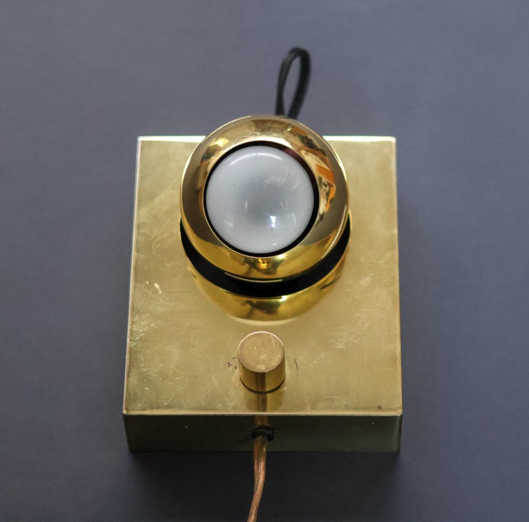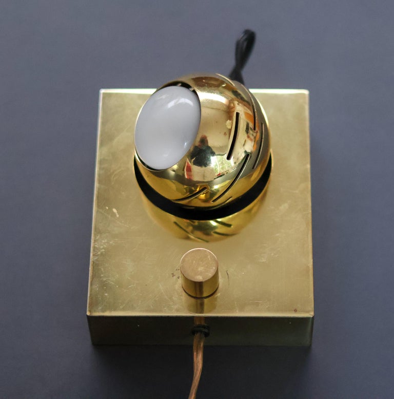 Beautiful wall lamp designed by Angelo Lelli and manufactured by Arredoluce, Italy 1960. This design is part of the ‘eye’ series designed by Angelo Lelli. This table lamp is made of polished brass and has a magnetic eye spot light that is adjustable in many different positions. Nice detail is the on/off switch on the lamp. The lamp is in very good original condition with minor wear as shown on the pictures and in the video. Works perfectly and is usable in the USA. Wonderful piece to enlighten a piece of art. We recommend an E27 6ow maximum bulb. Bulb not included. Rewired for U.S. standards.