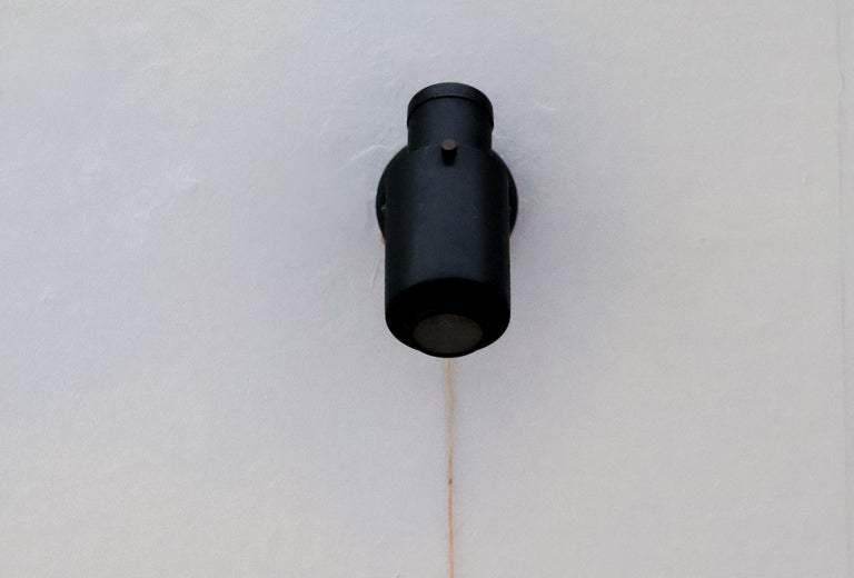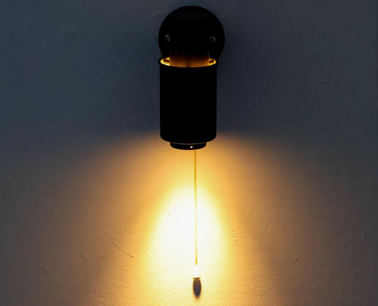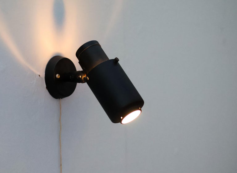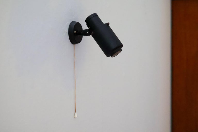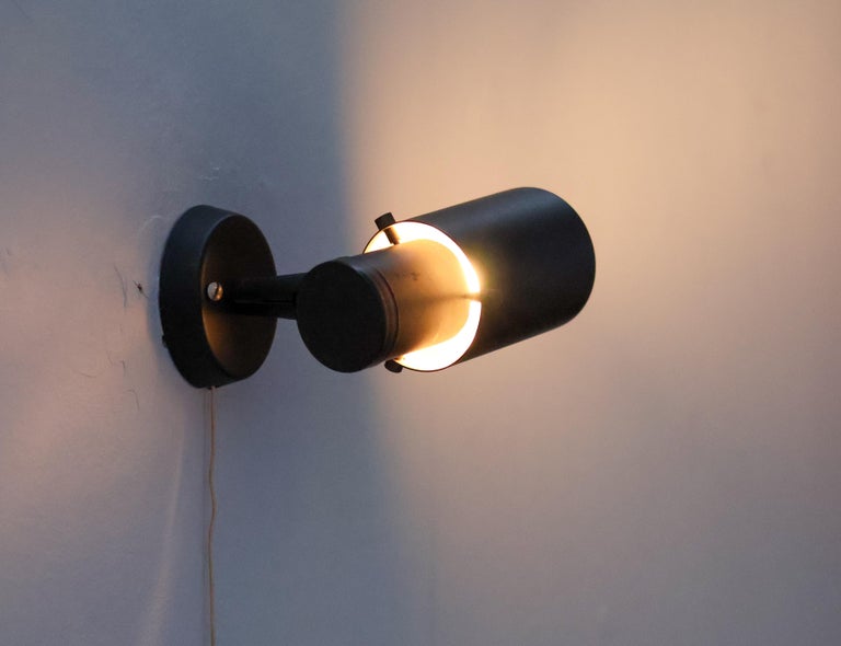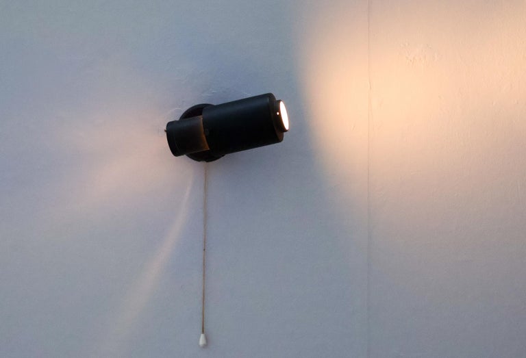 Iconic and highly sought-after wall lamp from the Zodiac series, designed by Jacques Biny for LITA (Luminaire Industriel et Technique). This model is a quintessential example of French mid-century modern lighting, combining graphic strength with refined functional design. The lamp features a sculptural black lacquered metal shade with Biny’s signature perforations, designed to diffuse light softly while creating a striking play of light and shadow on the wall. The bold, architectural silhouette is both decorative and purposeful, reflecting Biny’s background in engineering and his commitment to rational, modern lighting solutions. Elegant yet understated, the Zodiac wall lamp is well suited for use in pairs or multiples in hallways, living spaces, or bedrooms, and works equally well in residential and professional interiors. Its timeless design and restrained palette make it a versatile statement piece. A classic work by one of the most important French lighting designers of the 20th century and an emblematic model of LITA’s innovative post-war production. Designer: Jacques Biny Manufacturer: LITA (Luminaire Industriel et Technique) Model: Zodiac Origin: France Period: 1950s–1960s Materials: Black lacquered metal Style: Mid-Century Modern Condition: Good vintage condition, with minor wear consistent with age and use An authentic and collectible wall lamp, prized for its sculptural presence and historical significance in modern lighting design.