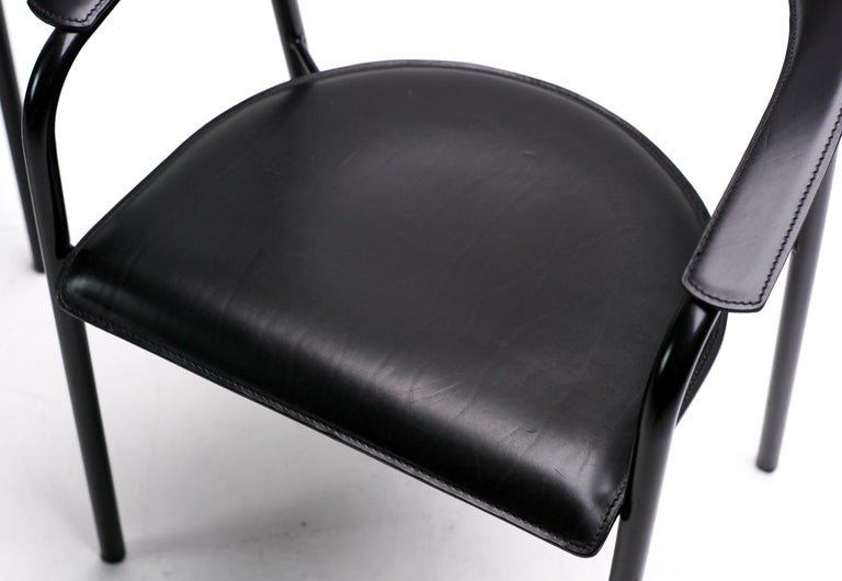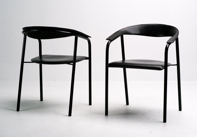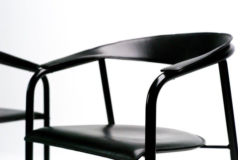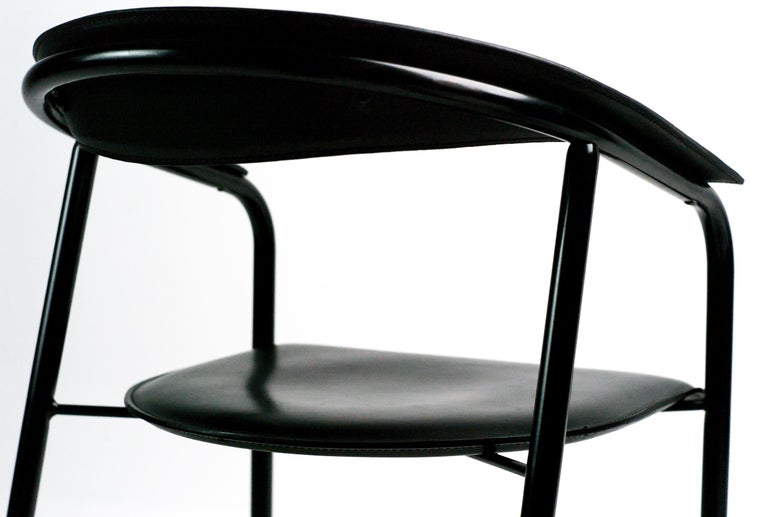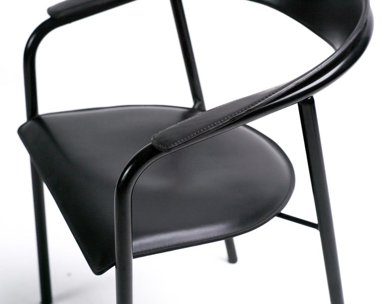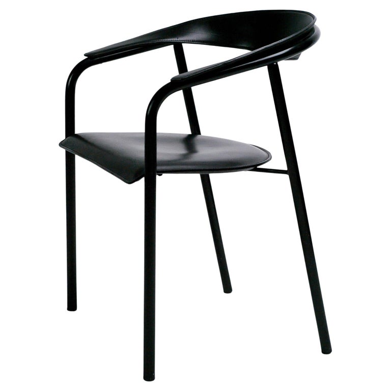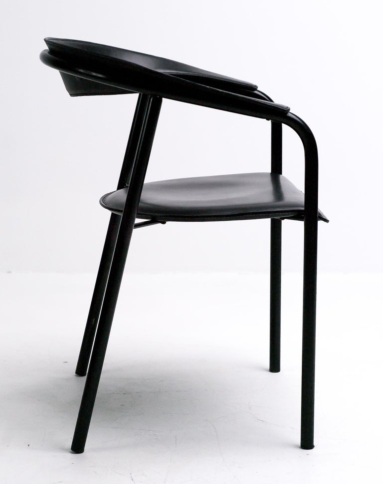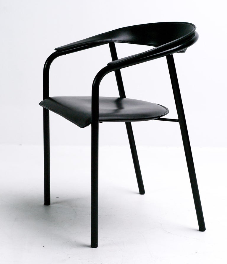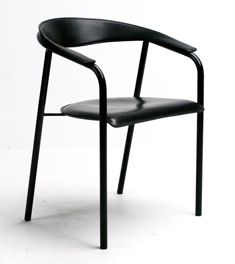 A striking example of Italian design from the late 20th century, this black leather armchair by Arrben showcases the brand’s signature blend of streamlined form and luxurious comfort. Founded in Italy in the 1960s, Arrben is known for its precision metalwork and high-quality leather craftsmanship—both of which are on full display here. The chair features a minimal tubular steel frame finished in black, paired with supple black leather seat and backrest that offer a balanced contrast of softness and structure. Its open silhouette and graceful curves make it an elegant addition to both residential and commercial interiors. Perfect as a desk chair, accent piece, or occasional seating, this armchair is as comfortable as it is visually refined. Pair available, priced individually. Details: Manufacturer: Arrben Origin: Italy, circa 1980s–1990s Materials: Black enameled tubular steel, black leather Condition: Excellent vintage condition with minor wear consistent with age; leather is clean and supple Why we love it: The chair’s sculptural simplicity and ergonomic form give it a timeless presence—versatile, durable, and undeniably chic. A quintessential piece of Italian postmodern design.