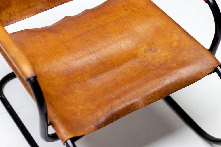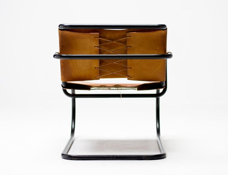 Tubular lounge chair designed by Franco Albini for the Triennale in Milan in 1933. The original black enameled frame emphasizes the graphic qualities of this design. The natural leather seat and back are still in beautiful, fully functional, vintage condition. Literature; Stuhle aus stahl, metalmöbel 1925-1940, page 59. Franco Albini (1905-1977) was an influential Italian architect, designer, and urban planner known for his pioneering modernist approach. His work bridged the gap between tradition and innovation, emphasizing functionality, simplicity, and the use of natural materials. Albini’s iconic furniture designs showcased his mastery of form and space, with pieces like the “Albini Desk” and “Margherita Chair” becoming design classics. He also left a mark on architecture, creating notable structures like the Milan subway system and the Zanussi Building. Albini’s lasting legacy lies in his commitment to human-centric design, blending beauty and utility to create timeless and functional creations.