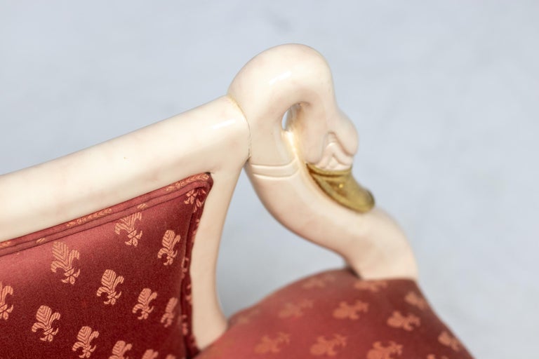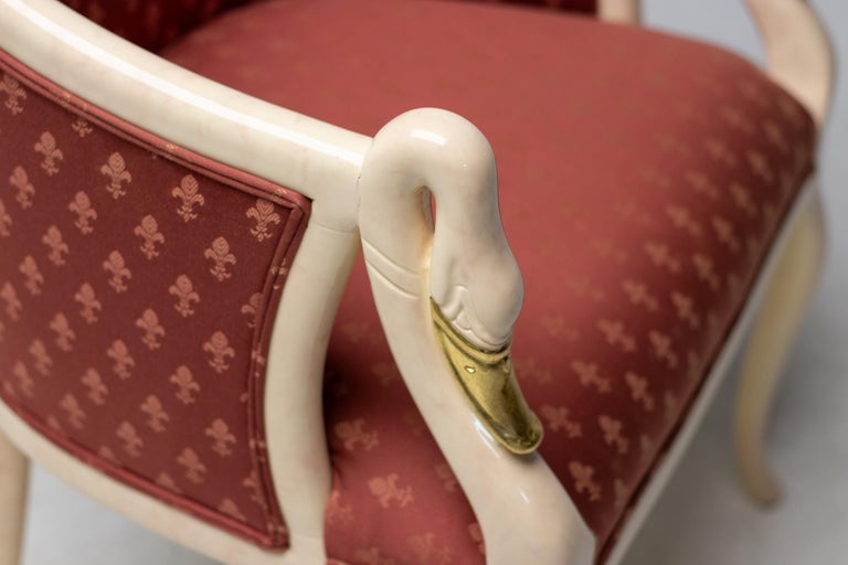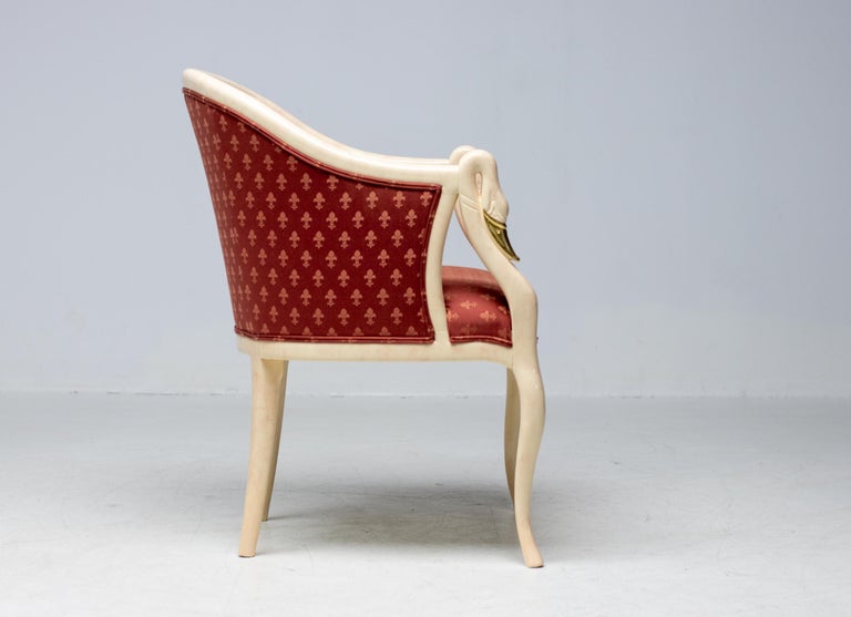 A striking and highly decorative interpretation of the swan-neck form, this armchair by Trüggelmann unites sculptural woodworking with opulent surface treatment. The organic, solid wood framework is finished in an exceptional marble-painted décor, heightened with applied gold leaf. The interplay between the faux-marble veining and gilded detailing accentuates the flowing curvature of the swan-neck arms, lending the piece a distinctly theatrical yet refined presence. The seat and back are upholstered in a vivid poppy red damask, expertly executed by Trüggelmann’s master upholsterers. The textile’s rich pattern and saturated tone create a compelling contrast to the architectural frame, reinforcing the chair’s decorative impact while maintaining elegance and balance. Both the painted and gilded woodwork and the damask upholstery remain in excellent condition, preserving the chair’s original visual integrity and craftsmanship. Maker: Trüggelmann Type: Swan-Neck Armchair Materials: Marble-painted and gilt solid wood frame; red damask upholstery Condition: Excellent Availability: Two available, priced individually A bold yet sophisticated seating statement, ideal for interiors that celebrate craftsmanship, color, and sculptural form.