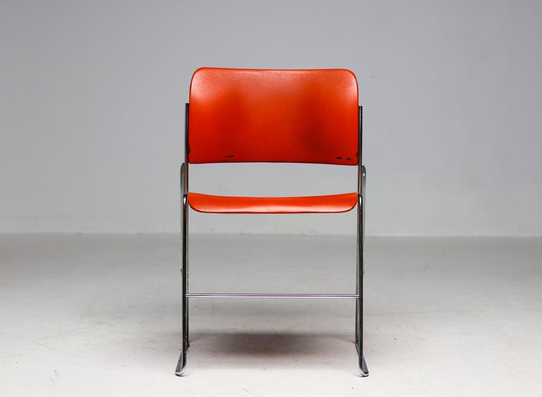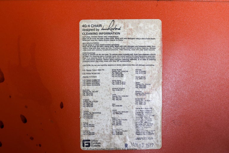 An opportunity to own a piece of modern design history: the iconic 40/4 chair by David Rowland, produced by OF USA. Celebrated for its elegant minimalism and ingenious stackable design, the 40/4 remains a hallmark of functional, space-saving furniture. Offered individually, each chair features a red or brown seat atop a sleek steel frame. Lightweight, durable, and stackable, these chairs combine practical engineering with timeless style, making them perfect for both residential and commercial interiors. Dating from the 1970s, each chair shows vintage wear and user marks, adding authenticity and character while remaining fully functional. A rare opportunity to acquire a true design classic from a defining era of modern furniture.