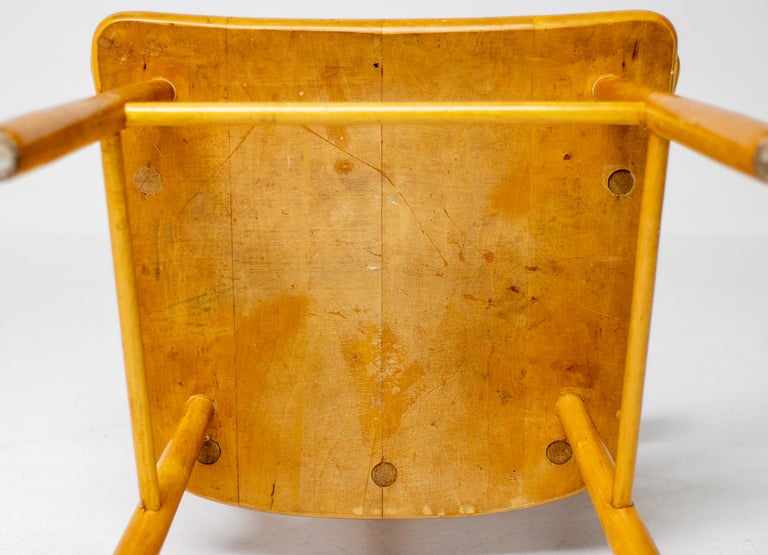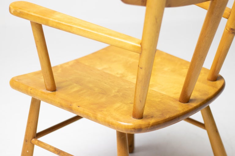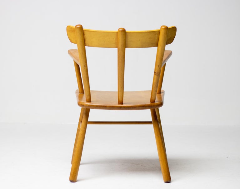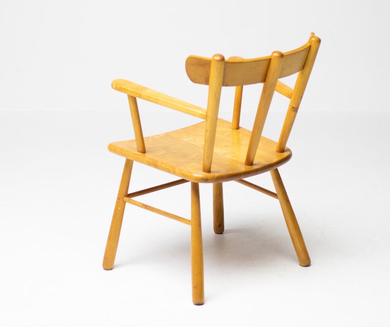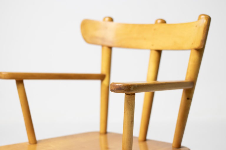 A beautifully proportioned Danish dining armchair from the 1950s, crafted in birch, representing the restrained elegance and functional clarity of mid-century Scandinavian design. The chair features a light, sculptural frame with gently curved arms and carefully refined joinery, highlighting the craftsmanship and material sensitivity characteristic of Danish furniture from this period. The warm tone and fine grain of the birch lend the piece a natural, understated presence, while the balanced proportions ensure both comfort and visual harmony. Ideal as a head chair at a dining table or as an accent chair in a study or living space, this armchair integrates seamlessly into both contemporary and classic interiors. Its timeless design and honest construction make it equally appealing to collectors and design-conscious interiors. An authentic example of 1950s Danish modern design, combining utility, craftsmanship, and enduring aesthetic appeal.