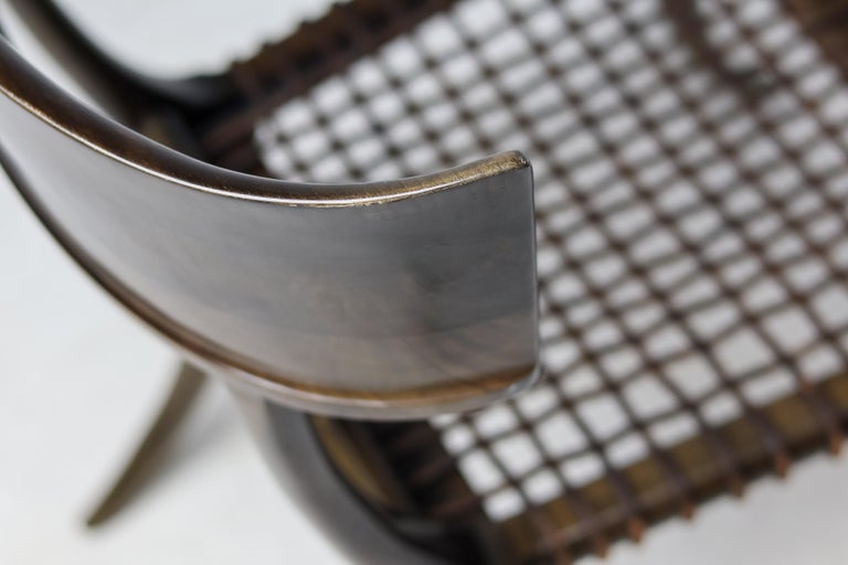 Exceptional pair of early Klismos chairs by T.H. Robsjohn-Gibbings for Saridis of Athens, crafted in dark-stained walnut and retaining their original character and authenticity throughout. These early examples feature the hallmark metal Saridis label and matching carved production numbers, providing clear and desirable documentation. The frames exhibit the elegant, sweeping saber legs and precise carved contours that define Robsjohn-Gibbings’ most iconic work. All original leather seat straps remain intact, offering a rare, unaltered glimpse into the atelier’s meticulous hand craftsmanship. The patina of the walnut and the preserved leather combine to create a museum-worthy presentation seldom found on the market today. Provenance adds further distinction: this pair was installed in the executive offices of Royal Dutch Shell, underscoring their status as objects selected for environments where quality and design pedigree were paramount. A highly collectible pair for connoisseurs of Robsjohn-Gibbings, Greek Revival modernism, or significant twentieth-century design. Suitable for refined interiors, curated collections, and discerning buyers seeking confirmed early production with exceptional integrity.