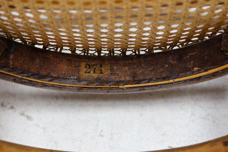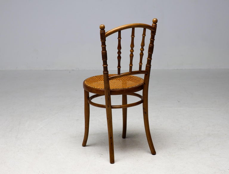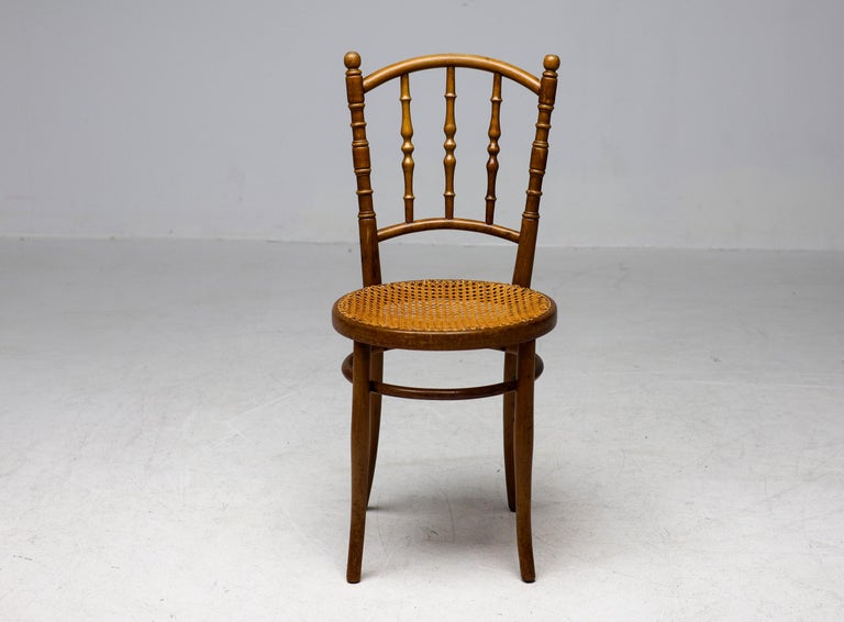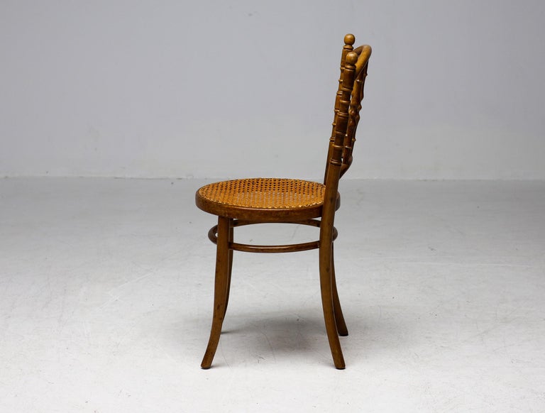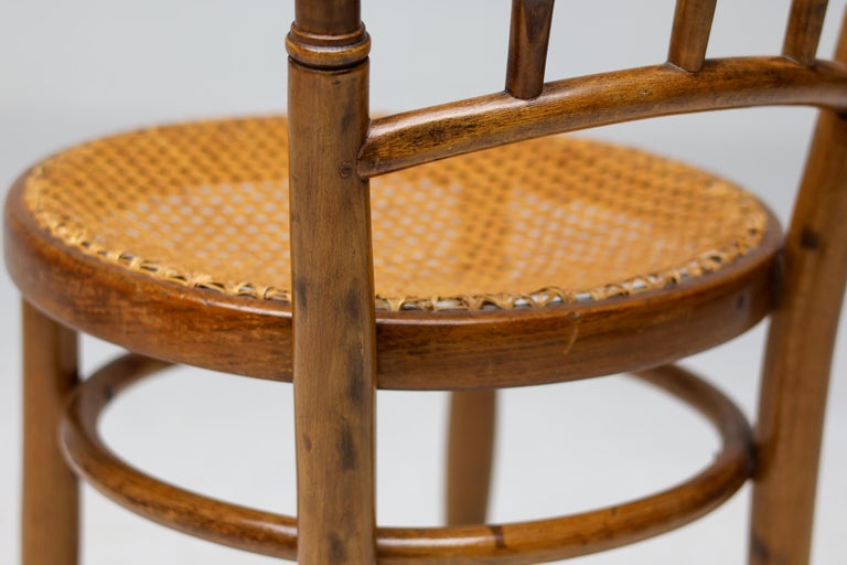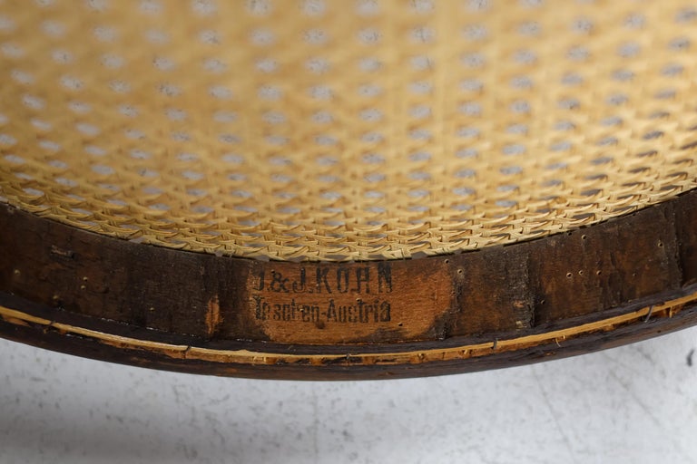 Jacob & Josef Kohn bentwood and rattan chair, manufactured in Austria, circa 1950. In original condition, with wear consistent with age and use, preserving a beautiful patina. Marked with stamp underneath the seat as shown. Pair available, priced individually. Jacob & Josef Kohn was an Austrian furniture company founded in 1849 in Vienna. Specializing in bentwood furniture, the company became a major competitor of Thonet, revolutionizing the industry with elegant, lightweight, and durable designs. By the late 19th and early 20th centuries, Kohn collaborated with renowned architects and designers, including Josef Hoffmann and Otto Wagner, contributing to the Viennese Art Nouveau and Wiener Werkstätte movements. Their chairs, tables, and interior designs were widely used in cafés, hotels, and public spaces across Europe.