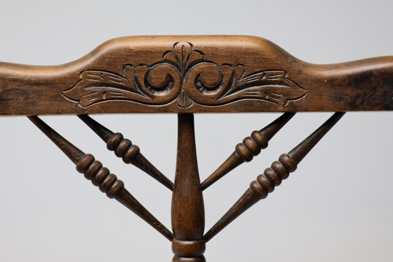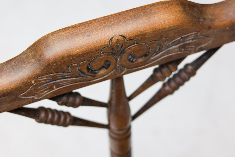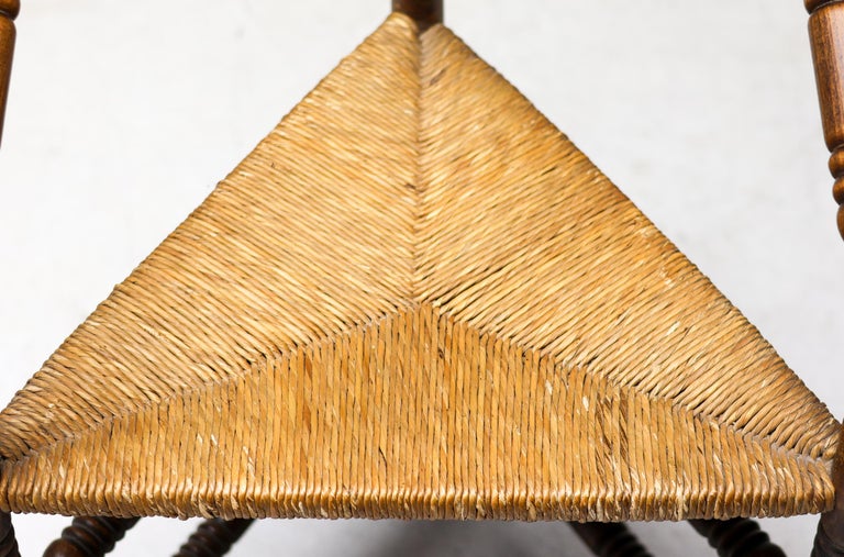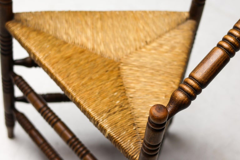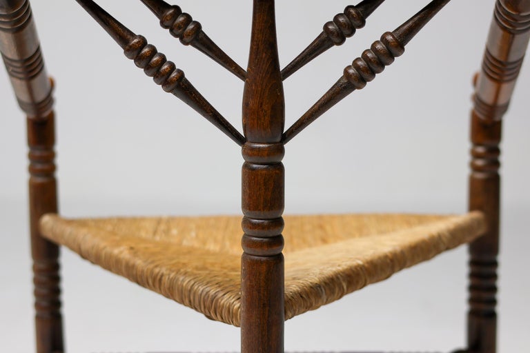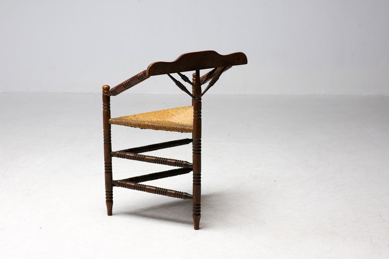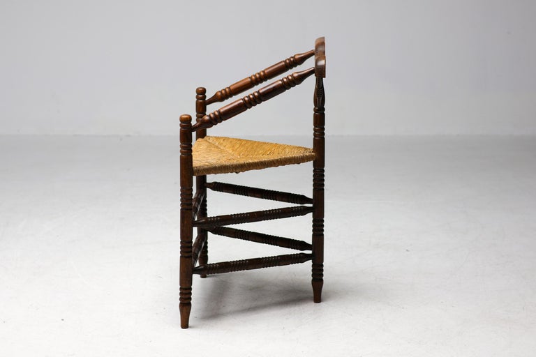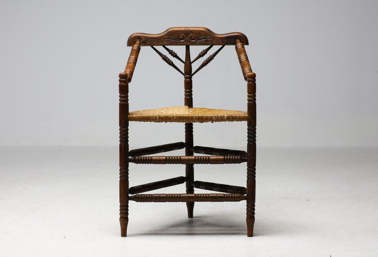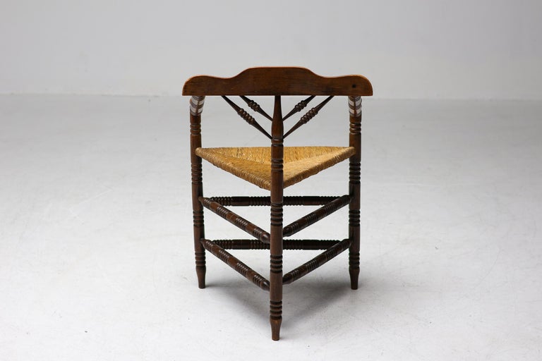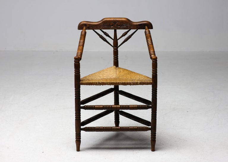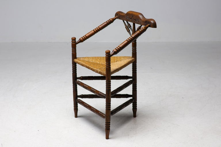 Antique carved wooden spindle corner side chair with woven rush reided seat. Circa Late 1800s. Original finish fittings and frame. Solid and sturdy.