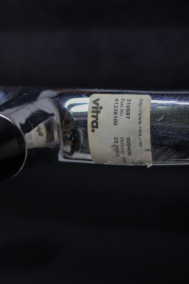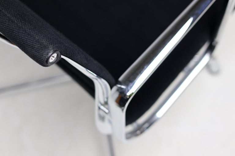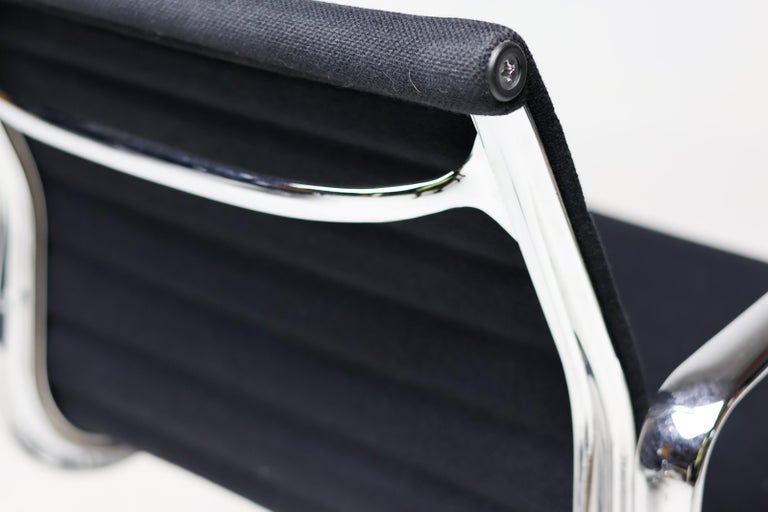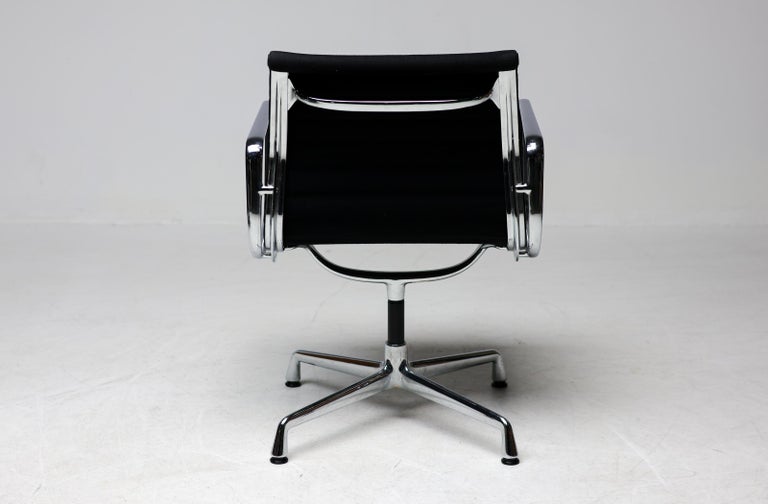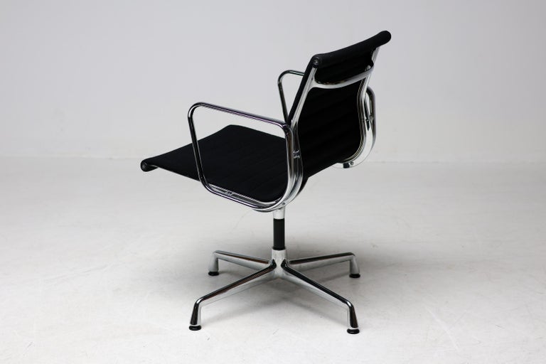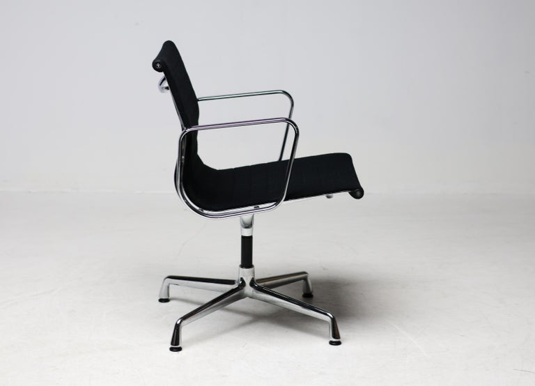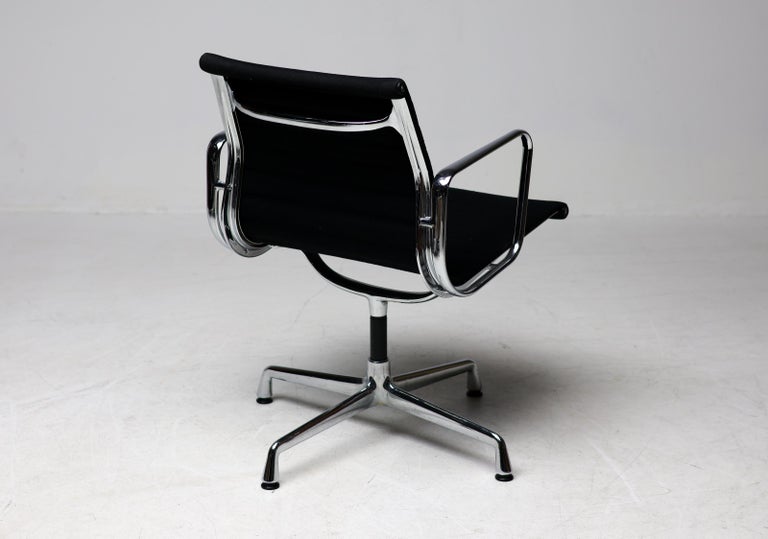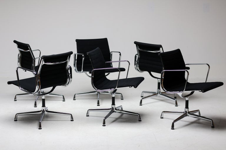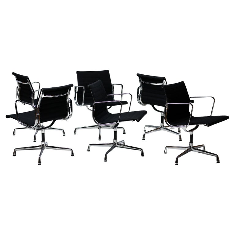 A wonderful set of six EA108 swivel chairs by Charles and Ray Eames for Vitra. These authentic mid-century masterpieces feature polished chromed aluminum frames and the original black Hopsak fabric—a durable and breathable textile that highlights the Eames’ innovative suspension seating. The EA108 model offers a low back profile and swivel, making them exceptionally versatile for a modern dining room, executive office, or design-focused living space. Sold as a complete matching set of six. The chairs are in original vintage condition, with the aluminum frames showing very light wear and the black hopsak fabric remaining clean and structurally sound. Marked with Vitra label.