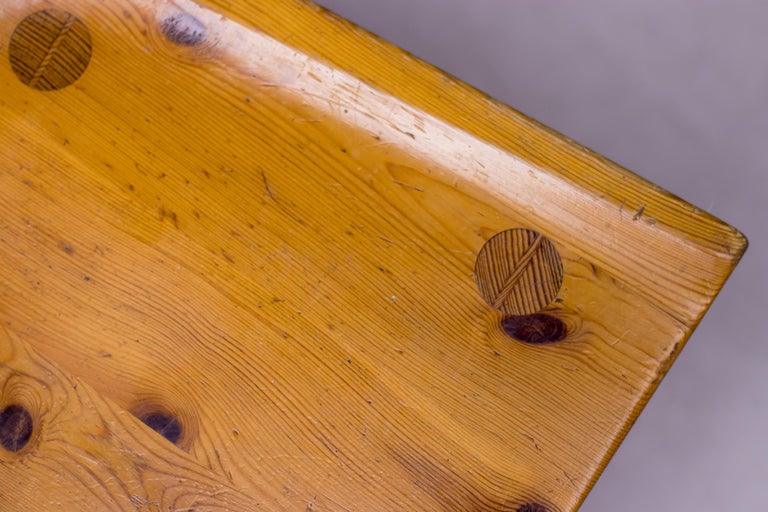 A striking and beautifully crafted set of six side chairs designed by Roland Wilhelmsson in Sweden, circa 1960s. Executed in solid Oregon pine, these chairs embody the sculptural simplicity and honest materiality that define the best of Scandinavian modern design. Each chair showcases Wilhelmsson’s distinctive architectural approach — clean, geometric lines softened by the warmth and texture of natural wood. The precision of joinery and the expressive grain of the pine highlight the designer’s background in fine carpentry and his deep respect for material integrity. Strong, minimal, and timeless, these chairs pair perfectly with both rustic and modern interiors, offering a refined sense of Nordic authenticity. Details: Designer: Roland Wilhelmsson Origin: Sweden Year: 1960s Materials: Solid Oregon pine Condition: Excellent vintage condition; beautiful patina consistent with age and use Quantity: Set of six Marked with gold foil label An exceptional example of Swedish craftsmanship — functional sculpture that balances purity of form with tactile warmth.