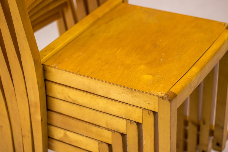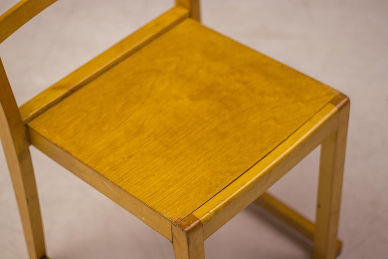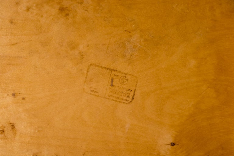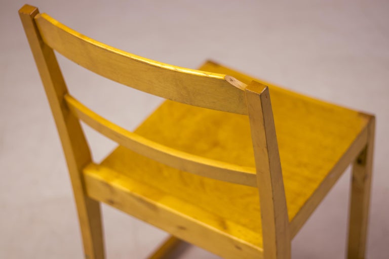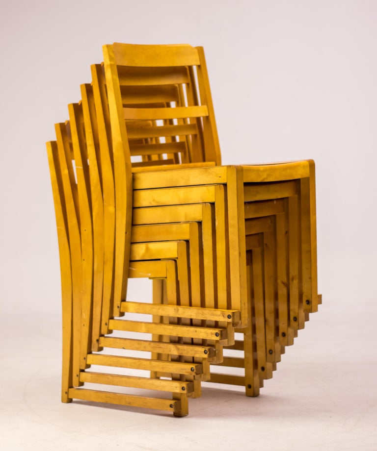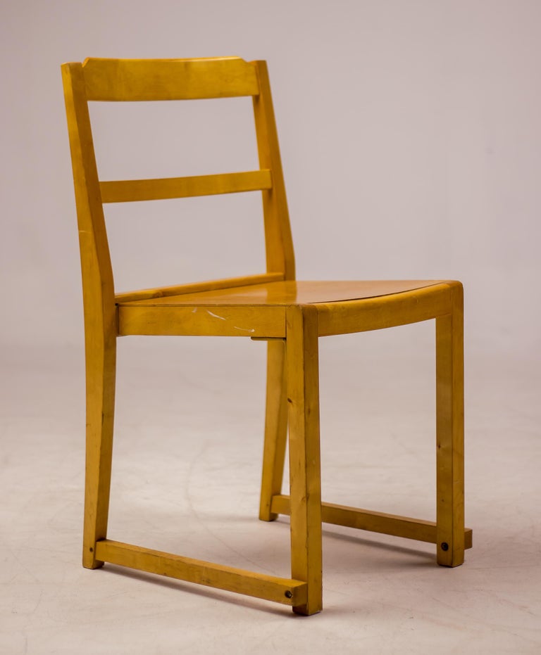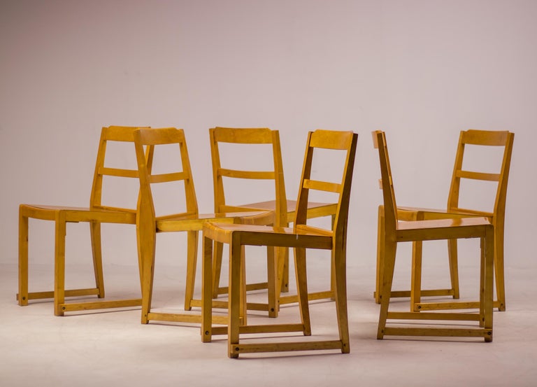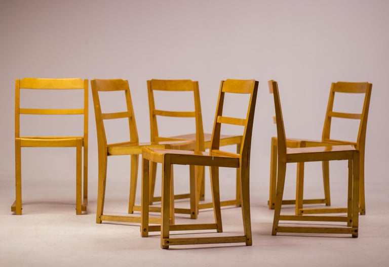 A distinguished set of six “Orchestra” chairs designed by renowned Swedish architect and designer Sven Markelius. Manufactured by Bodafors especially for the Helsingborg Concert Hall in 1932. These chairs exemplify Markelius’ humanist modernist approach, combining architectural rigor with comfort, clarity of form, and exceptional functionality. The “Orchestra” model is defined by its elegantly curved backrests and carefully balanced proportions, offering both visual lightness and ergonomic support. The design reflects Markelius’ deep engagement with social modernism, where furniture was conceived not only as an aesthetic object but as an integral element of everyday life. The chairs’ sculptural silhouettes and refined detailing allow them to function seamlessly as dining chairs, conference seating, or accent pieces in both residential and institutional interiors. Crafted with a strong emphasis on quality and longevity, the set demonstrates the restrained sophistication and thoughtful construction associated with Scandinavian design of the period. As complete sets are increasingly difficult to source, this group of six represents a compelling opportunity for collectors and designers alike. Designer: Sven Markelius Model: Orchestra Provenance: Helsingborg Concert Hall, Sweden Materials: Birch frame with birch seat and backrest Condition: Good vintage condition, with wear consistent with age and use An elegant and historically significant set that captures the essence of Swedish modernism—timeless, functional, and quietly expressive.
