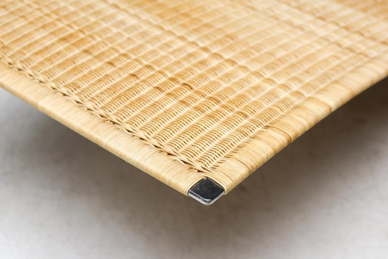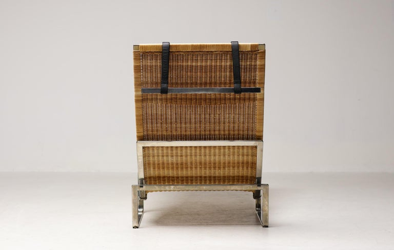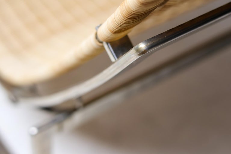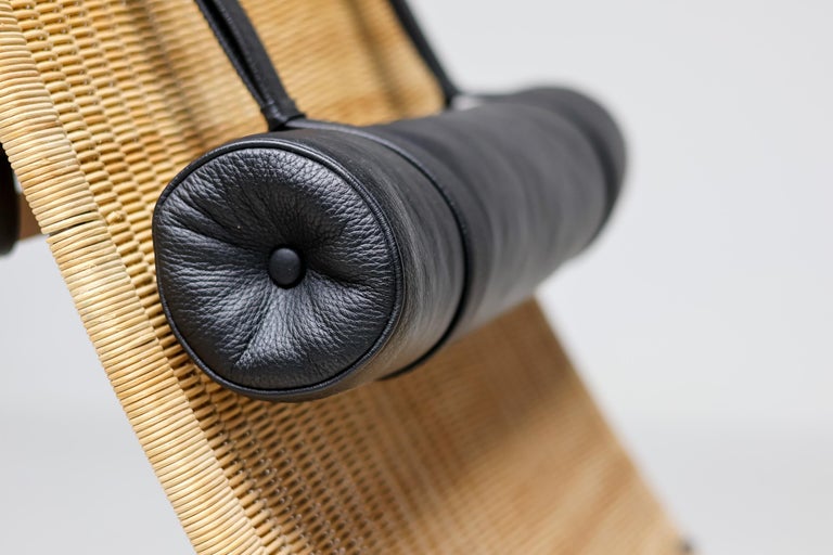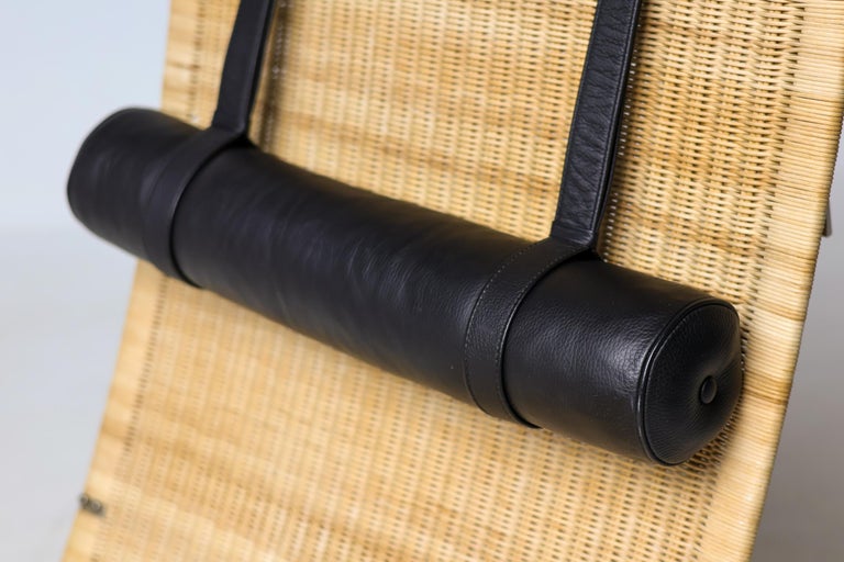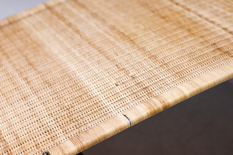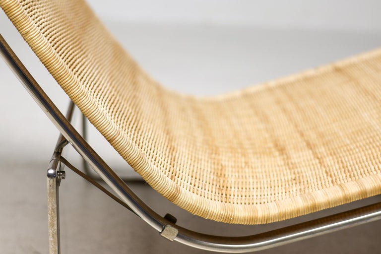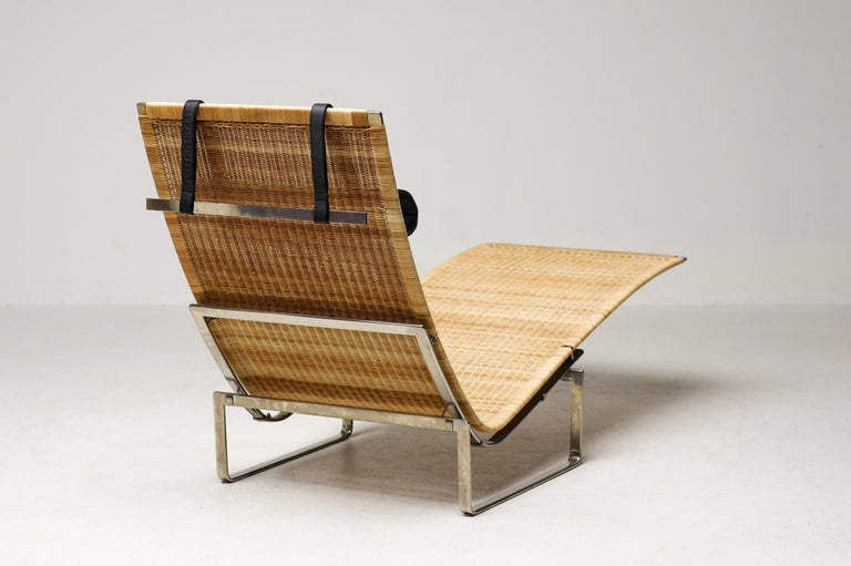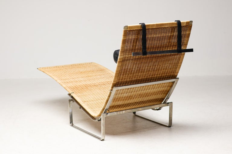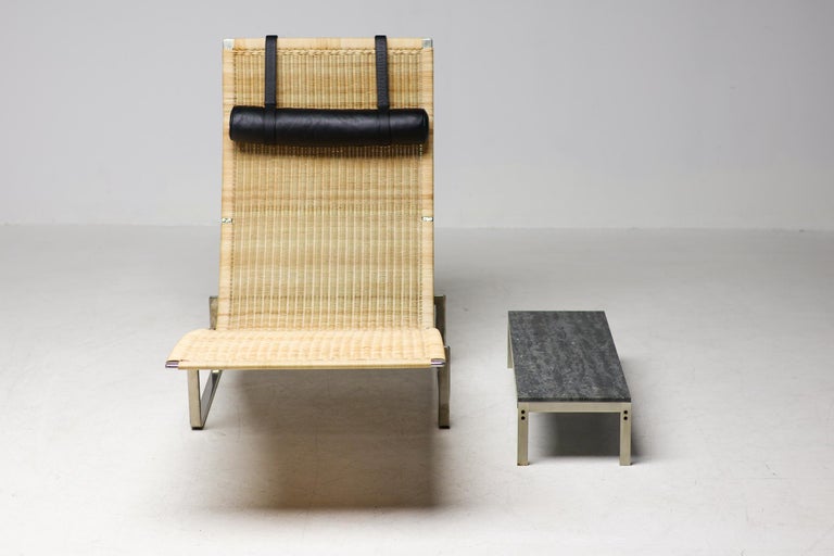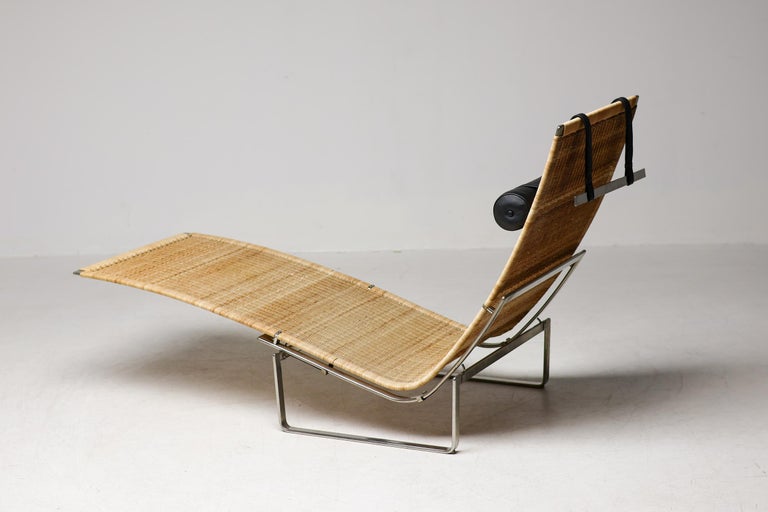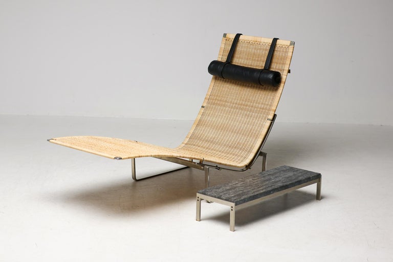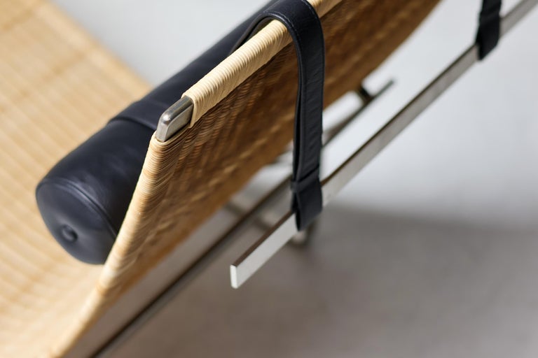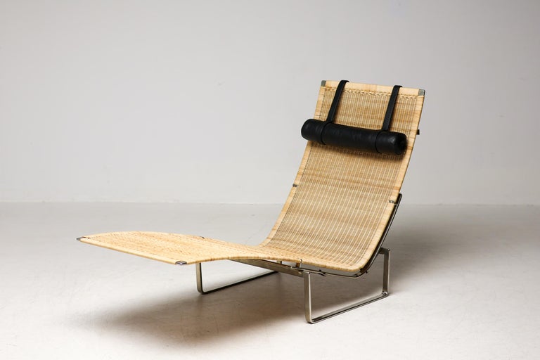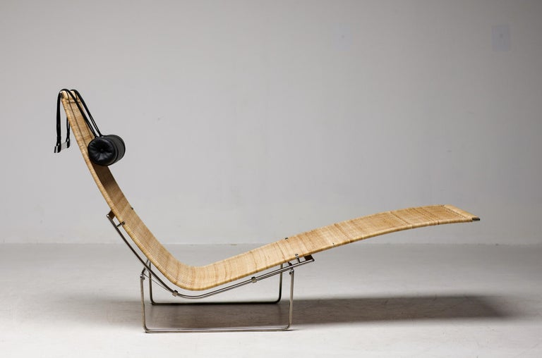 PK24 chaise longue by Poul Kjaerholm for E. Kold Christensen. This piece is part of an important collection of early Kjaerholm pieces carefully curated by an art loving couple for their architectural villa in The Netherlands. The villa is sold and their other house and art museum don’t match with the Kjaerholm aesthetics. We will list more pieces of this collection soon. This piece is in fine vintage condition with a few cane blemishes as pictured. The extremely rare and desirable Porsgrunn PK62 side table, specially designed by Kjaerholm for use with the PK24, is also available and listed separately. The PK24 chaise longue designed by Poul Kjaerholm in 1965 for E. Kold Christensen is a Scandinavian design icon. It is also commonly referred to as the “Hammock chair”. Its stainless steel frame is combined with an elongated cane seat and a leather neck cushion, creating a sleek and minimalistic silhouette. Ingeniously, the angle of the seat can be adjusted by pushing or pulling the sides of the frame. The slight recline and ergonomic design ensure optimal support for the body.