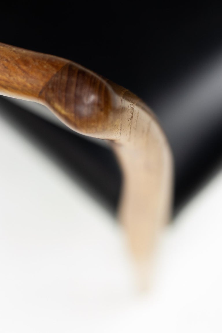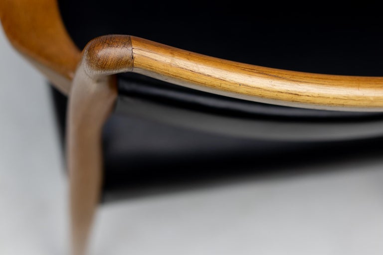 Rare matching all original set of 6 dining chairs in beautifully sculpted teak and black leather designed by Kai Kristiansen and produced by Oddensen Maskinsnedkeri in Denmark, circa 1960. The set consists of 2 armchairs and 4 side chairs. Reference: The Danish Design Museum Furniture Index Kai Kristiansen is a Danish furniture designer known for his elegant, functional, and timeless mid-century modern designs. Born in 1929, he studied at the Royal Danish Academy of Fine Arts under renowned designer Kaare Klint. Kristiansen gained prominence in the 1950s and 1960s, creating innovative furniture with clean lines and organic shapes, often crafted from teak, rosewood, and oak. His most famous works include the Model 42 dining chair, the modular FM Reolsystem, and the iconic No. 121 wall unit. His designs are highly sought after by collectors and continue to be produced today. Kristiansen’s work embodies the principles of Danish modernism, emphasizing craftsmanship, functionality, and aesthetic simplicity.