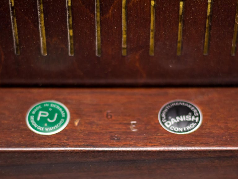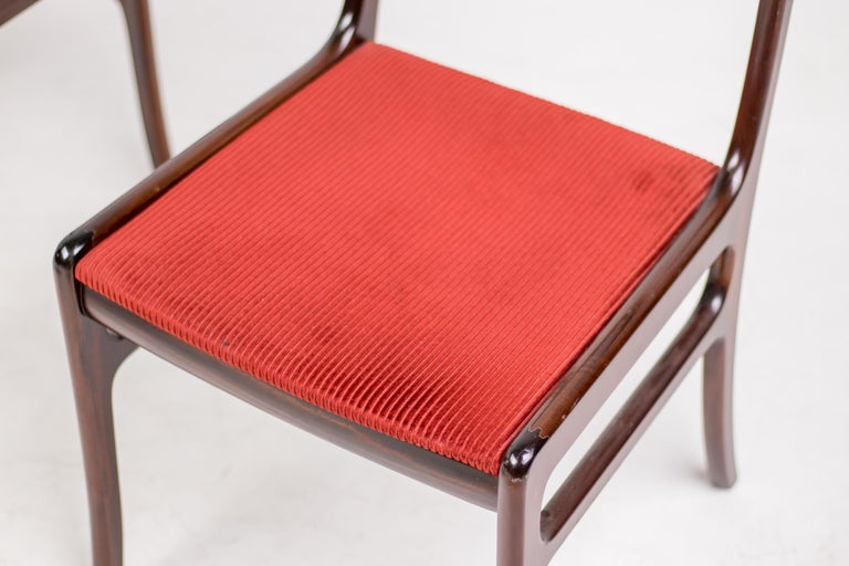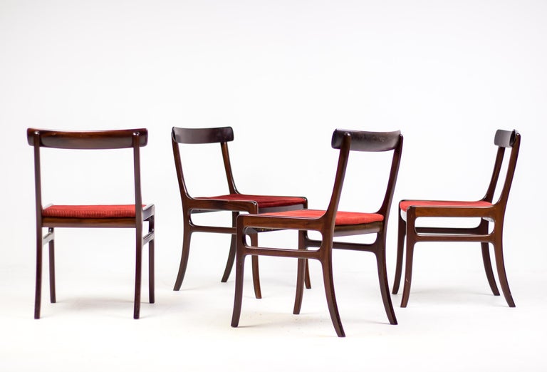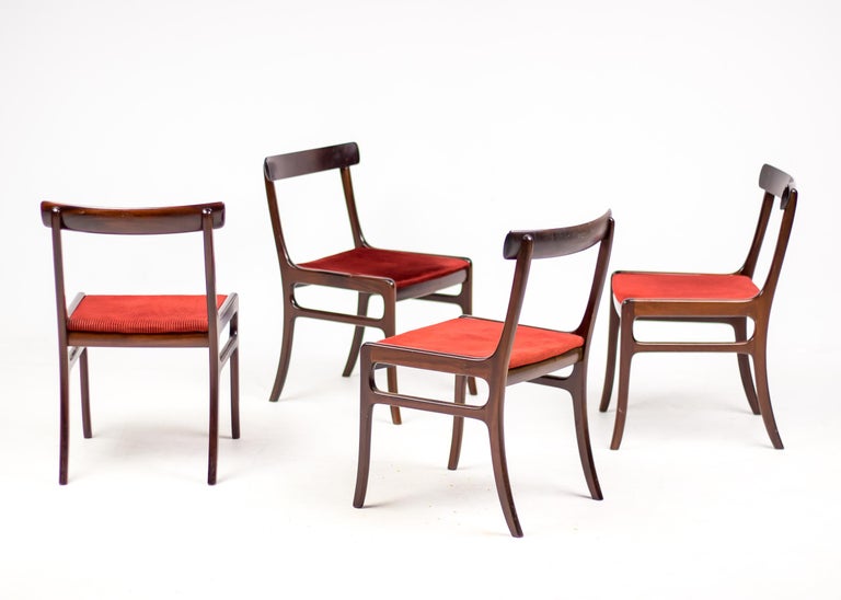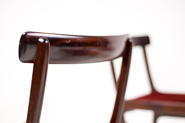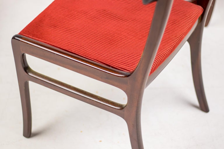 Ole Wanscher for P. Jeppesen, set of 4 dining chairs, model ‘Rungstedlund’ PJ 34, in mahogany and red velvet ribcord upholstery, Denmark, 1960s. Marked with PJ silver medallion. These classic dining chairs are designed by the Danish designer Ole Wanscher and feature a slightly reclining back and a curved, horizontal slat that functions both as the backrest and constructional element. The tapered legs bear references to 19th century saber legs giving this set a classic, almost stately elegance. Executed in beautiful dark grained mahogany and still featuring the original seat upholstery. Please note that we advise reupholstery before use. The original velvet ribcord is very nice, with no stains or wear, but the original foam is totally gone. Reupholstery can be done before shipping by our experienced craftsmen and -women in our own restoration atelier. With high attention for the original, they make sure every piece contains its value and is ready for the many years to come. Of course, a locally organized reupholstery is possible as well.