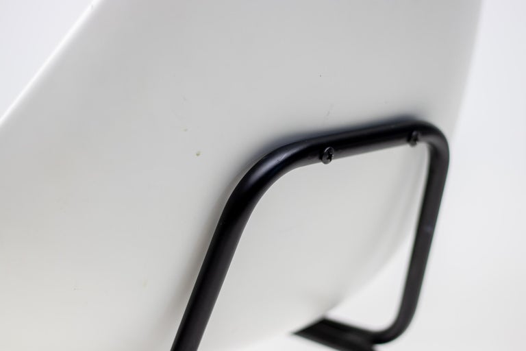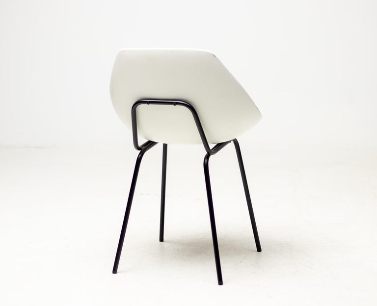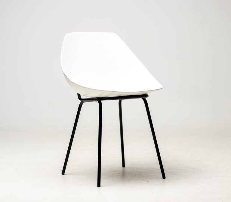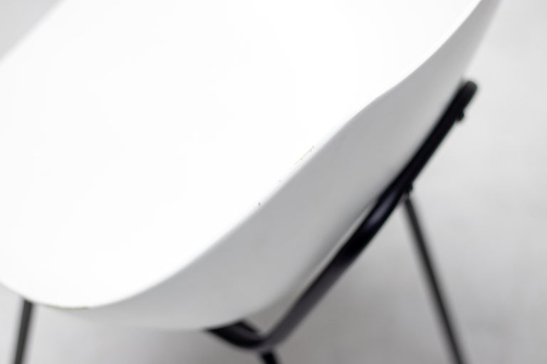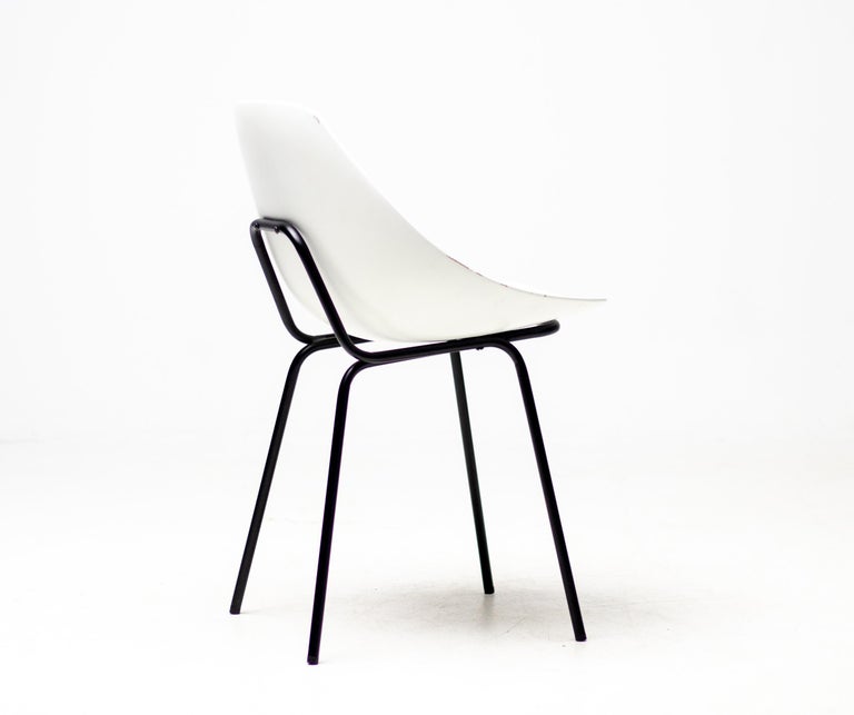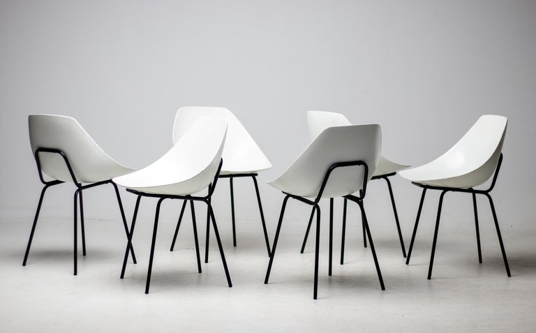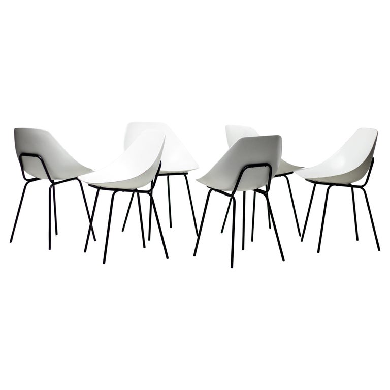White fiberglass shell chairs designed in the 1950s by Pierre Guariche. For a very short period the Coquillage or Scallop chair was reissued by Maisons du Monde, France. Each chair is marked with the signature of the designer. Priced individually, 6 chairs available. Pierre Guariche was a French designer, interior decorator and architect. He is perhaps best known for the residential lights that he designed for Pierre Disderot in the 1950s, but he was also an innovative furniture designer and architect. He studied at the École nationale supérieure des arts décoratifs, where he was taught by René Gabriel. He became a member of the Union des artistes modernes (UAM). He joined the studio of another of his teachers, Marcel Gascoin. He began to exhibit his own work in the Salon des Arts Ménagers and the Salon des Artistes Décorateurs. In the period after World War II there was increased interest in using new methods and materials for mass production of furniture. Manufacturers of materials such as formica, plywood, aluminum, and steel sponsored the salons of the Société des artistes décorateurs. Designers who exhibited their experimental work at the salons in this period included Guariche, René-Jean Caillette, Joseph-André Motte, Jean Prouvé, Charlotte Perriand, Antoine Philippon and Jacqueline Lecoq.