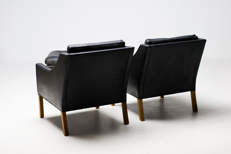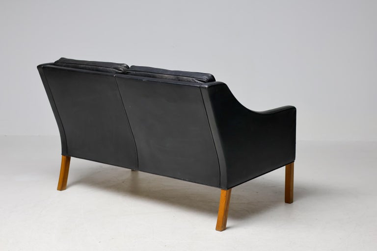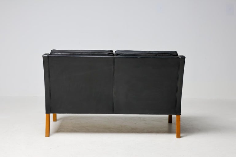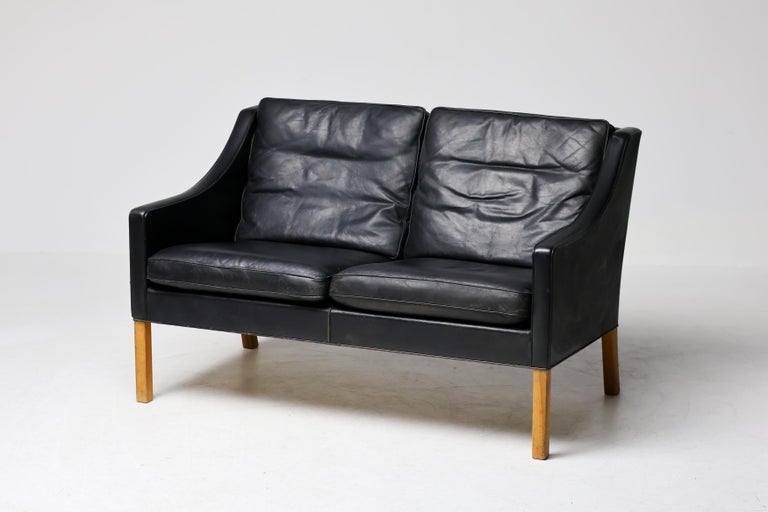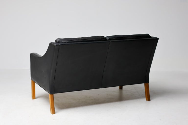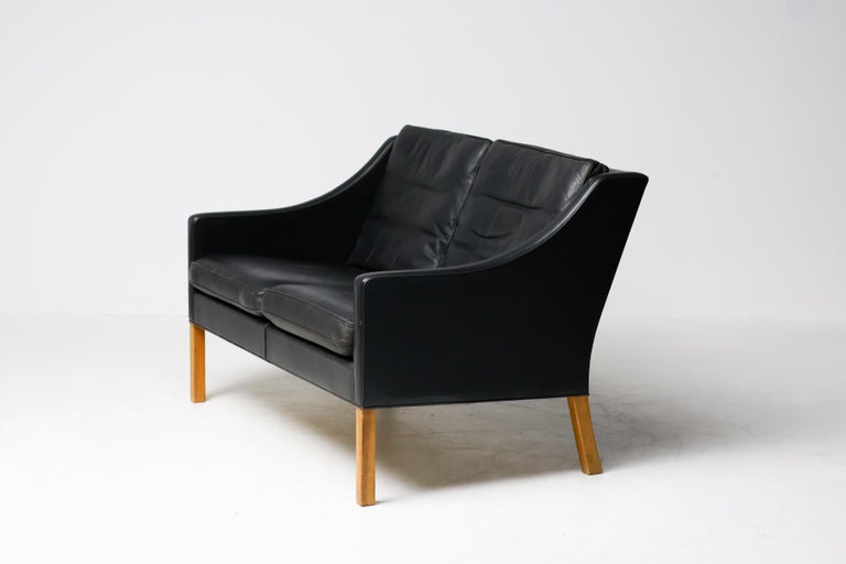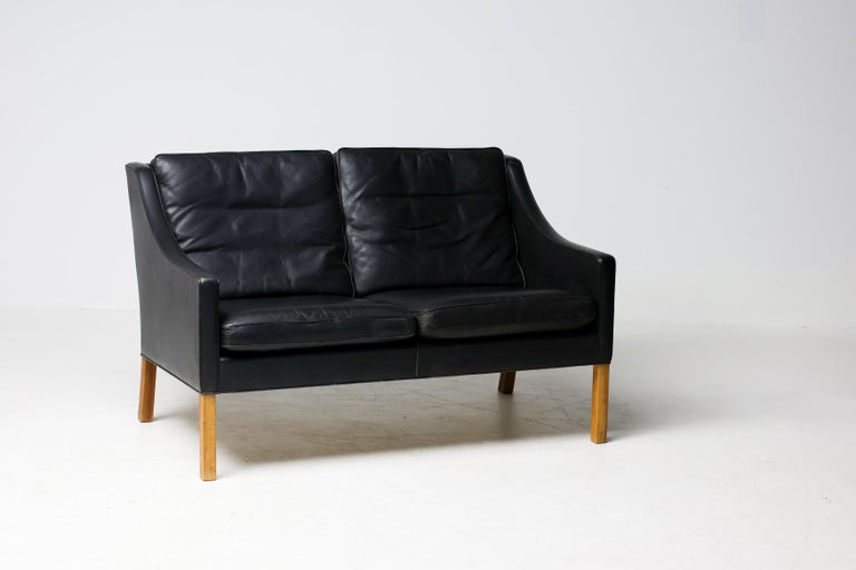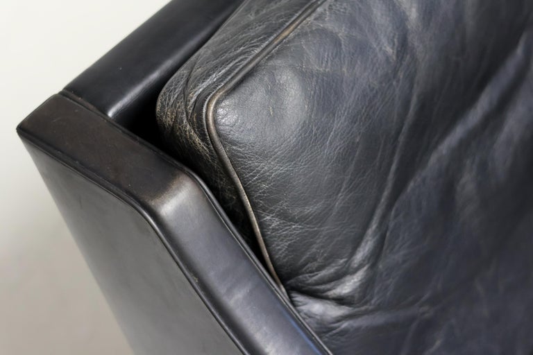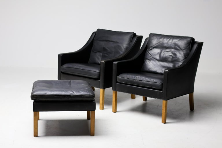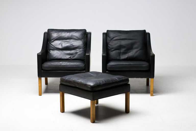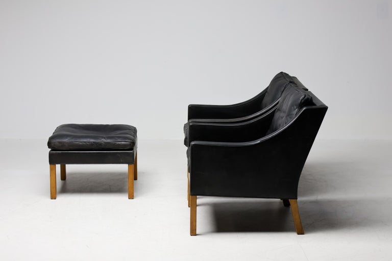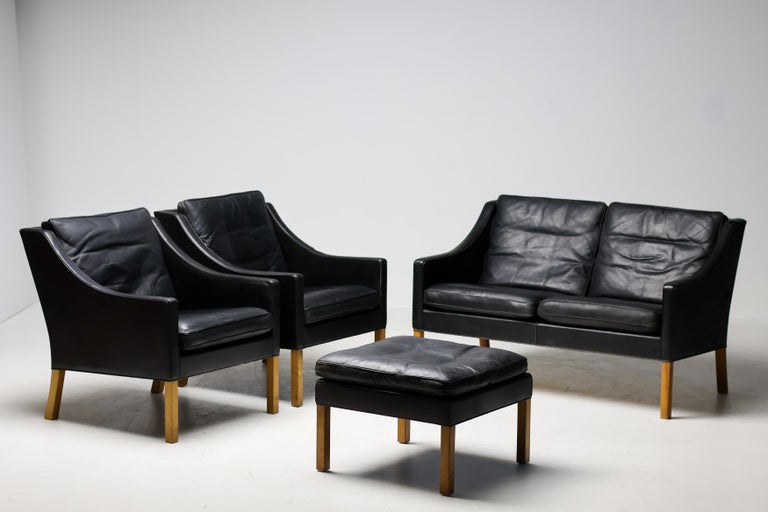 A vintage early living room set designed by Børge Mogensen. Produced by Fredericia Denmark and upholstered in luxurious all-black leather. Consisting of a 2-seater Model 2207 sofa and 2 lounge chairs Model 2207 with 1 matching ottoman. This iconic Danish modern design exemplifies Mogensen’s dedication to functional comfort, craftsmanship, and timeless simplicity. The set features clean, understated lines and generously proportioned cushions, offering both elegance and exceptional seating comfort. Its robust yet refined frame reflects Fredericia’s meticulous attention to detail and high-quality construction, ensuring durability and enduring appeal. The black leather upholstery adds a sleek, sophisticated presence, making the set equally suited to contemporary or classic interiors. A true hallmark of Danish modern design, this Mogensen set combines practicality, comfort, and sculptural form in a single, elegant package. A museum-quality example of 20th-century Scandinavian design, perfect for collectors and design enthusiasts seeking an iconic centerpiece for the living room.
