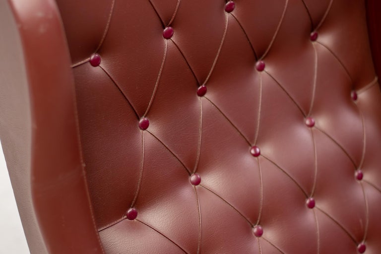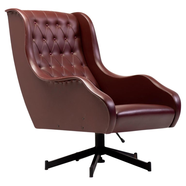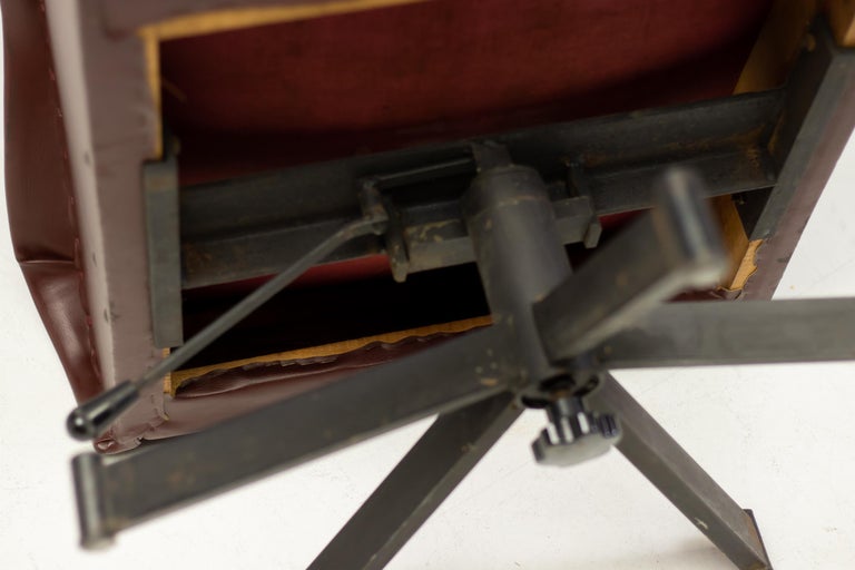 A striking example of mid-century Italian design, this 1950s reclining lounge chair combines sculptural form with everyday comfort. Upholstered in rich oxblood Naugahyde, the chair features elegant angular lines, tapered legs, and a reclining mechanism that embodies the era’s balance of innovation and style. The deep tone of the upholstery contrasts beautifully with the sleek black enameled steel frame, creating a piece that is both visually commanding and invitingly comfortable. Ideal for living rooms, reading corners, or design-forward interiors, it captures the effortless sophistication of Italian mid-century furniture. Details: Origin: Italy, circa 1950s Material: Oxblood Naugahyde, enameled steel Function: Reclining seat and back Condition: Excellent vintage condition, minor wear consistent with age A refined statement chair that brings the warmth and craftsmanship of 1950s Italy to any interior — a perfect blend of comfort, form, and timeless design.