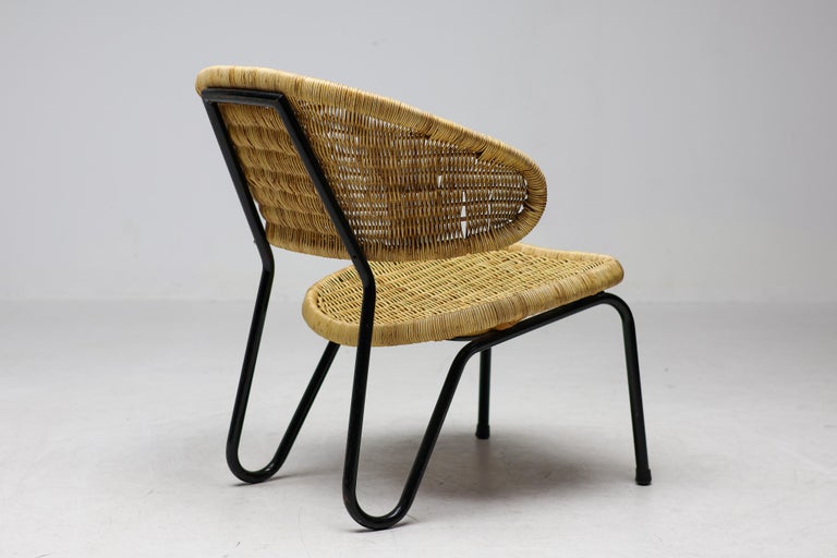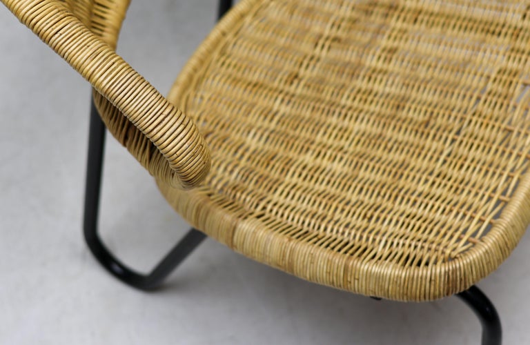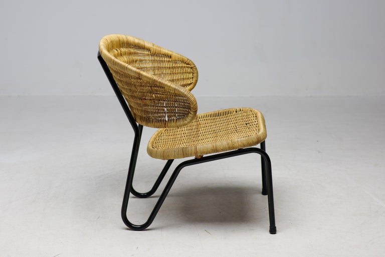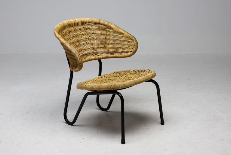 A refined example of mid-century Dutch craftsmanship, this rare Dirk van Sliedregt Easy Chair, Model 568, was produced by Gebr. Jonkers in the Netherlands circa 1954. Van Sliedregt is celebrated for his masterful use of natural materials, and this piece is no exception. The chair showcases an elegant yet architectural black enameled steel frame, expertly shaped to create a light, airy silhouette while maintaining exceptional strength and durability. The fluid lines and sculptural armrests reflect the organic modernist aesthetic that defines post-war European design. The woven rattan seat and backrest provide both visual texture and ergonomic comfort, offering a relaxed seating experience that feels as relevant today as it did in the 1950s. The craftsmanship is evident in every joint and curve, highlighting the artisanal quality associated with Gebr. Jonkers production. Perfect as a statement lounge chair in a living space, reading corner, or sunroom, this piece blends seamlessly with mid-century, Scandinavian, and contemporary interiors alike. A highly collectible design that embodies the warmth and sophistication of natural materials, this chair is a timeless addition for discerning collectors and design enthusiasts. Designer: Dirk van Sliedregt Manufacturer: Gebr. Jonkers Model: 568 Origin: Netherlands Period: 1950s Materials: Rattan Condition: wonderful vintage condition