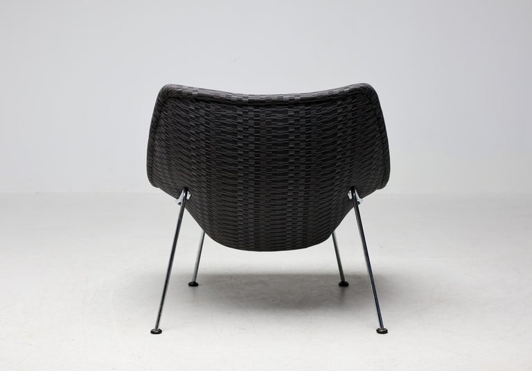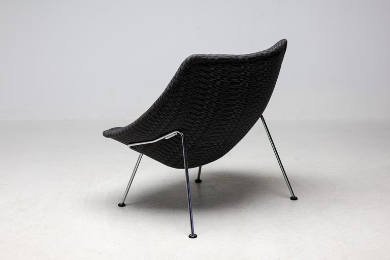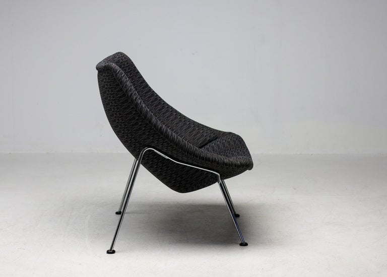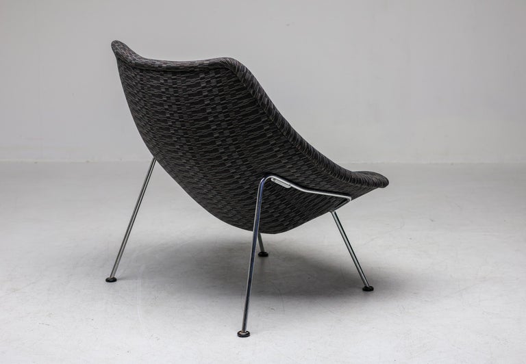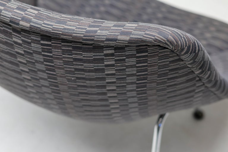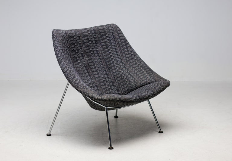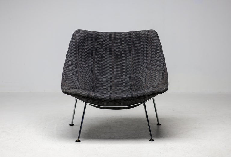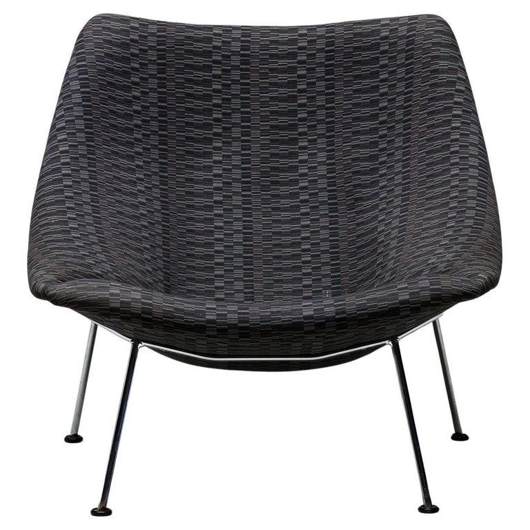 The Artifort Oyster chair, designed by Pierre Paulin in the late 1950s, is renowned for its distinctive organic shape and comfortable design. The “large” version, often referred to as the F157 model, features a wider and slightly taller seat compared to the standard model, providing enhanced comfort. This model typically measures approximately 83 cm in height, 89.5 cm in width, and 79.5 cm in depth, with a seat height of around 35.5 cm. The bent plywood shell is covered with foam and fabric and floats in a base of chrome-plated steel rods. Upholstered in a grey, black checkered fabric.