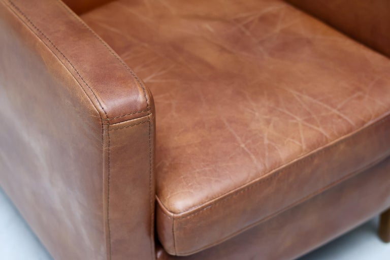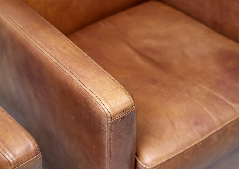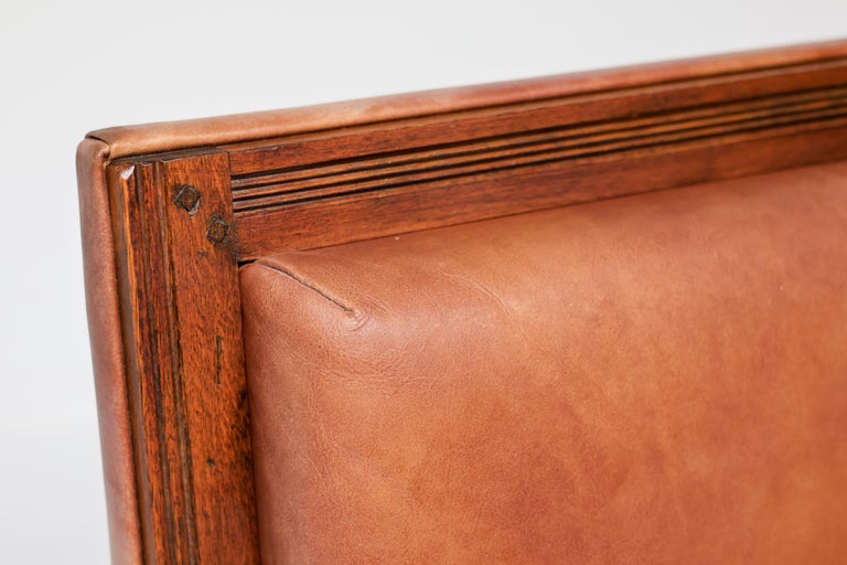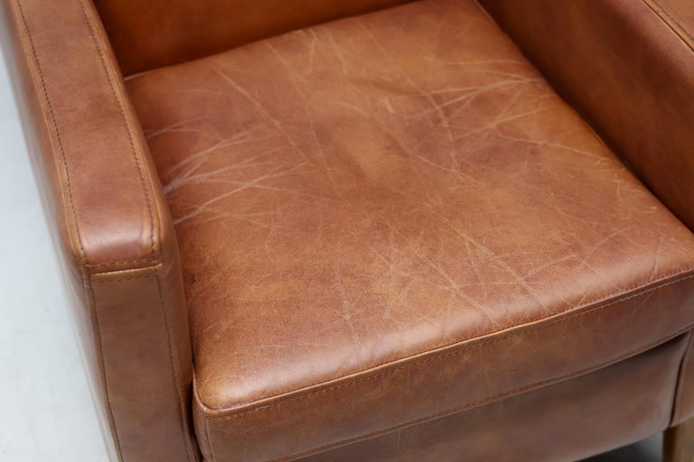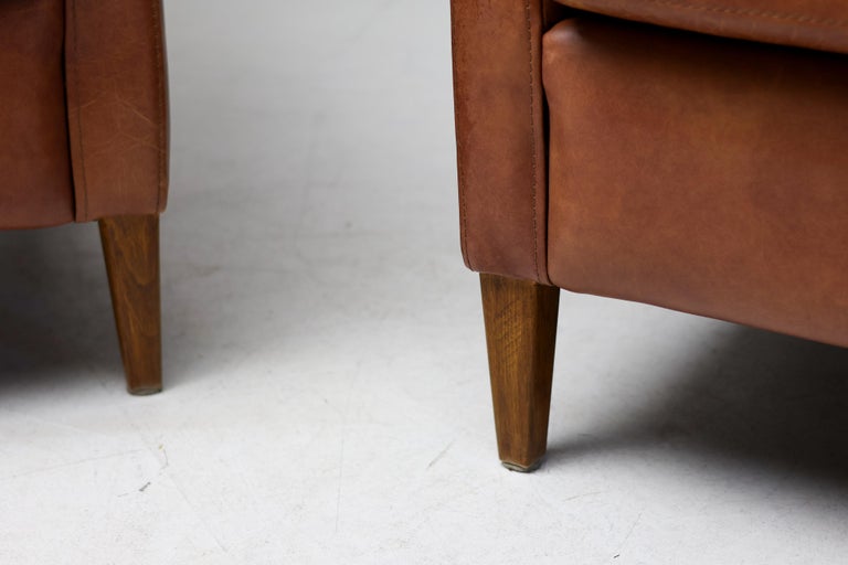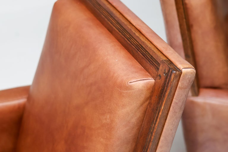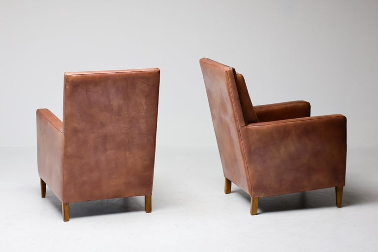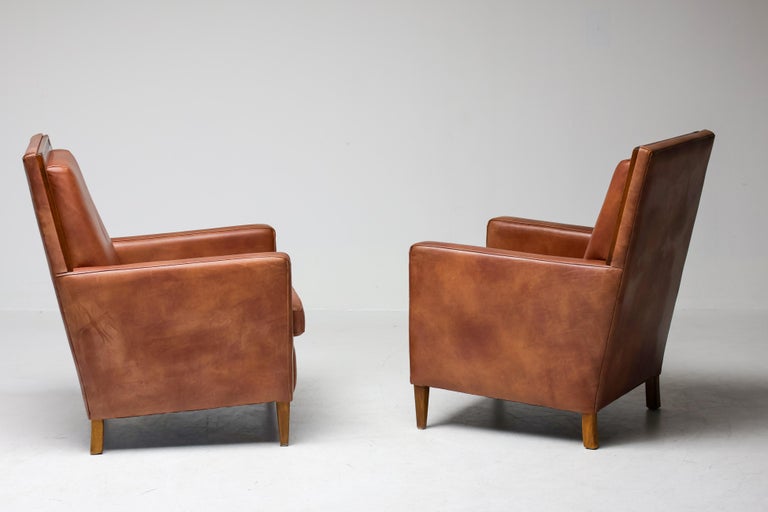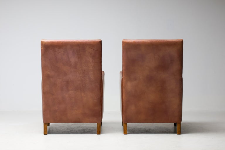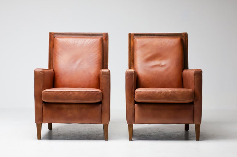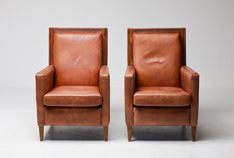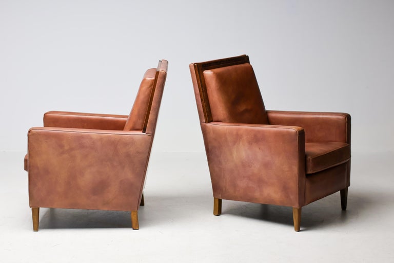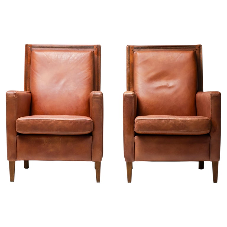 A striking pair of Art Deco–inspired armchairs crafted in the Netherlands during the 1970s, combining bold architectural lines with rich, tactile materials. These chairs reflect a later interpretation of the Art Deco aesthetic, where strong geometric forms are softened by warm tones and refined detailing. The chairs are upholstered in supple brown leather, offering both comfort and a handsome patina that enhances their vintage appeal. The proportions are generous and inviting, with a slightly reclined stance that makes them well-suited for lounge or reading settings. The contrast between the teak and the smooth leather surfaces creates a balanced and sophisticated visual presence. Both chairs remain in very good vintage condition, with light, age-appropriate wear consistent with use. The leather shows subtle signs of aging that contribute to their character. A distinctive and versatile pair, ideal for adding depth and character to mid-century, Art Deco, or eclectic interiors.