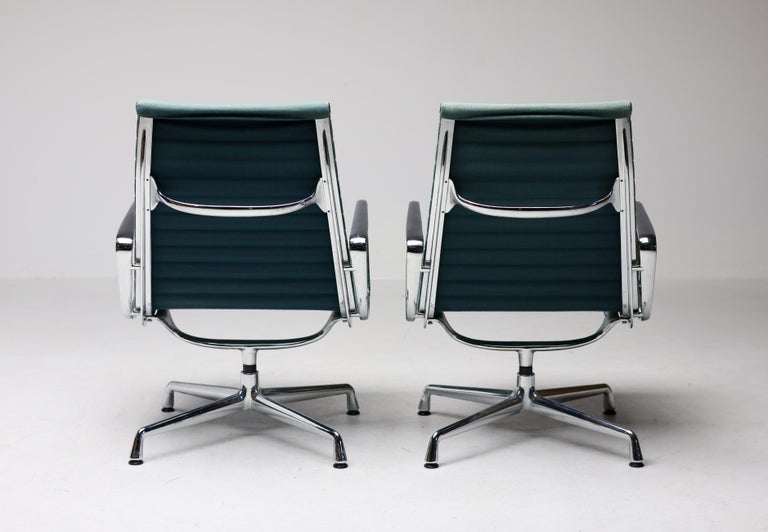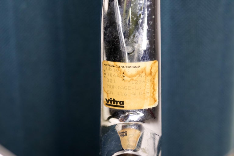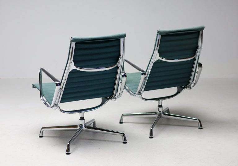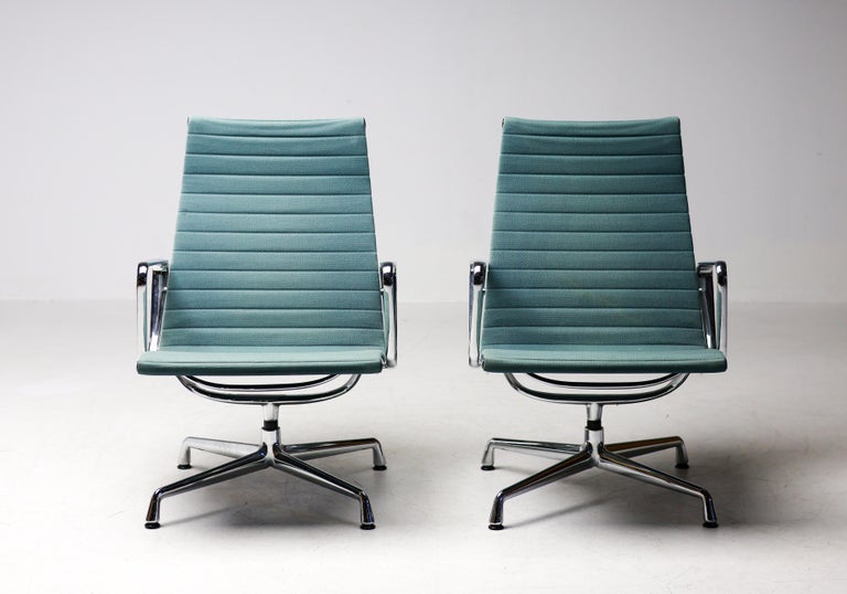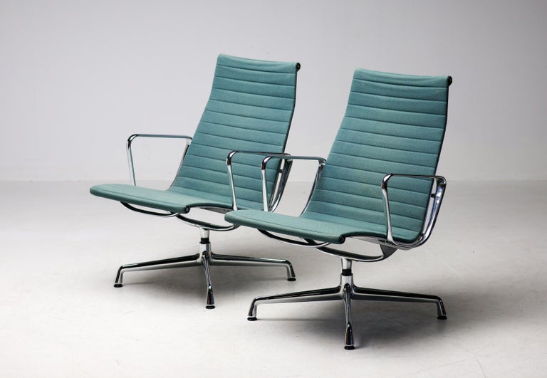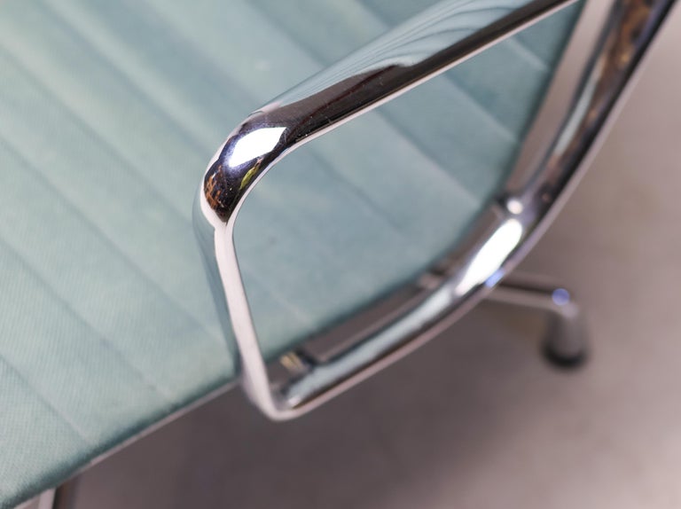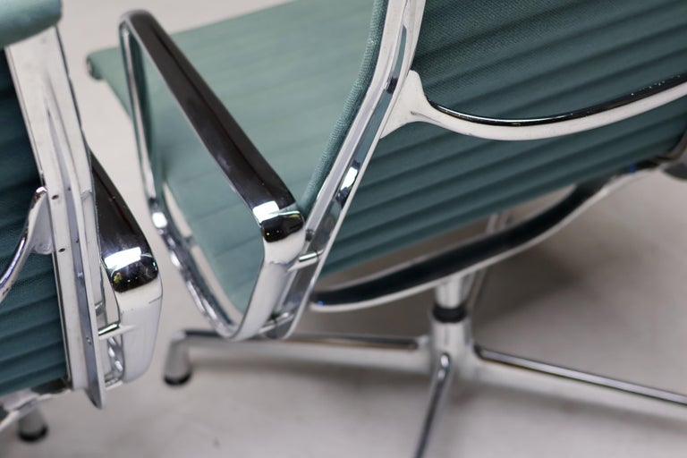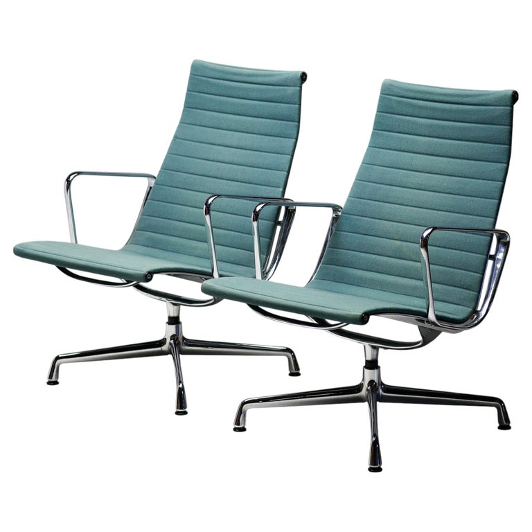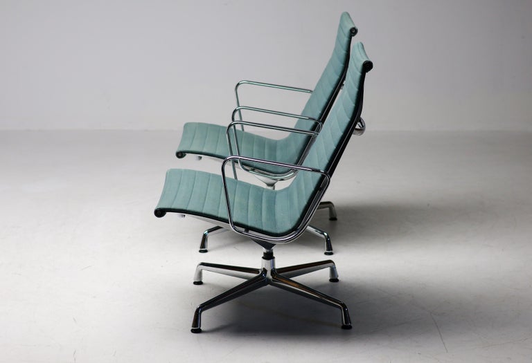 There is a particular honesty to an Eames chair that has been truly lived in. This pair of authentic Aluminum Group lounge chairs, produced by Vitra in 1990, wears its history on its sleeve. Dressed in the highly coveted Seafoam Green hopsak, they represent a specific moment in design manufacturing—when Vitra’s European execution brought a distinct palette and precision to the Eames’ timeless silhouette. These are not pristine collector’s pieces, and that is their charm. The fabric carries a sun-faded patina like well worn jeans. The original color has mellowed into a nuanced, almost coastal tone, with natural shading and gentle discoloration that speaks to years of faithful use. The die-cast aluminum frames have developed a softened lustre, with wear to the chrome that feels entirely appropriate—like a favorite leather jacket or a well-thumbed novel. Structurally, both chairs remain sound, with the iconic sling mechanism sitting at effortlessly relaxed angle. They are supremely comfortable, inviting you to settle in and add your own chapter to their story. No restoration has been attempted, and we feel none is required. For the collector who values authenticity over perfection, or the interior designer seeking an injection of genuine, unforced character, this pair offers something far rarer than showroom condition: a soul.