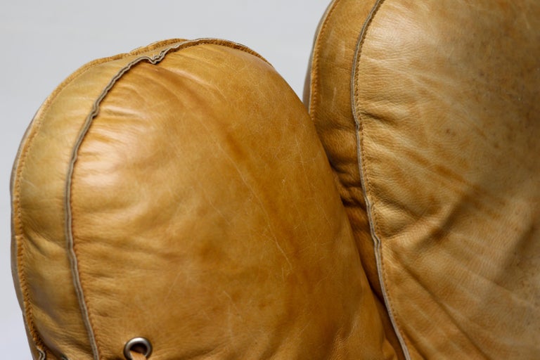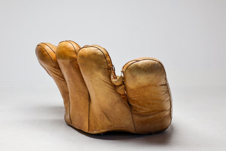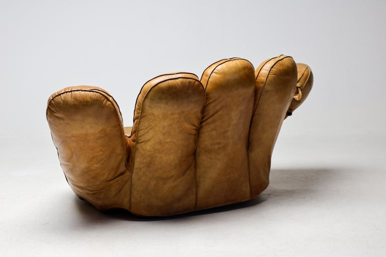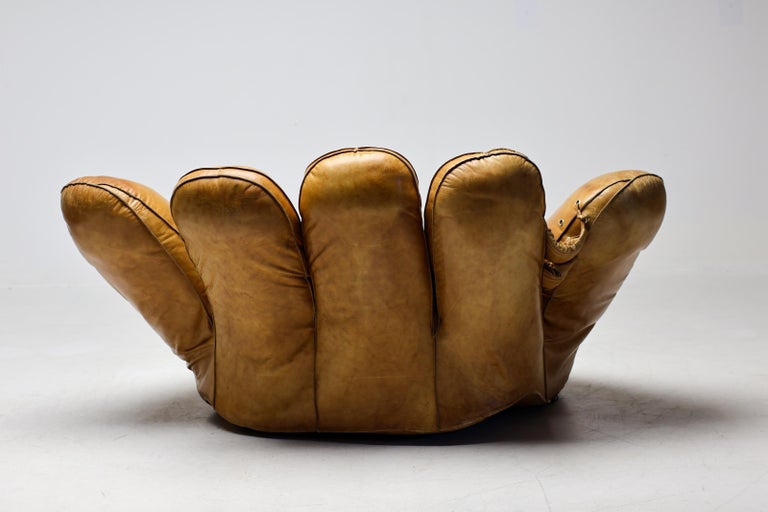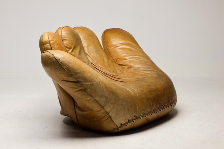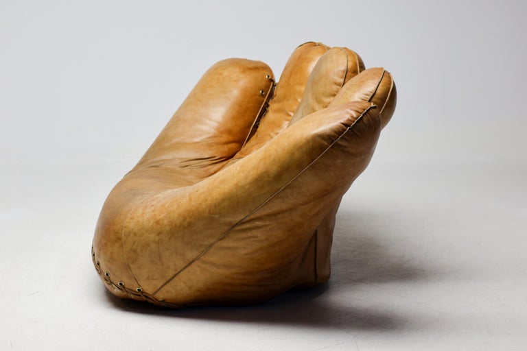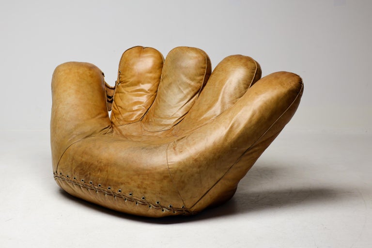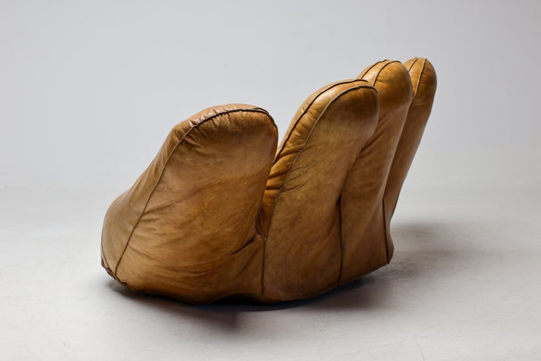 An icon of Anti-Design. Massive scale, natural brown leather, and the ultimate collector’s statement piece. The Icon. Few designs blur the line between brutalist sculpture and cozy refuge like the legendary “Joe” armchair. Designed in 1970 by De Pas, D’Urbino & Lomazzi for Poltronova, this piece was a radical homage to Joe Colombo—and a deliberate middle finger to the rigid, minimalist furniture of the era. Inspired by a well-worn baseball glove, it is part pop art, part architecture, and entirely unforgettable. This Piece. Offered here is a museum-quality vintage example from the 1970s, retaining the soulful patina only decades of honest character can provide. Upholstered in rich, natural brown leather, this chair has evolved into a deep, burnished cognac hue—softer and more nuanced than any modern reissue. The five massive, rounded slabs float like catcher’s mitts, cradling the sitter in a low, grounded, almost primal embrace. Condition. Vintage, excellent structural condition. The leather shows authentic signs of age: subtle graining, light surface marks, and a gorgeous worn-in softness that cannot be faked. No rips, tears, or odors. The original padded base is stable and sturdy. Why It Matters. This is not a chair for the timid. It is for the serious collector who wants a conversation piece that delivers physical comfort. In a world of mass production, the “Joe” chair remains a landmark of Italian radical design—equal parts humor, protest, and luxury. Dimensions: · Height: 35 in. (89 cm) · Width: 55 in. (140 cm) · Depth: 39 in. (99 cm) · Seat Height: 13 in. (33 cm) Shipping: Freight shipping available worldwide. Crating included.