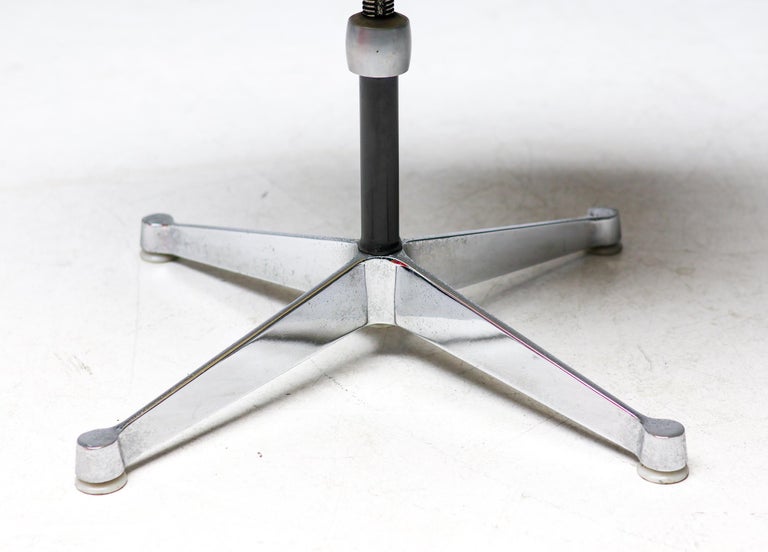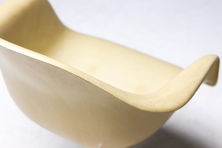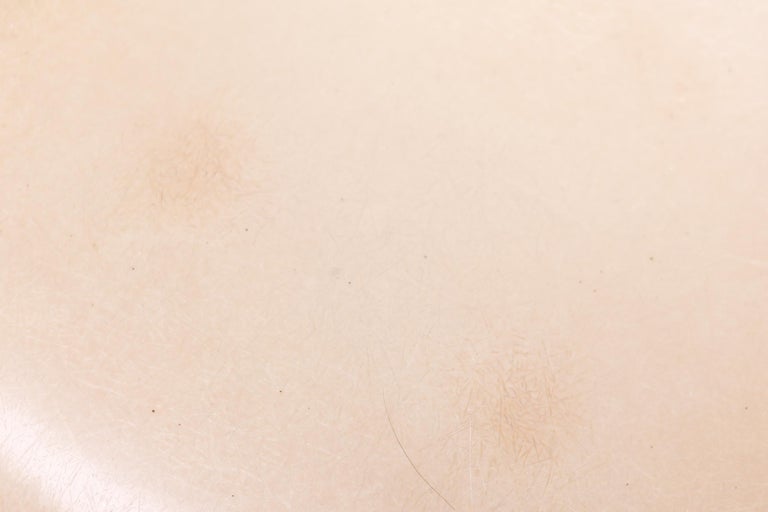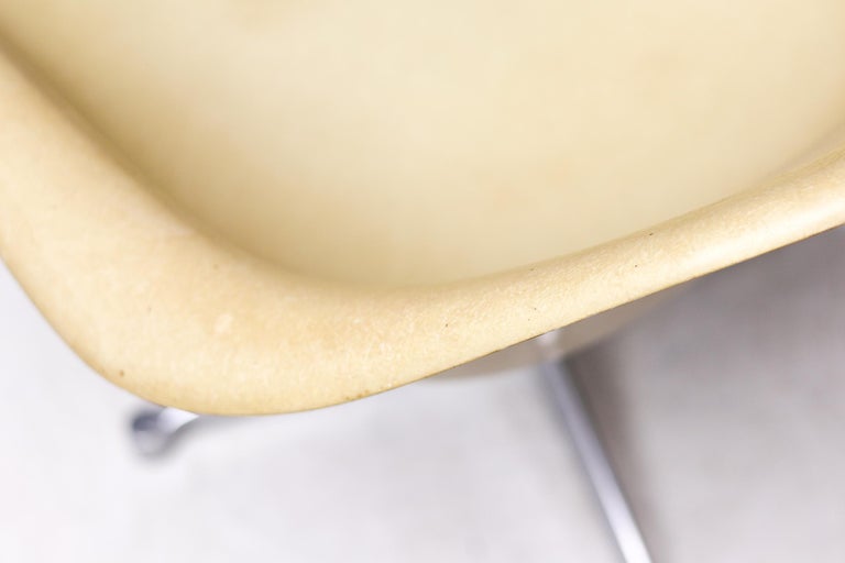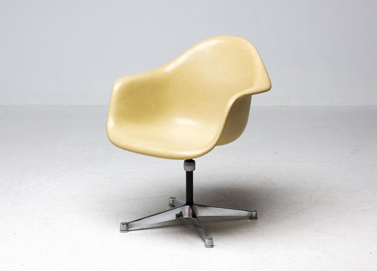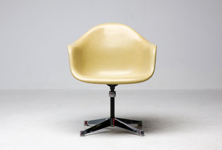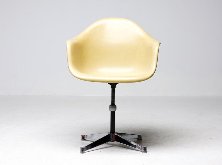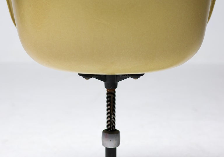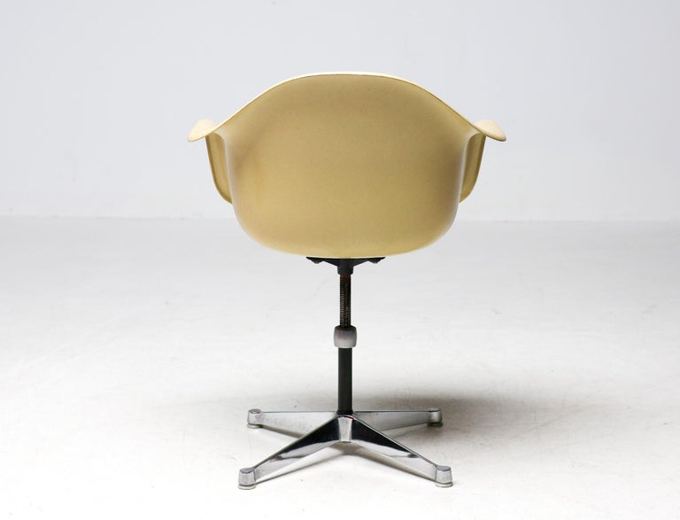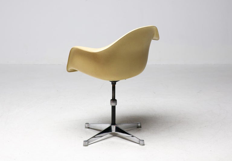 Swiveling parchment fiberglass arm chair designed by Charles and Ray Eames for Herman Miller. Original desirable 1960s version. Swiveling and height adjustable, marked Herman Miller under the seat.