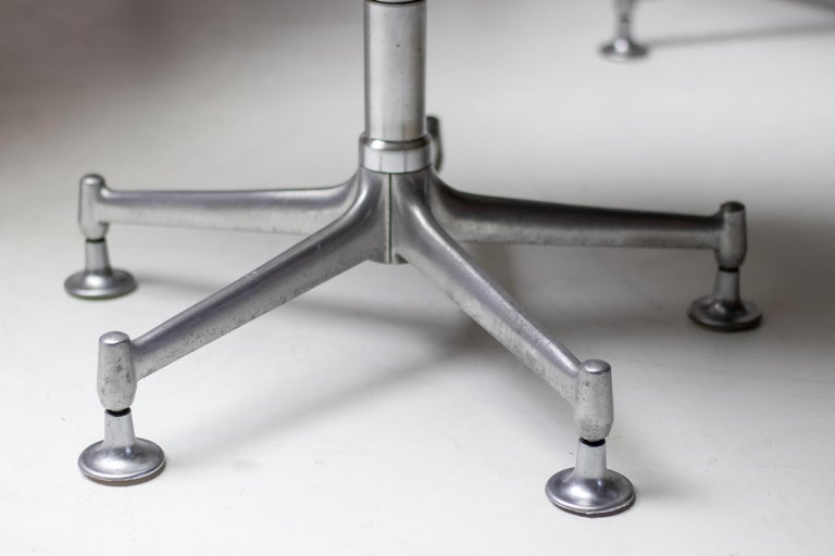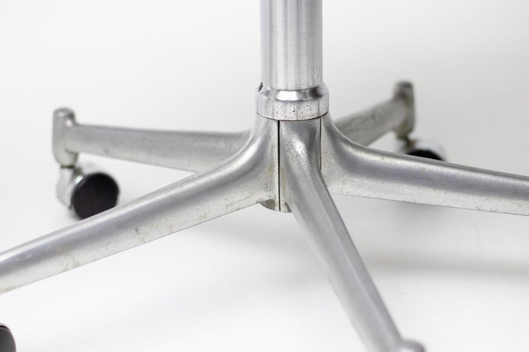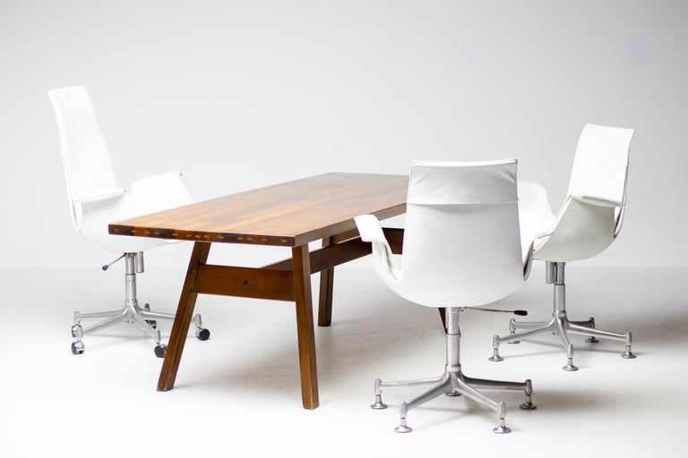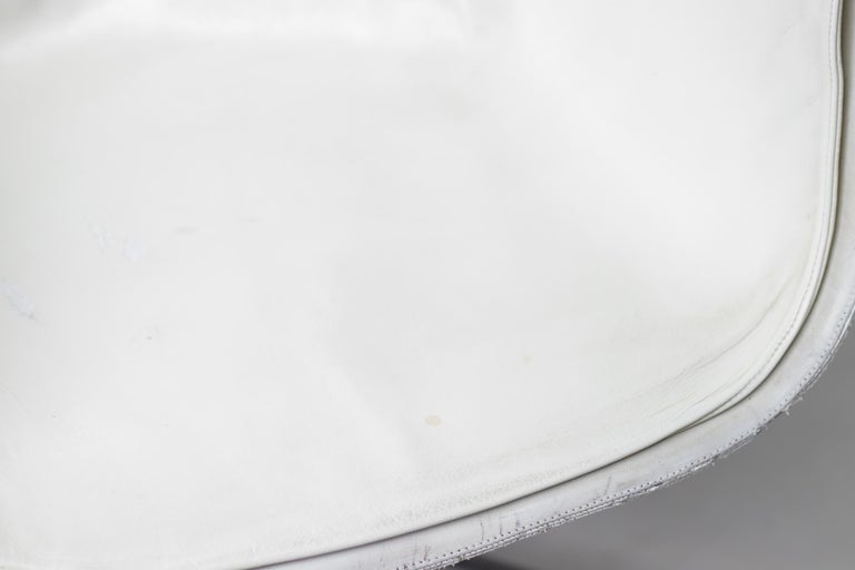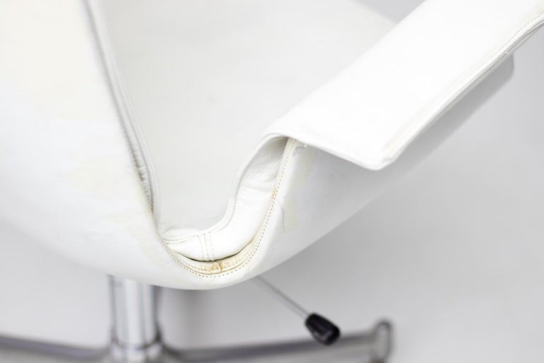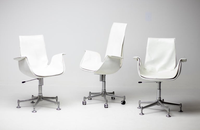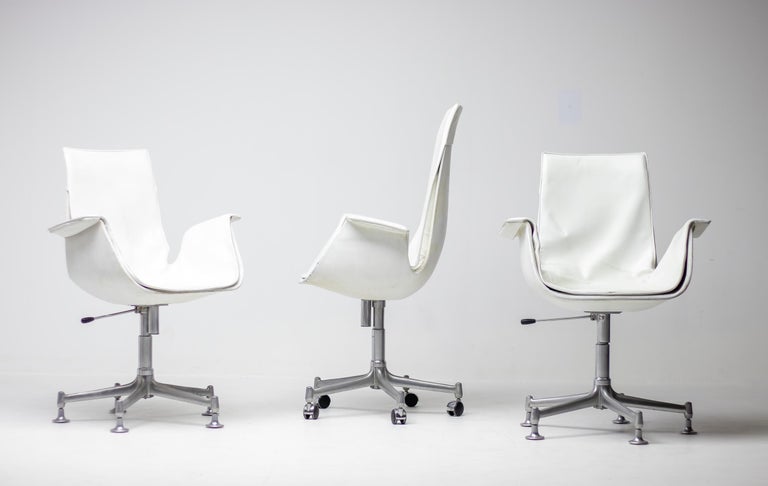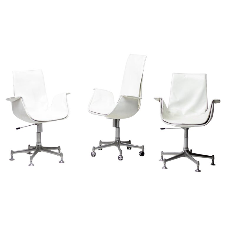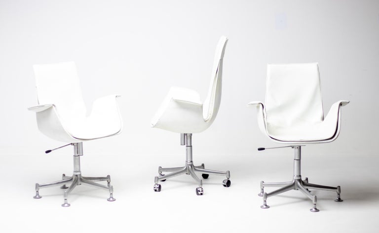 1960’s matching set of 3 Bird Chairs by designed by Preben Fabricius and Jørgen Kastholm for the original manufacturer Alfred Kill International. Two chairs are the low-back version and one chair the high-back version of the Model FK 6727 ‘Bird’ Chair, also commonly referred to as the ‘Tulip’ chair. All 3 chairs have the very rare and desirable option of tilt, swivel and height adjustability. The high chair is equipped with castors, the 2 low chairs have glides. The chairs are marked with the Kill label. They are built from a fiberglass shell which is encased with original bright white leather upholstery that features a subtle admirable patina. These traces of age and use bring more vibrancy to the chairs This set of ‘Bird’ chairs would be a perfect addition to any collector or design lovers interior concept. Priced as a set.