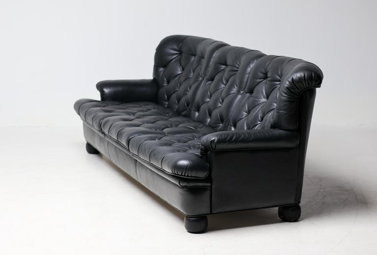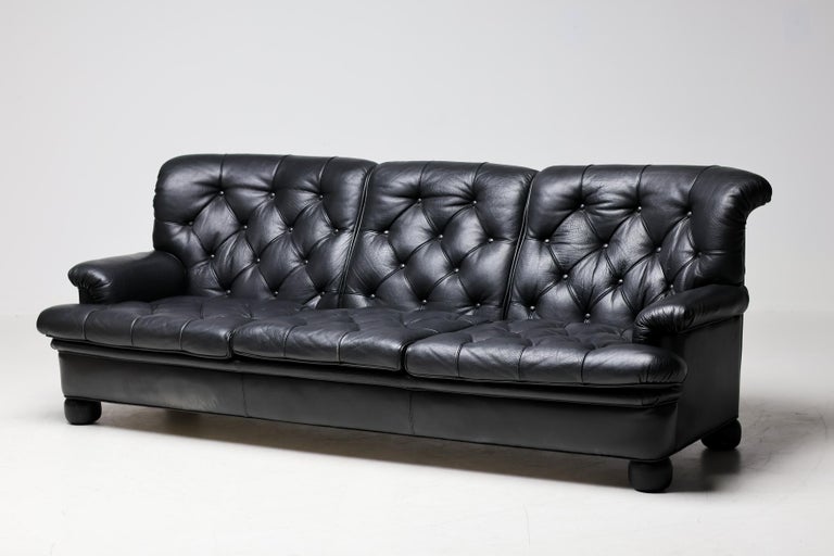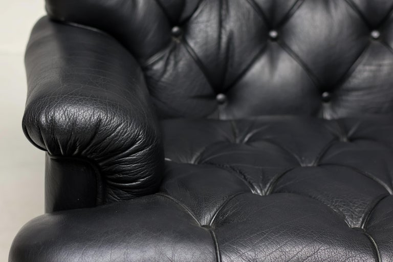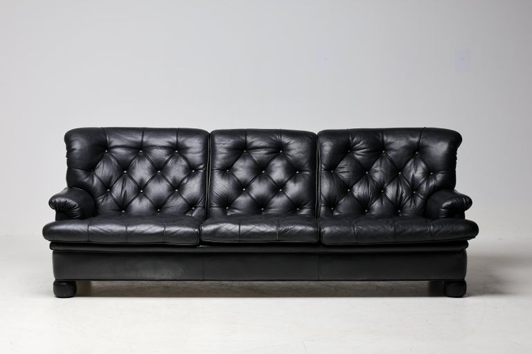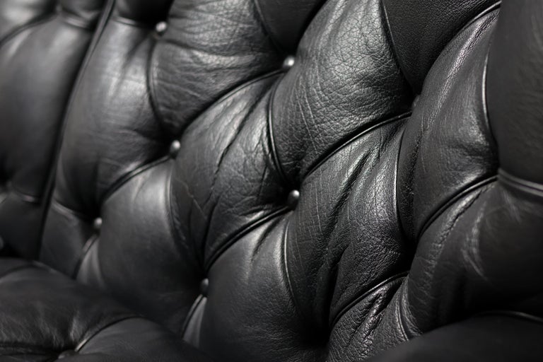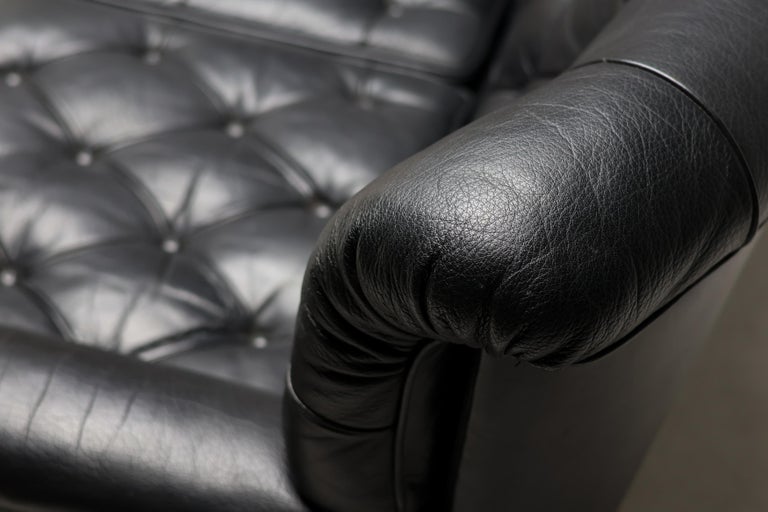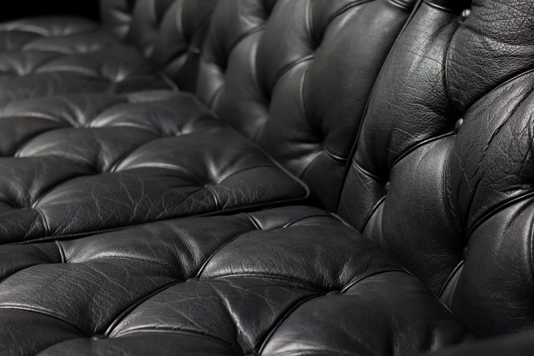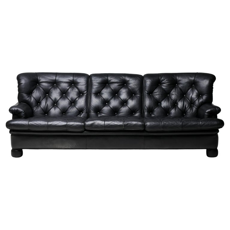 A striking example of Scandinavian modern luxury, this “Jupiter” three-seater sofa by Arne Norell combines the timeless appeal of the Chesterfield form with Norell’s signature emphasis on comfort, craftsmanship, and sculptural elegance. Upholstered in sumptuous black leather, the sofa features the classic deep-buttoned back and gently rolled arms, softened by generous proportions for relaxed seating. The “Jupiter” sofa is distinguished by its precise tailoring, reflecting Norell’s attention to structural clarity and human-centered design. The rich patina of the leather enhances its tactile presence while demonstrating the enduring quality of the materials. Designed for both intimate and grand interiors, the sofa seamlessly balances visual weight with a sense of lightness, making it a versatile centerpiece for living rooms, libraries, or refined office settings. Its combination of sculptural form, exceptional comfort, and mid-century Scandinavian craftsmanship makes it a highly collectible design classic. Designer: Arne Norell Model: Jupiter Origin: Sweden Materials: Black leather, solid beech frame Condition: Very good vintage condition, with minor wear consistent with age and use A refined, enduring design that exemplifies Norell’s mastery in marrying functional comfort with sculptural sophistication.