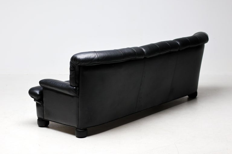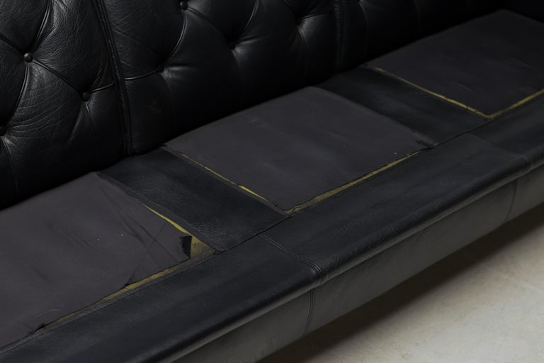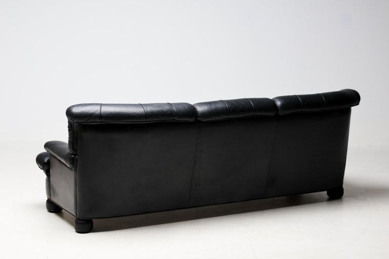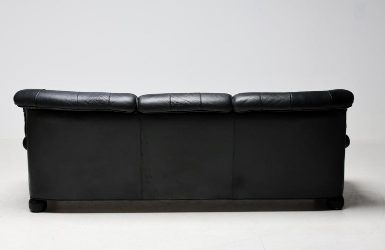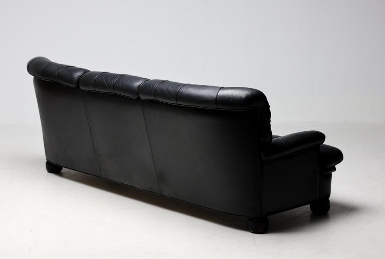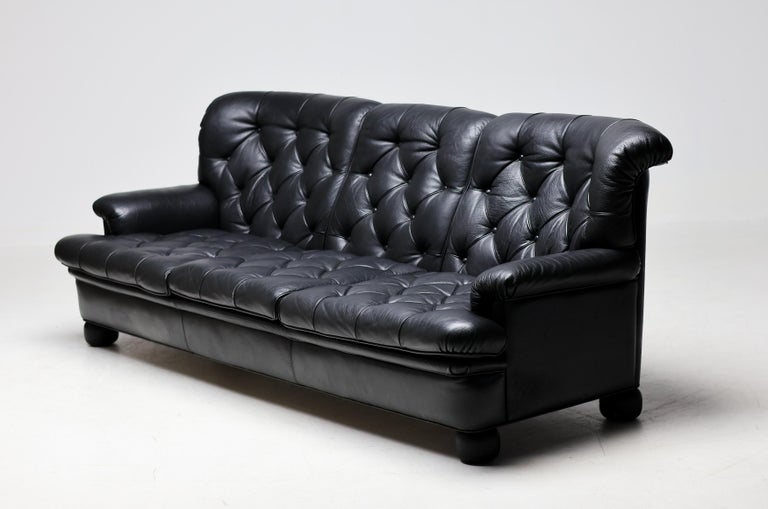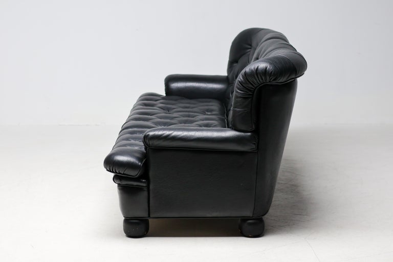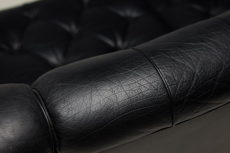 A striking example of Scandinavian modern luxury, this “Jupiter” three-seater sofa by Arne Norell combines the timeless appeal of the Chesterfield form with Norell’s signature emphasis on comfort, craftsmanship, and sculptural elegance. Upholstered in sumptuous black leather, the sofa features the classic deep-buttoned back and gently rolled arms, softened by generous proportions for relaxed seating. The “Jupiter” sofa is distinguished by its precise tailoring, reflecting Norell’s attention to structural clarity and human-centered design. The rich patina of the leather enhances its tactile presence while demonstrating the enduring quality of the materials. Designed for both intimate and grand interiors, the sofa seamlessly balances visual weight with a sense of lightness, making it a versatile centerpiece for living rooms, libraries, or refined office settings. Its combination of sculptural form, exceptional comfort, and mid-century Scandinavian craftsmanship makes it a highly collectible design classic. Designer: Arne Norell Model: Jupiter Origin: Sweden Materials: Black leather, solid beech frame Condition: Very good vintage condition, with minor wear consistent with age and use A refined, enduring design that exemplifies Norell’s mastery in marrying functional comfort with sculptural sophistication.