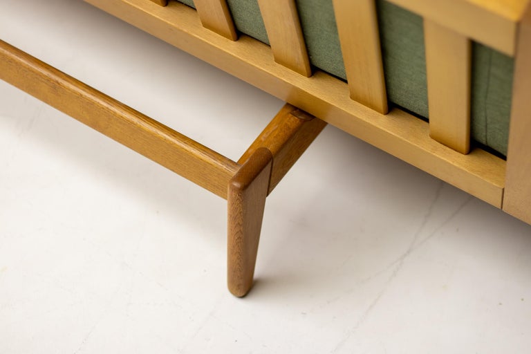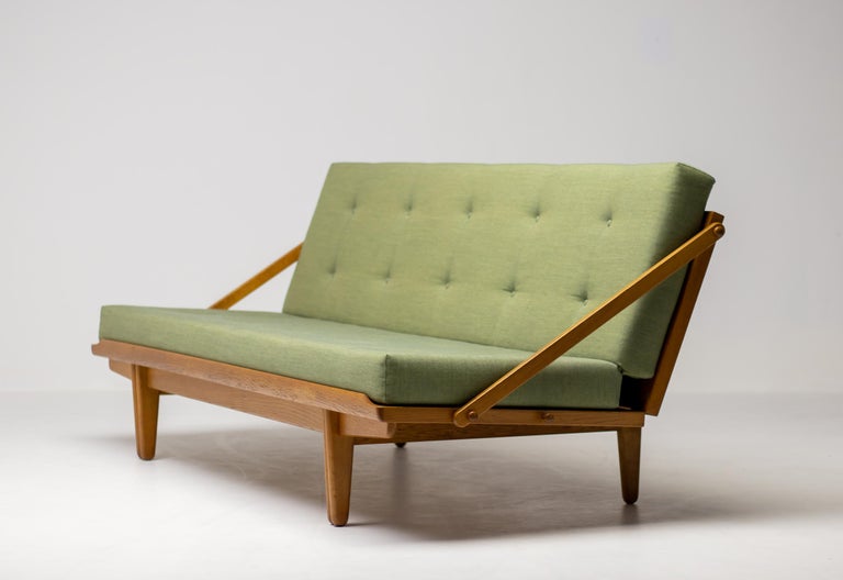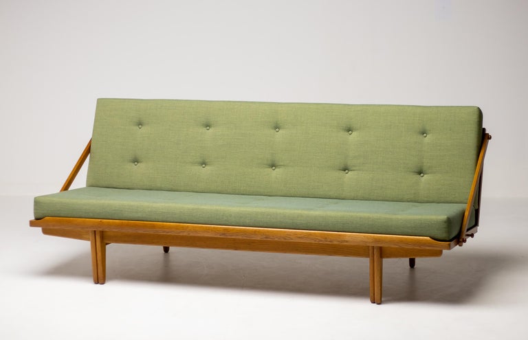 Very nice sophisticated daybed sofa Model 981 designed by Poul Volther, manufactured by Gemla, Denmark, circa 1960. This sofa is nicknamed ‘Diva’ and features a sophisticated solid oak base that can be folded down to create a daybed. The sofa is recently upholstered with beautiful moss green Kvadrat fabric. The oak frame is in excellent all original condition. Poul M. Volther was a Danish furniture designer who is remembered above all for his iconic Corona Chair. First trained as a cabinetmaker, Volther studied furniture design at the Arts and Crafts School in Copenhagen. A believer in Functionalism, he avoided short-lived aesthetic trends, concentrating on the simple crafting of quality materials. With the support of designer Hans Wegner, he was employed from 1949 by the cooperative FDB Møbler, working in their design studio under the leadship of Børge Mogensen.