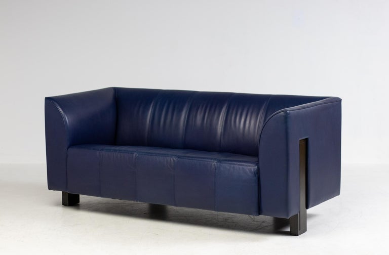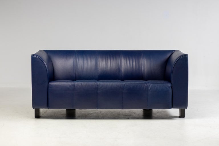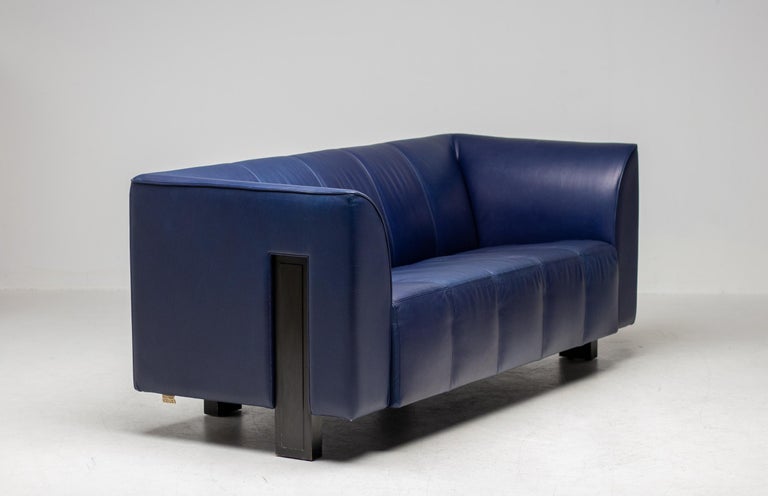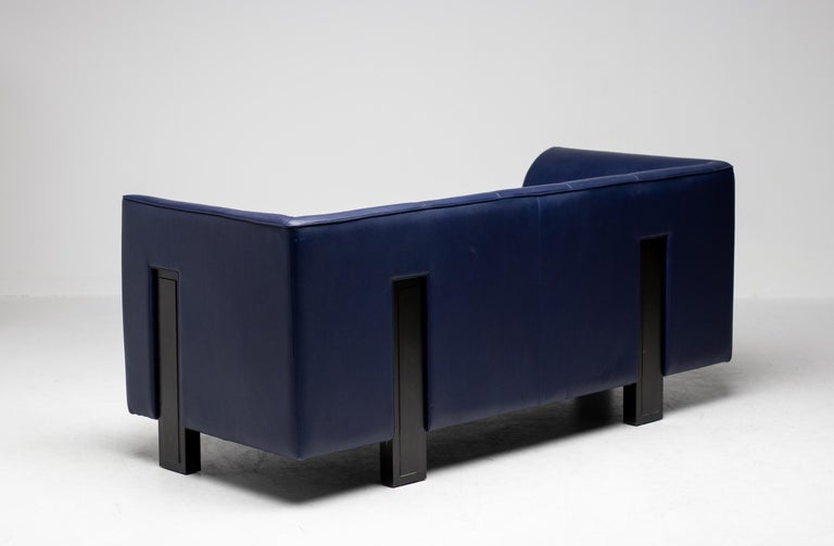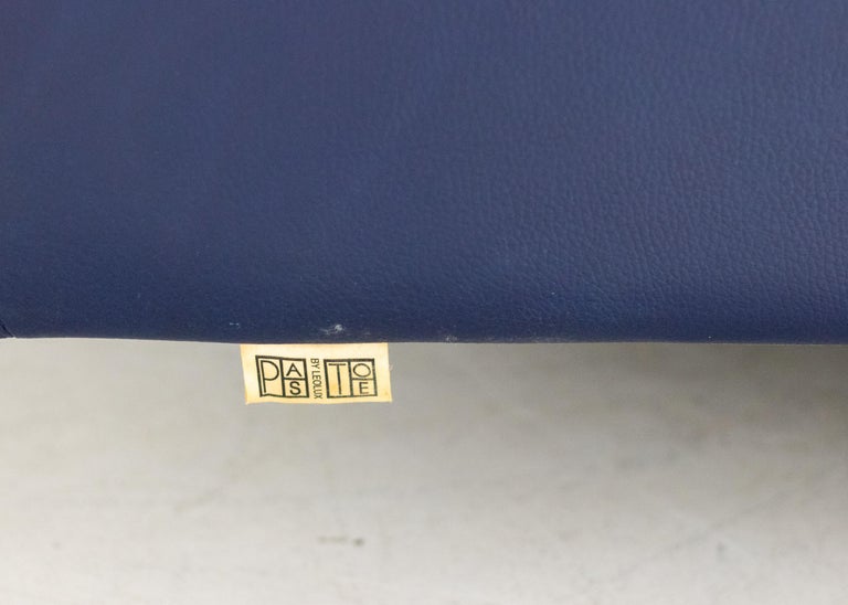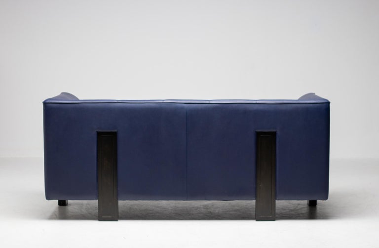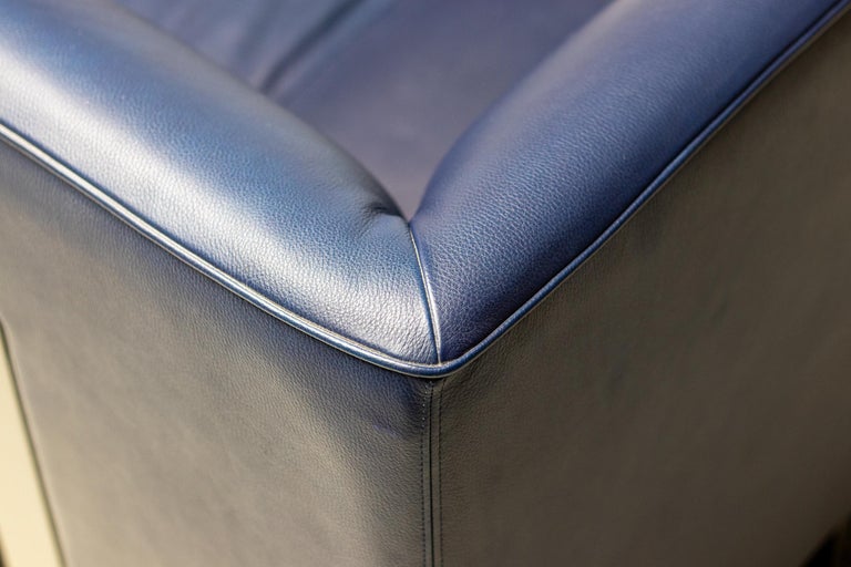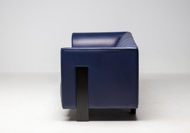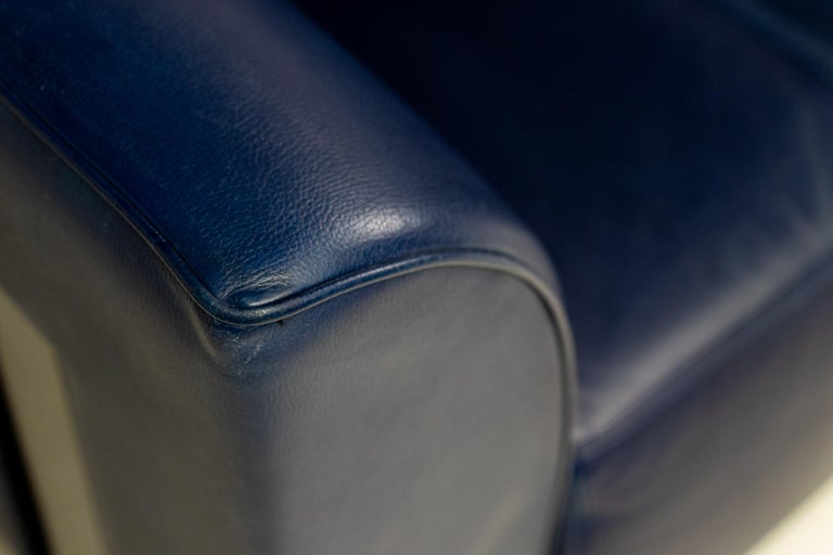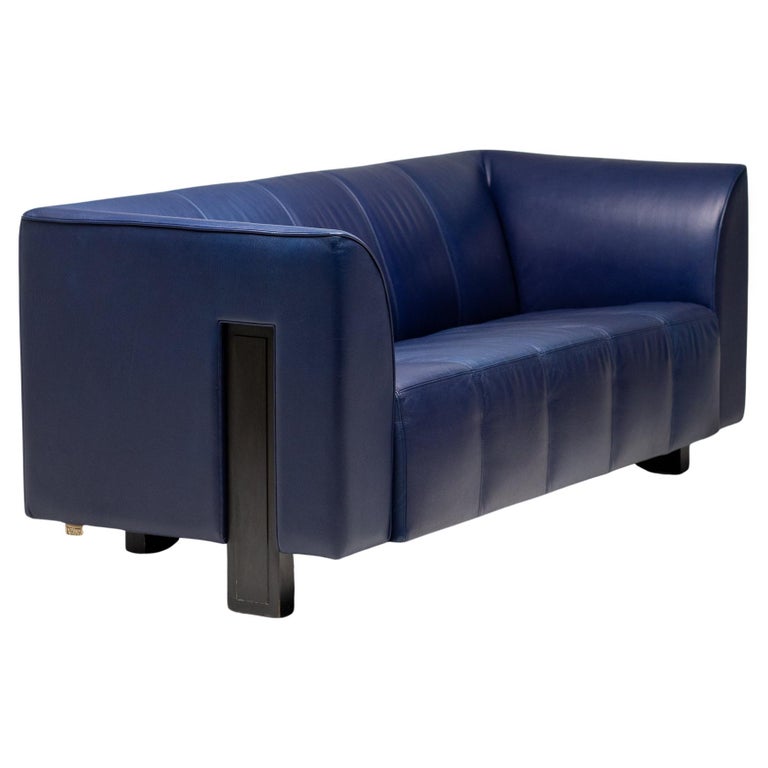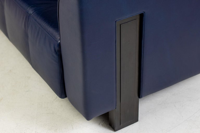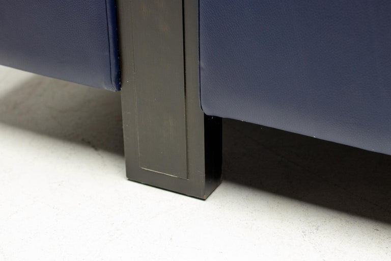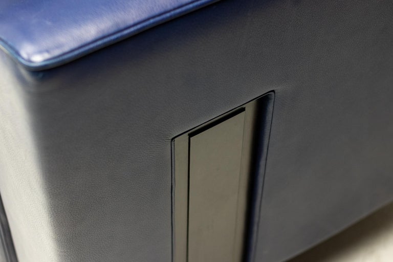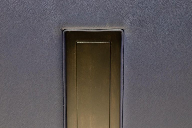 A rare and important example of late 20th-century Japanese design, this indigo blue leather ‘ISU’ sofa was designed by Shigeru Uchida in 1995 and produced by Dutch manufacturer Pastoe. Uchida’s minimalist sensibility is beautifully paired with Pastoe’s craftsmanship in a piece that is both sculptural and understated. The sofa features its original indigo blue leather upholstery—a highly uncommon and sought-after colorway—paired with a distinctive black anodized aluminum frame. The monumental aluminum legs emphasize the sofa’s clean lines and low, elegant profile, while the gently curved arms and generous seating reflect Uchida’s refined approach to comfort and proportion. The piece retains its original Pastoe label, confirming authenticity. It is well-preserved with appropriate patina and excellent structural integrity. Works from Uchida’s ISU series seldom surface on the market, especially in this condition, finish, and color. An exceptional acquisition for collectors of Japanese modernism and notable 20th-century furniture, this Uchida for Pastoe ISU sofa offers both visual clarity and enduring sophistication.
