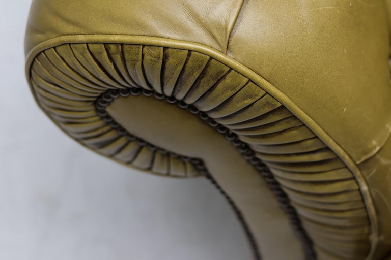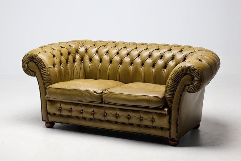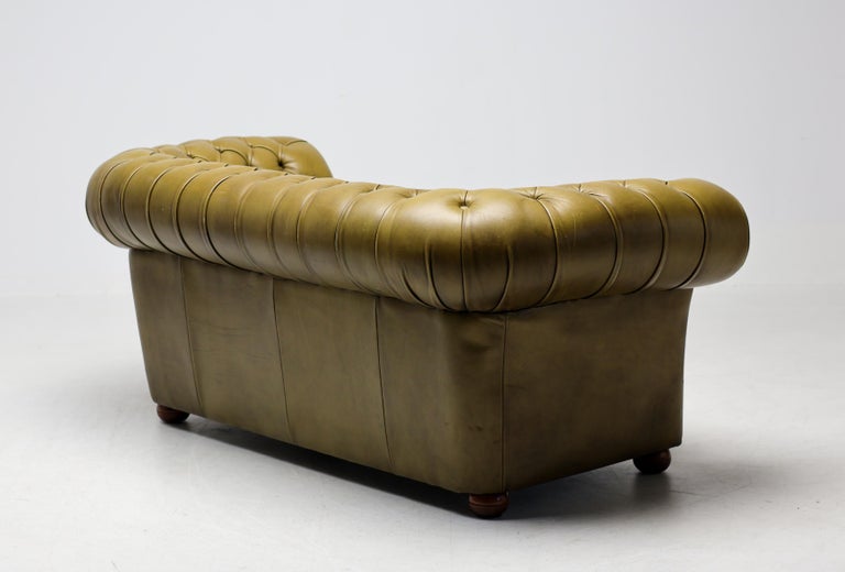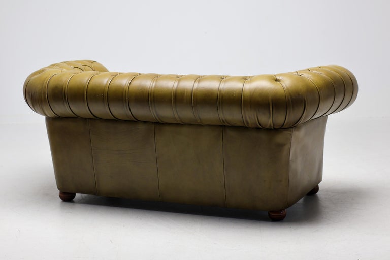 Timeless, sophisticated, and steeped in character—this vintage Chesterfield sofa in rich green leather embodies classic British design at its finest. The deep button tufting, rolled arms, and low profile capture the iconic silhouette that has made the Chesterfield a symbol of elegance for centuries. The supple leather has developed a beautiful patina, highlighting its history while adding warmth and depth to any interior. Solidly constructed with generous proportions, this piece offers both enduring comfort and unmistakable style. Perfect for a study, library, or statement living room, this Chesterfield pairs effortlessly with traditional, eclectic, or modern decor. Its distinctive green hue sets it apart from the more common browns, making it a true conversation piece. Details: Period: Vintage Upholstery: Genuine leather, deep button tufted Color: Seafoam green with natural patina Condition: Excellent vintage condition with minor wear consistent with age Style: English, Chesterfield This sofa is more than just seating—it’s a piece of history, ready to anchor your space with character and charm.