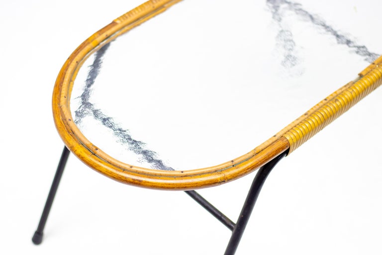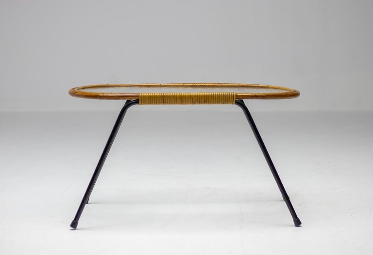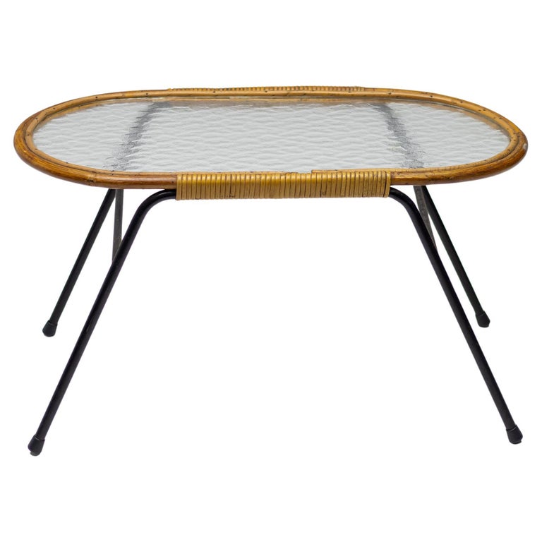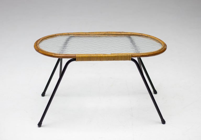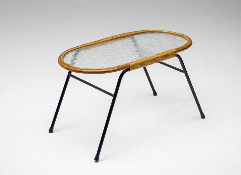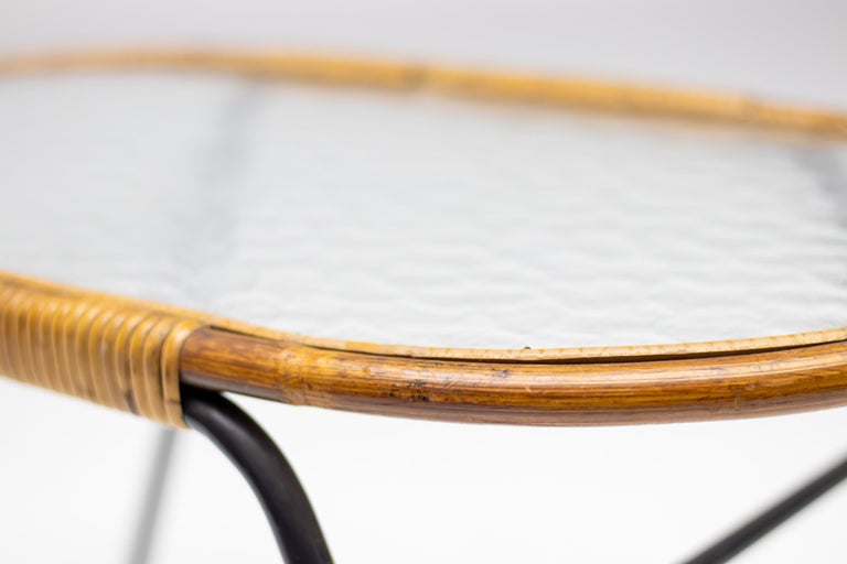 Dirk van Sliedregt oval side table with textured glass and rattan for Rohé Noordwolde, The Netherlands. Beautiful minimalistic Dutch Mid-Century Modern table. Dirk van Sliedregt (1920 – 2010) combined his work as a furniture designer with his work as a teacher at Dutch art schools, including the Academy of Enschede and the Rietveld Academy. After 1945 he started experimenting with rattan and subsequently developed some chairs that were soon noticed by the Gebroeders Jonkers furniture factory in Noordwolde. Initially, they were made entirely of rattan, but from 1952, however, often in combination with a metal tubular frame. Van Sliedregt’s designs excel in their apparent simplicity, but on closer inspection they are extremely complicated.