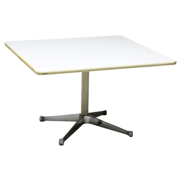 Contract Base side table, designed by Charles & Ray Eames. Early version in chrome-plated aluminium, made by Herman Miller. White laminate tabletop. This side table was part of a huge collection of modern design furniture and art. The owners were avid modern art collectors, most of their art collection was granted to important modern art museums in The Netherlands.