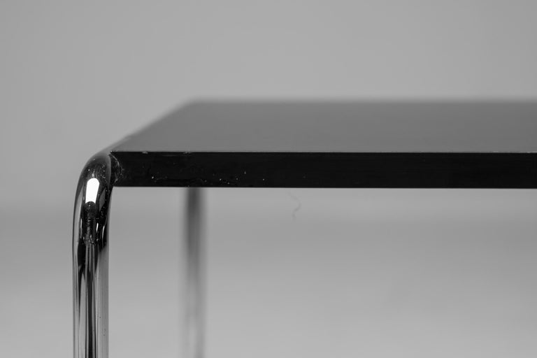 A rare early production side table designed by Marcel Breuer and manufactured by Gavina, Italy, circa 1960. This elegant piece captures Breuer’s iconic blend of functional clarity and modernist refinement. The table features a beautifully proportioned chromed tubular steel frame, a hallmark of Breuer’s Bauhaus vocabulary, paired with a black laminate top. Its light, architectural presence allows it to sit effortlessly within a variety of interiors—modern, minimalist, eclectic, or mid-century inspired. Early Gavina examples such as this are increasingly sought after for their craftsmanship, authenticity, and historical importance. The table retains its original vintage character, with gentle signs of age consistent with careful use. Details: • Designer: Marcel Breuer • Manufacturer: Gavina • Origin: Italy • Year: c. 1960 • Materials: Chromed tubular steel; black laminate top • Condition: Good vintage condition with minor wear and surface rust consistent with age A refined and collectible Breuer work—perfect as a side table, bedside table, or standalone accent piece.