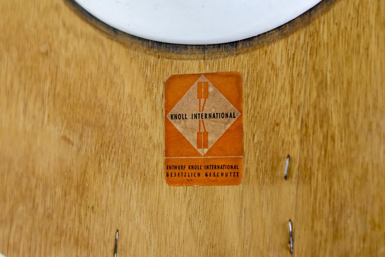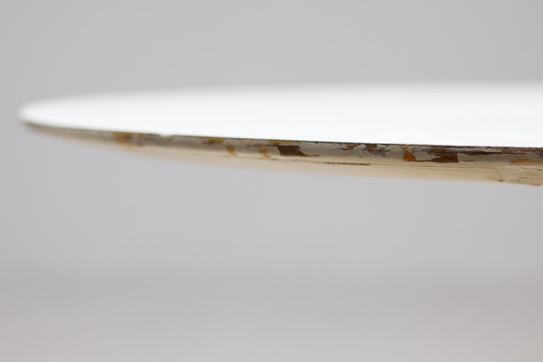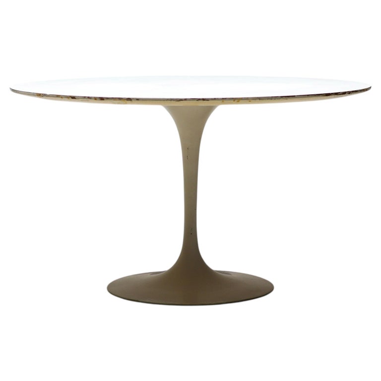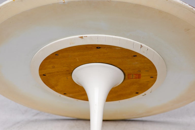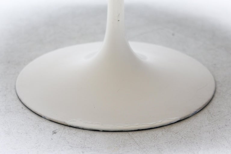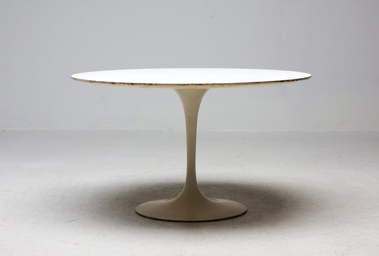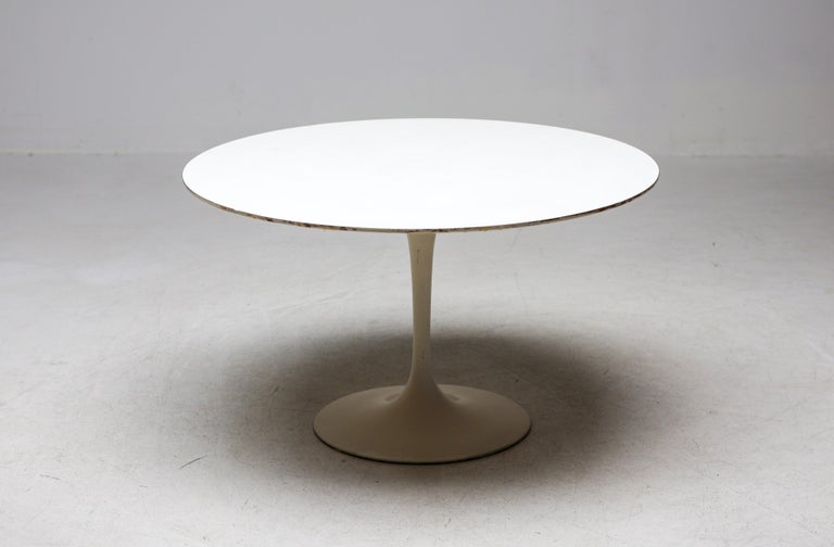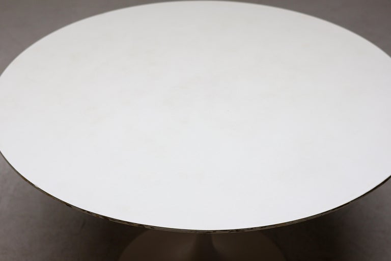 An enduring icon of modern design, the Saarinen Round Tulip Pedestal Coffee Table by Knoll embodies Eero Saarinen’s visionary effort to eliminate the “slum of legs” beneath traditional tables. The result is a sculptural, fluid form that remains as relevant today as at the time of its introduction. This example is presented as a coffee or center table, featuring a 90 cm diameter white laminate top paired with the signature cast aluminum pedestal base in a matching white finish. Its compact proportions and clean, seamless silhouette create a sense of openness and visual lightness, making it an ideal centerpiece for a living room or lounge setting. The durable laminate surface offers practicality for everyday use, while the elegant single pedestal base allows for flexible placement and unobstructed seating around the table. The table remains in nice vintage condition, showing age-appropriate wear consistent with careful use as shown in the photos. It retains its strong visual appeal and structural integrity. Marked with label. A timeless and highly recognizable design piece, perfect for collectors and enthusiasts of mid-century modern interiors.