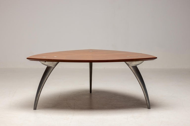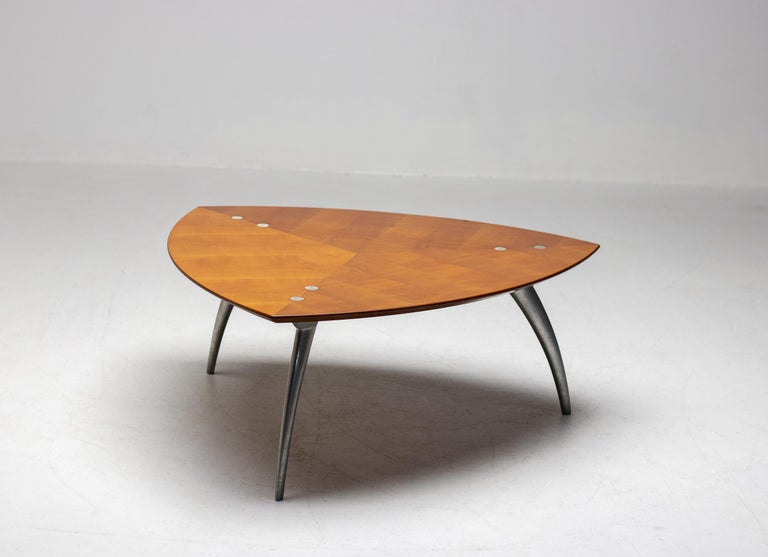 Striking, sculptural, and unmistakably contemporary, this “Tucano” coffee table by renowned French designer Marc Berthier exemplifies his playful yet impeccably considered approach to form. Produced in the 1990s, the piece balances bold geometry with a light, graphic presence—making it an ideal focal point for modern interiors. The table’s dynamic silhouette recalls Berthier’s signature design language: clean lines, refined curves, and a thoughtful interplay of structure and surface. Its minimalist architectural frame supports a generously sized top, creating both functional workspace and visual impact. A highly collectible work from a designer celebrated for contributions to European industrial design, the “Tucano” table is increasingly sought after by enthusiasts and curators of postmodern and late-20th-century design. Details: • Designer: Marc Berthier • Model: Tucano • Period: 1990s • Materials: bookmatched cherry veneer top, cast aluminum legs • Condition: Very good vintage condition with light wear consistent with age A standout piece that brings personality, sophistication, and a touch of playful modernism to any living space.