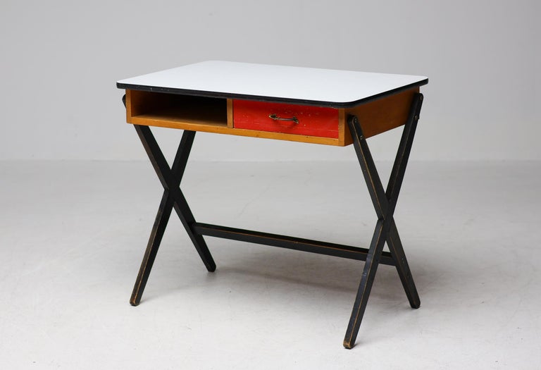 Beautiful designed, original Mid-Century Modern petite writing desk with black dye birch X-base, red dye birch drawer and a formica top. Coen de Vries is among the Dutch pioneers of Industrial Design. Many of Coen de Vries’ practical designs were recommended by Goed Wonen (Good Living) a Dutch 50’s interior magazine. Great vintage all original condition.
